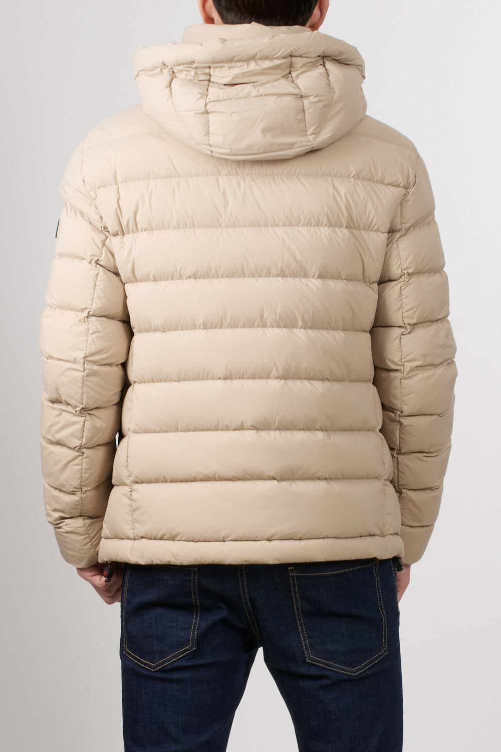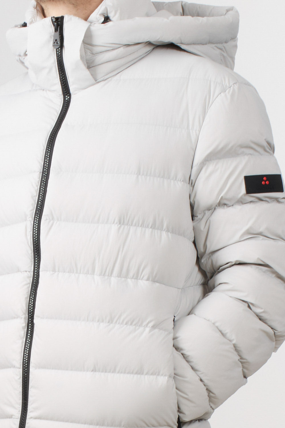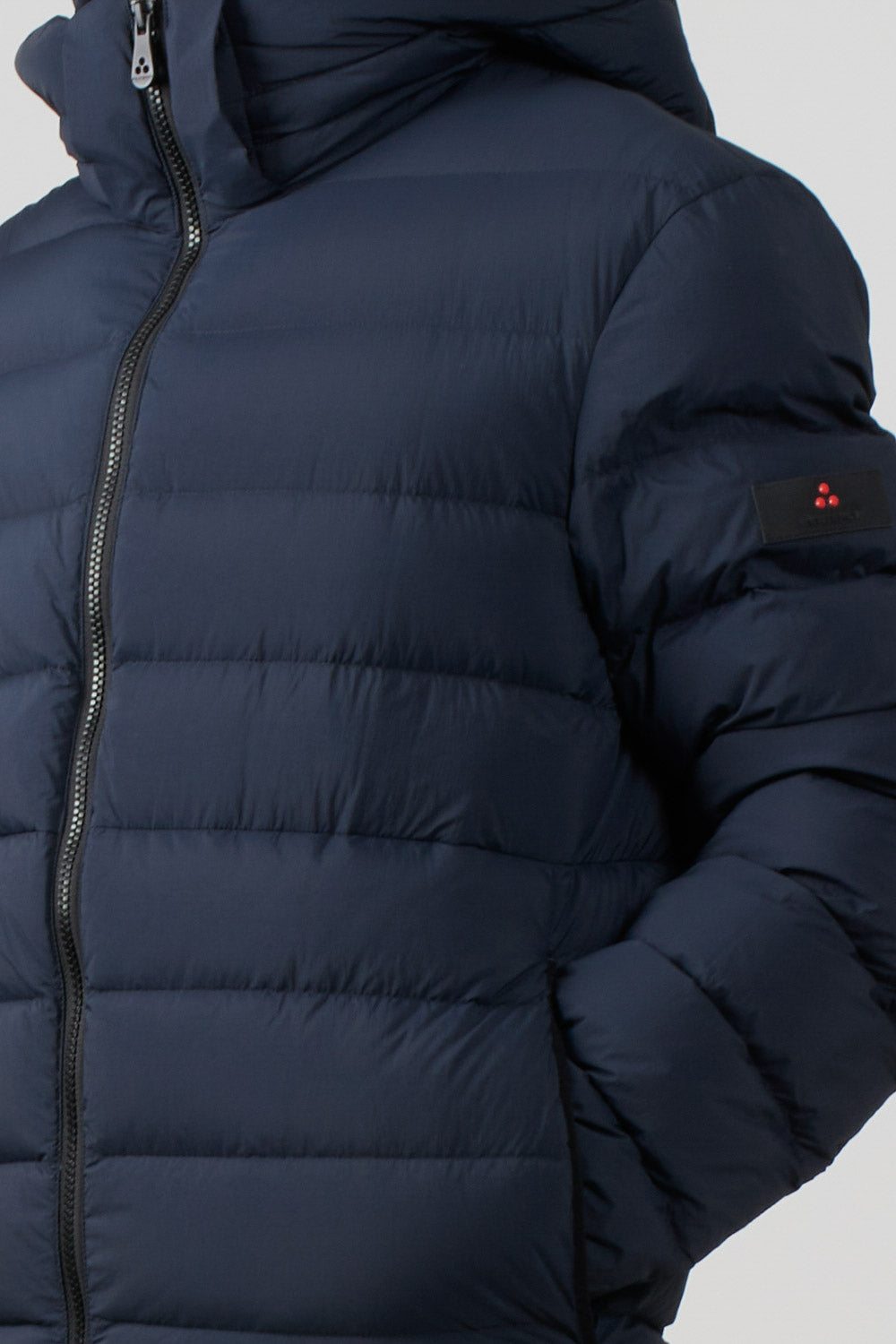 Boggs jacket featuring a semi-opaque surface and horizontal quilting that enhances the essential line of the garment, natural down padding, water repellent and down proof fabric, high collar, central double-slider zip, invisible side pockets and windproof cuffs.