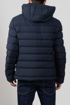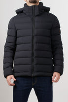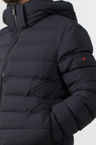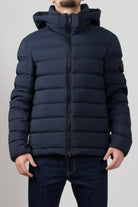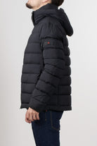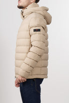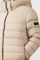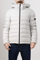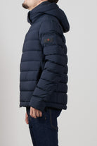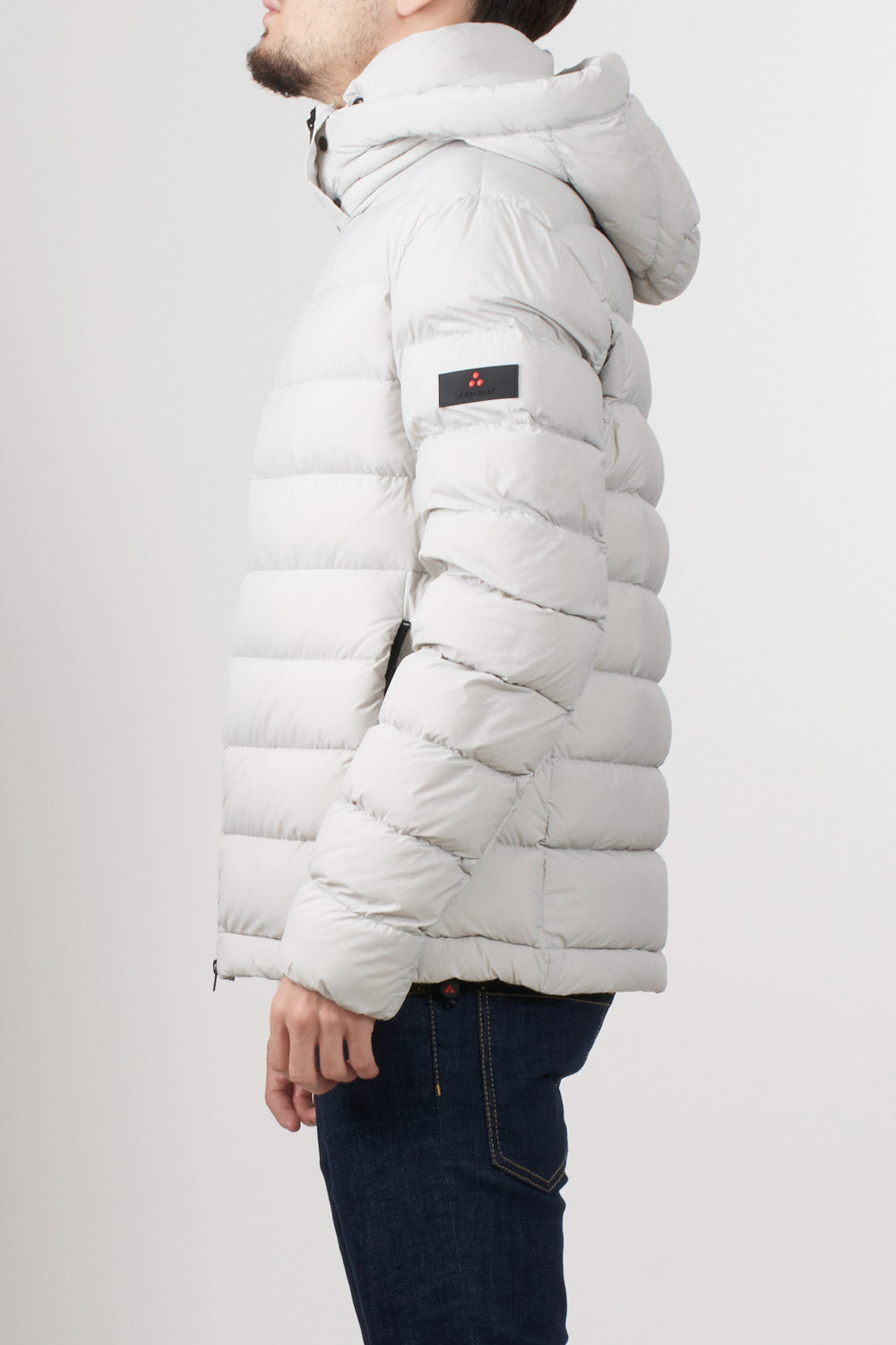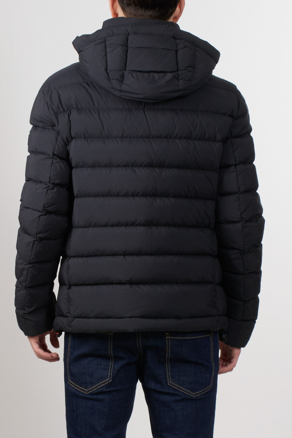 Boggs jacket featuring a semi-opaque surface and horizontal quilting that enhances the essential line of the garment, natural down padding, water repellent and down proof fabric, high collar, central double-slider zip, invisible side pockets and windproof cuffs.