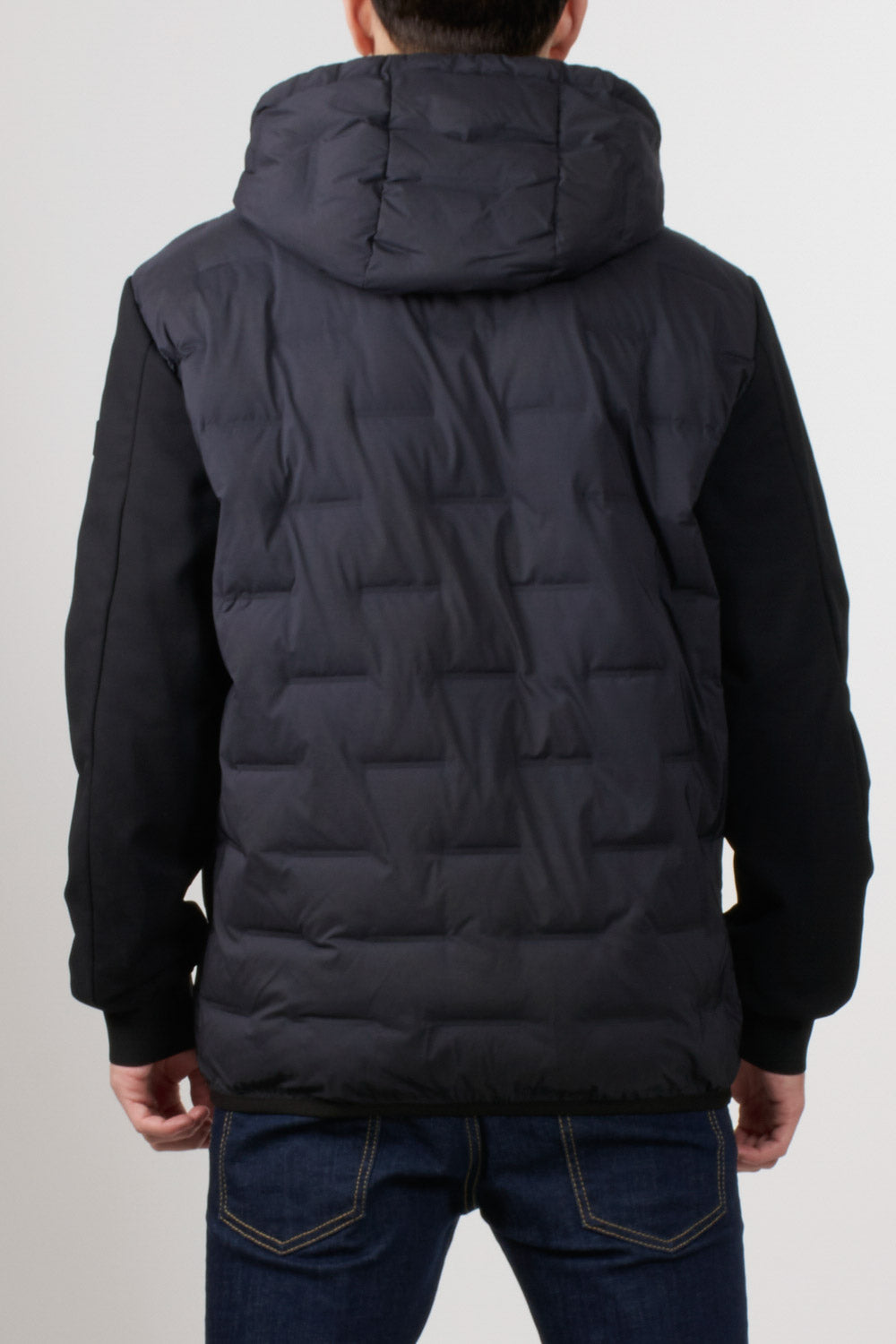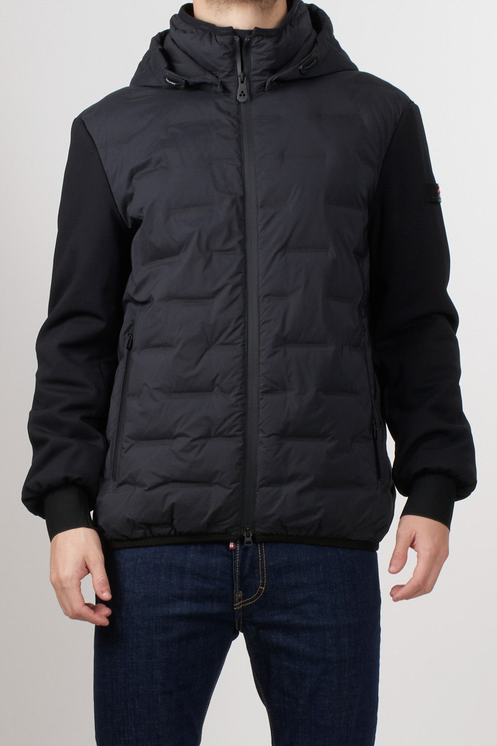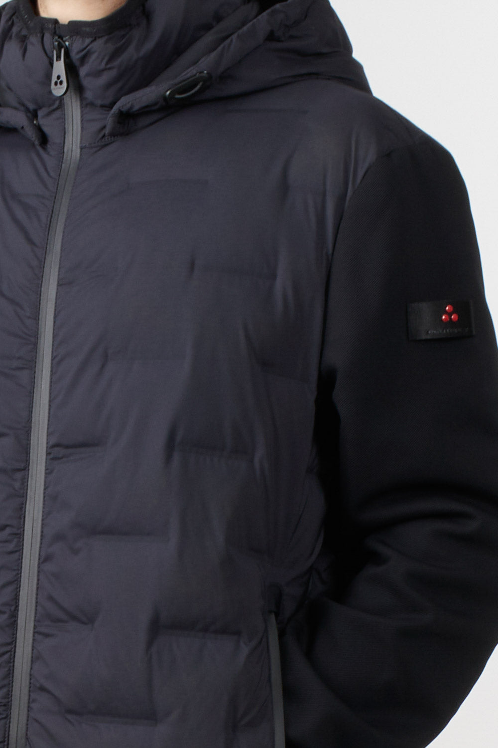 Holzer jacket made of a double material, with the main fabric in stretch polyester jacquard, and the second fabric is a technical stretch nylon drill with a brushed interior, which offers comfort and warmth. It features a two-way central zip, a high collar, windproof cuffs, and side pockets. GRS-certified ThermoPlume padding reproduces the softness and lightness of natural down, and is water-repellent.