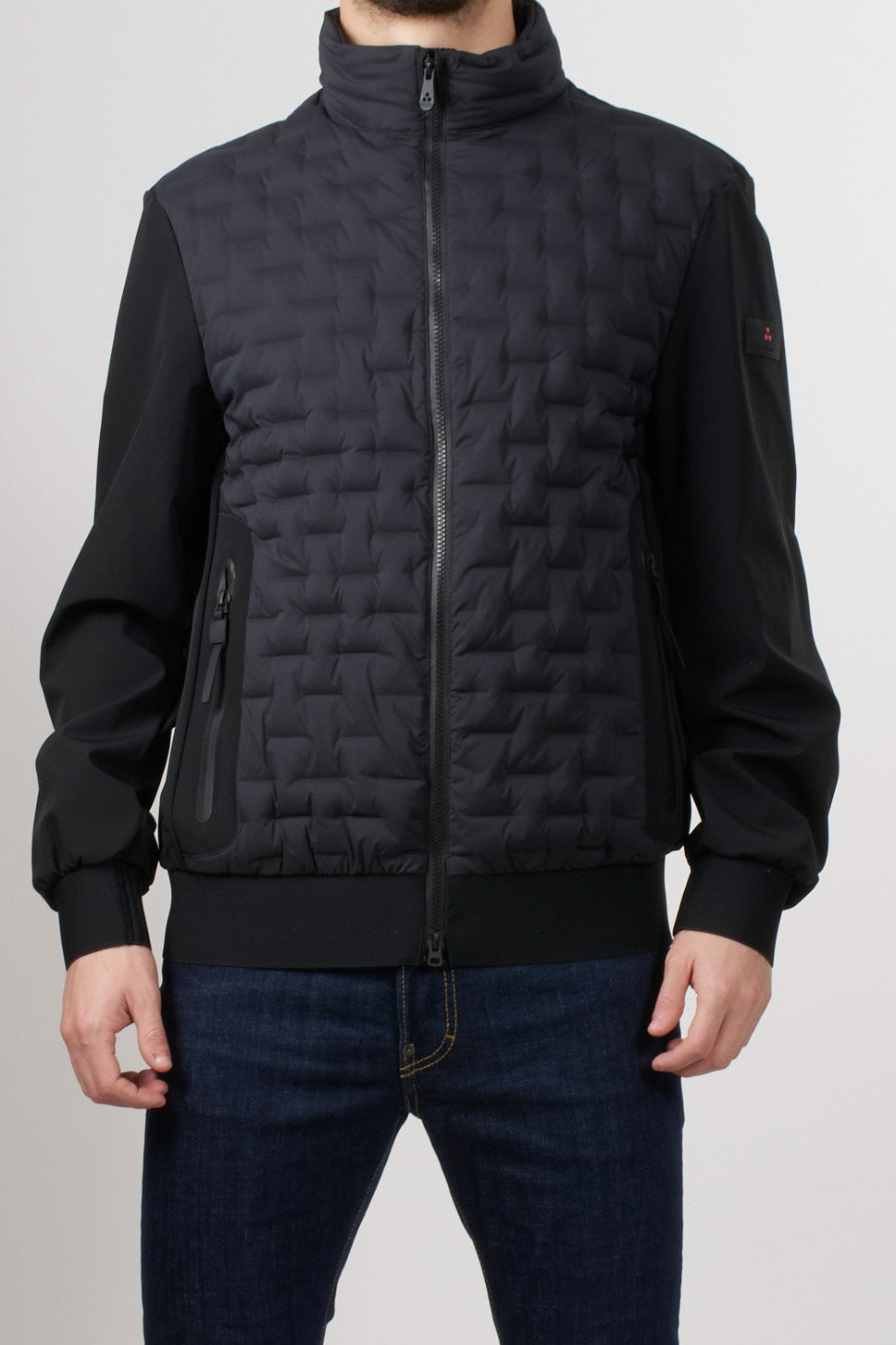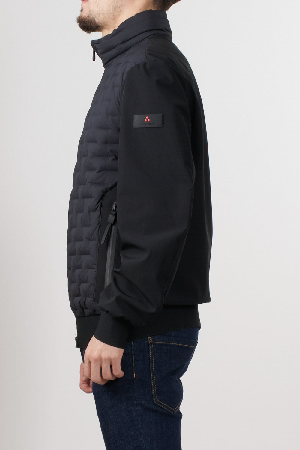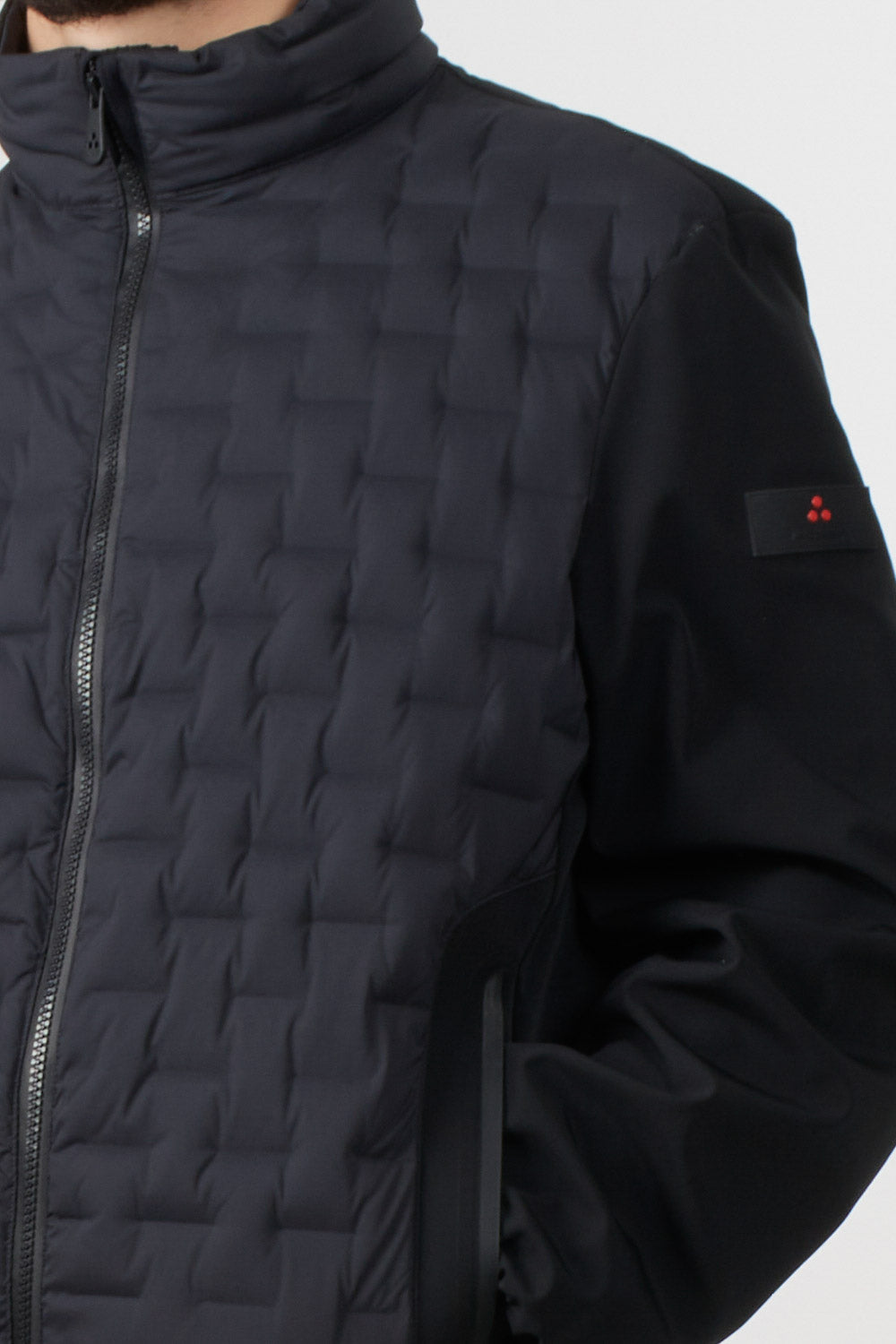 Kildin jacket by Peuterey made of double material, with main fabric in stretch polyester jacquard, second fabric, a soft shell in stretch nylon coupled with polyester jersey, smooth sleeves, contrasting black details and clean lines, double central zip, side welt pockets and edges in technical fabric, certified natural down padding.