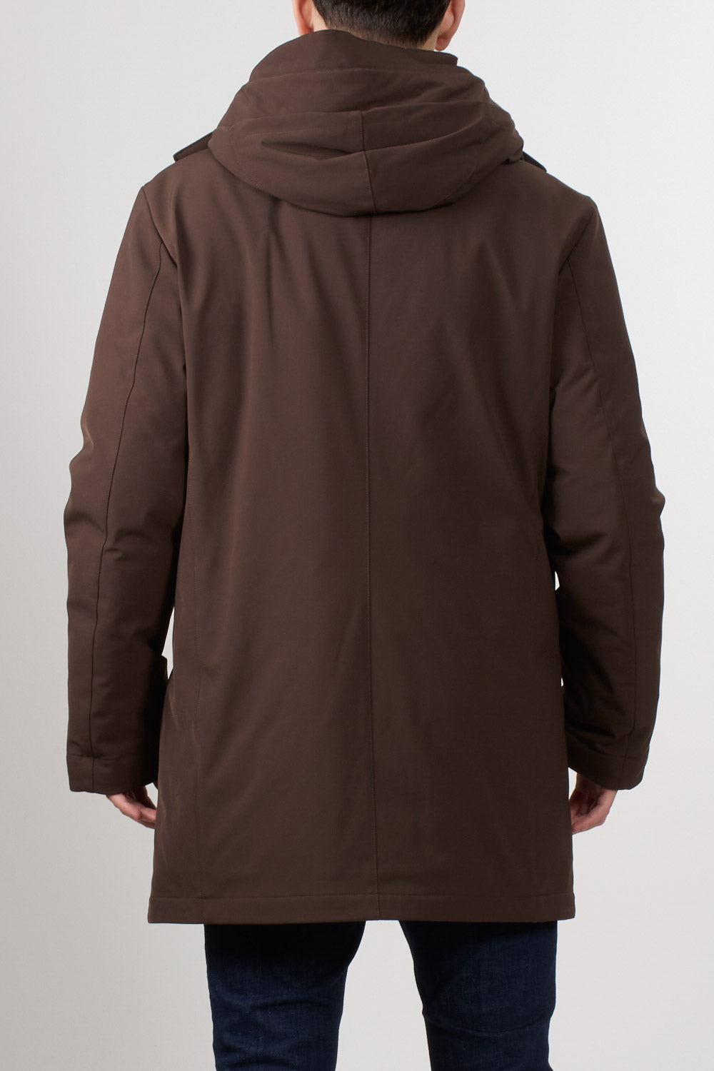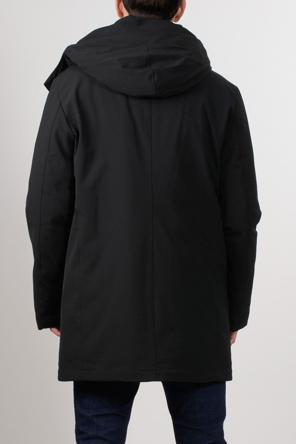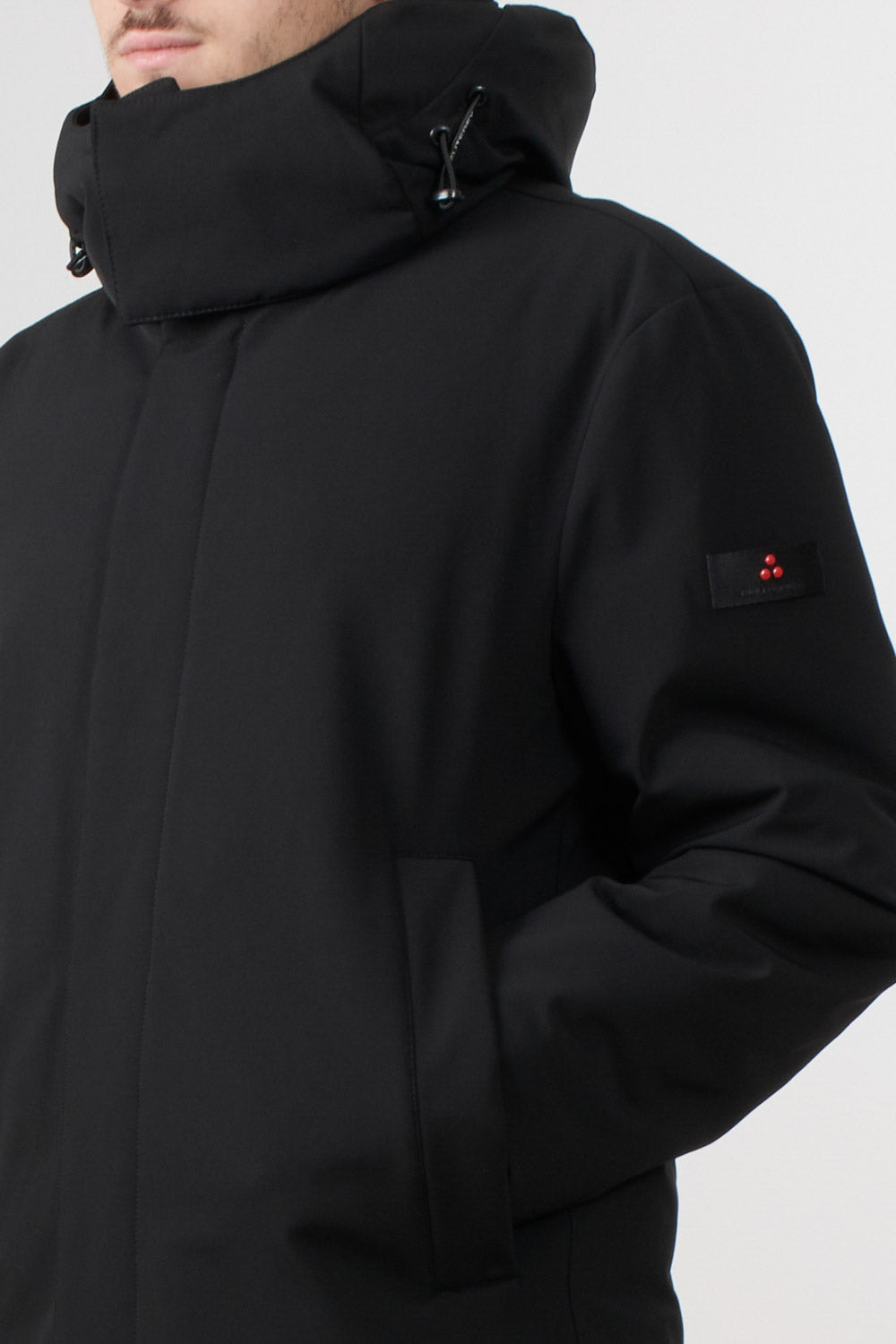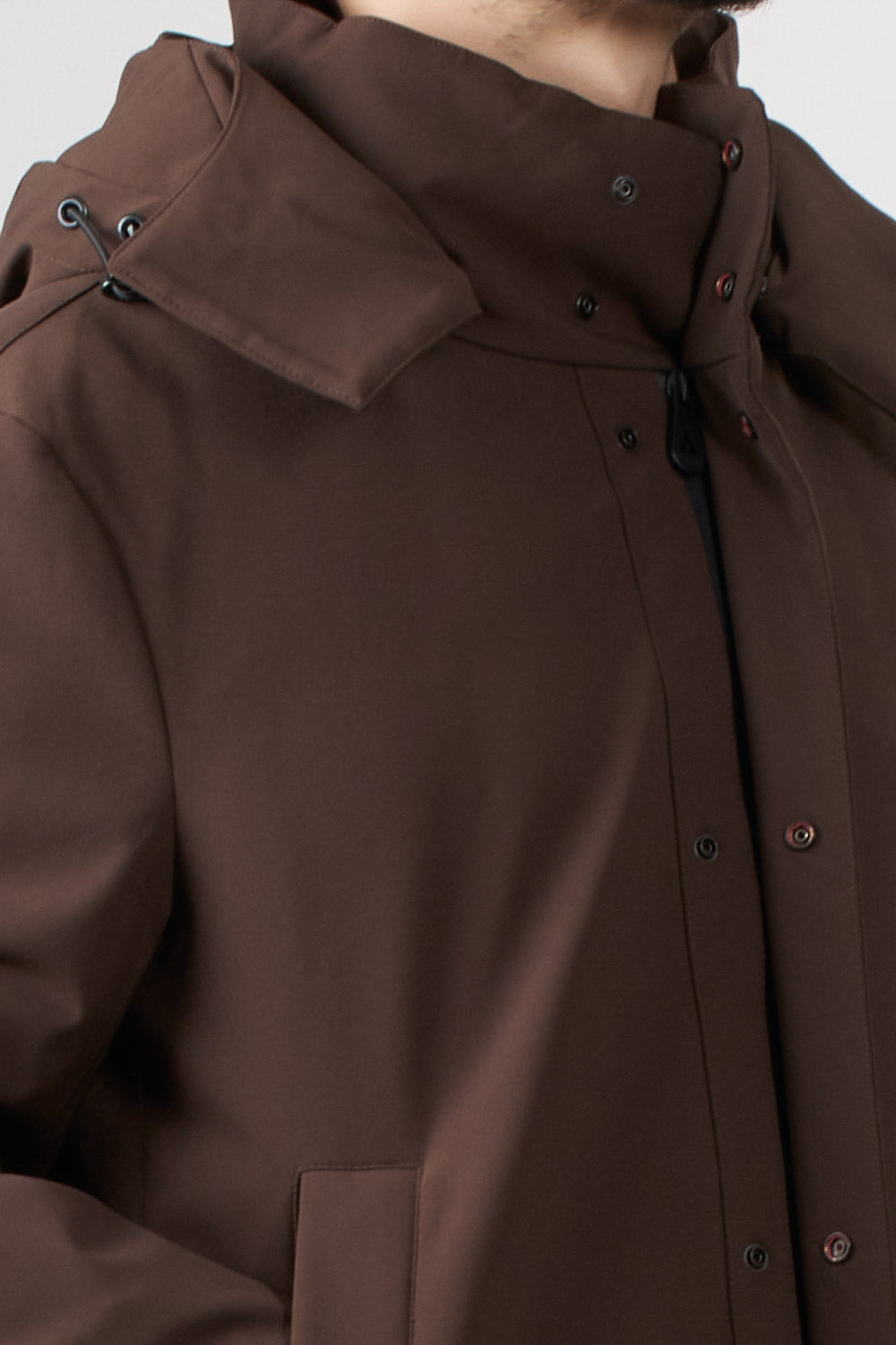 Kruger jacket made of recycled polyester stretch fabric with a twill structure, characterized by a matte and clean look. The lightweight internal coating gives body to the fabric, maintaining a soft hand and ensuring windproof and water-repellent properties . It features a stand-up collar, detachable hood, checked lining and hidden zip closure with two sliders , side pockets.