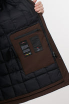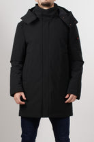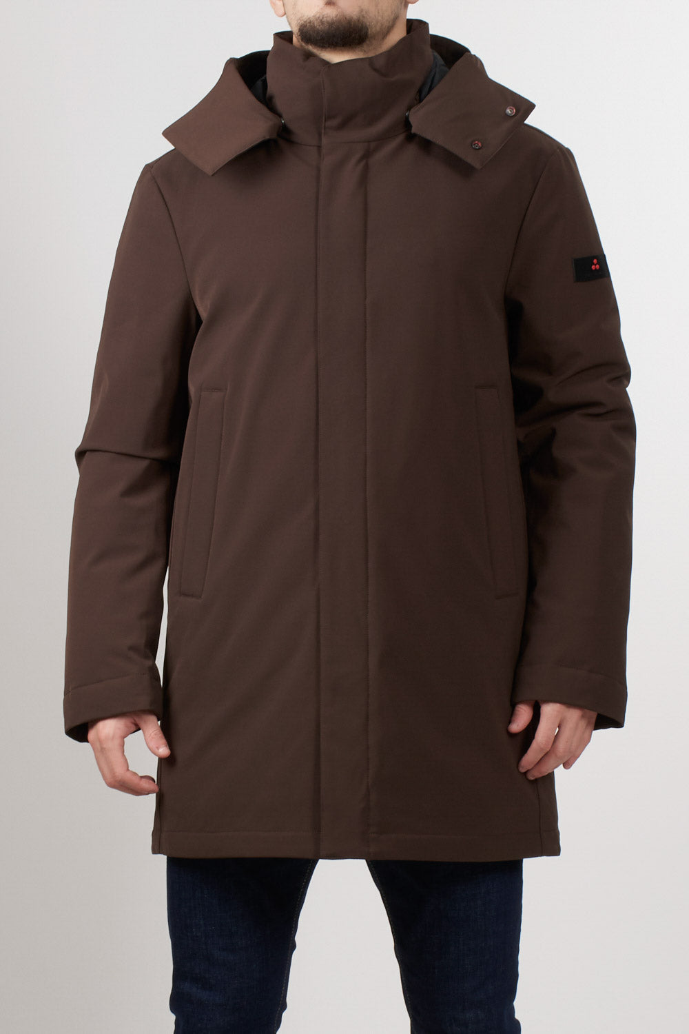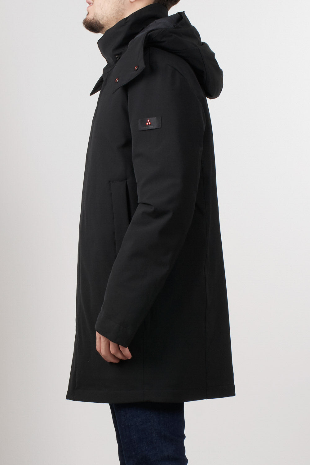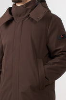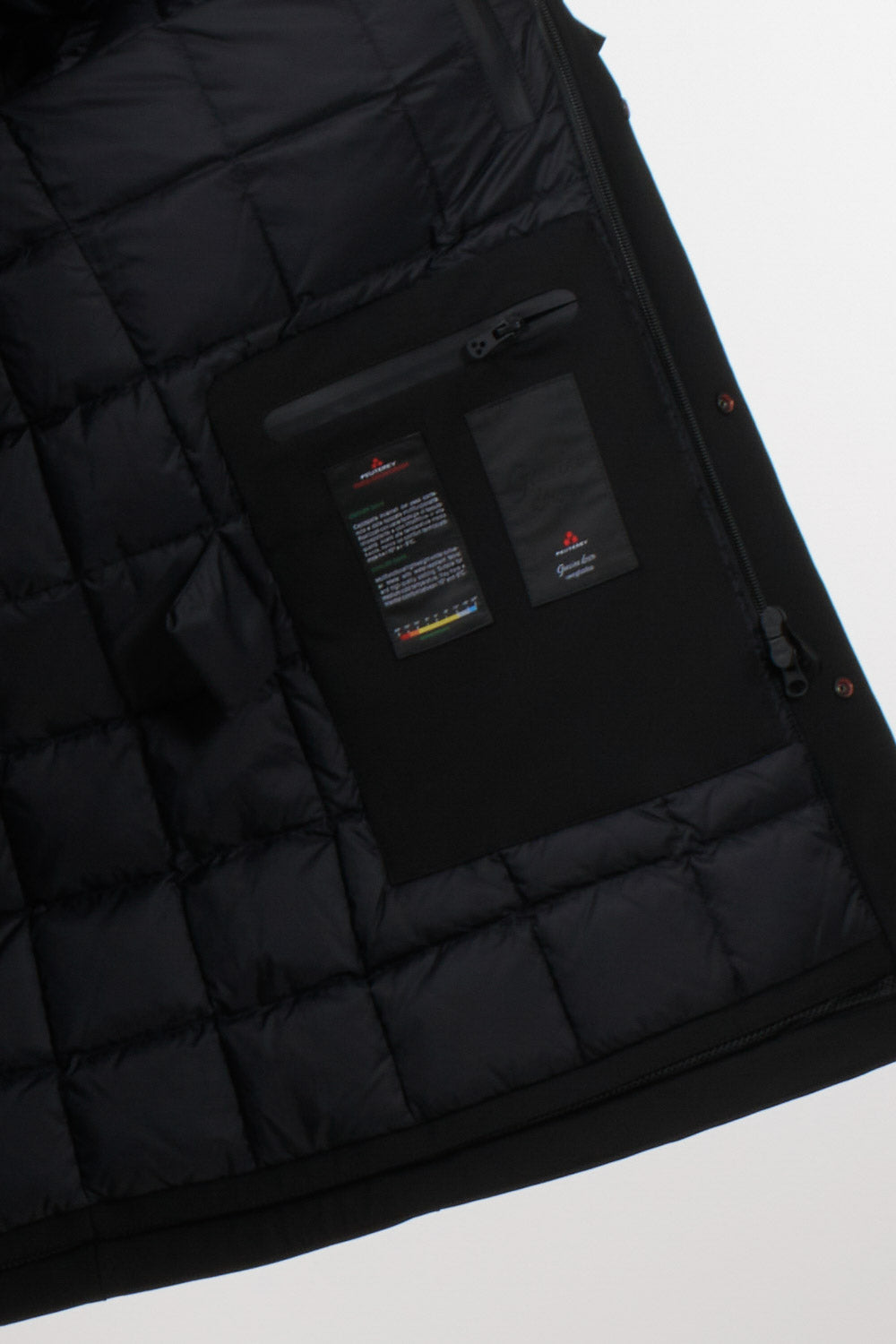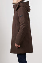 Kruger jacket made of recycled polyester stretch fabric with a twill structure, characterized by a matte and clean look. The lightweight internal coating gives body to the fabric, maintaining a soft hand and ensuring windproof and water-repellent properties . It features a stand-up collar, detachable hood, checked lining and hidden zip closure with two sliders , side pockets.