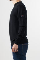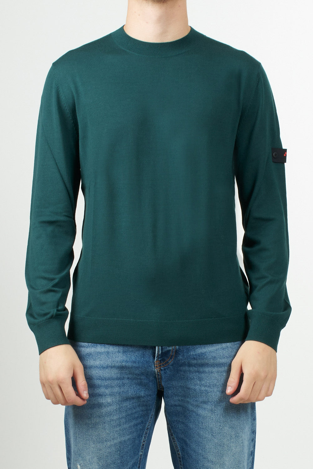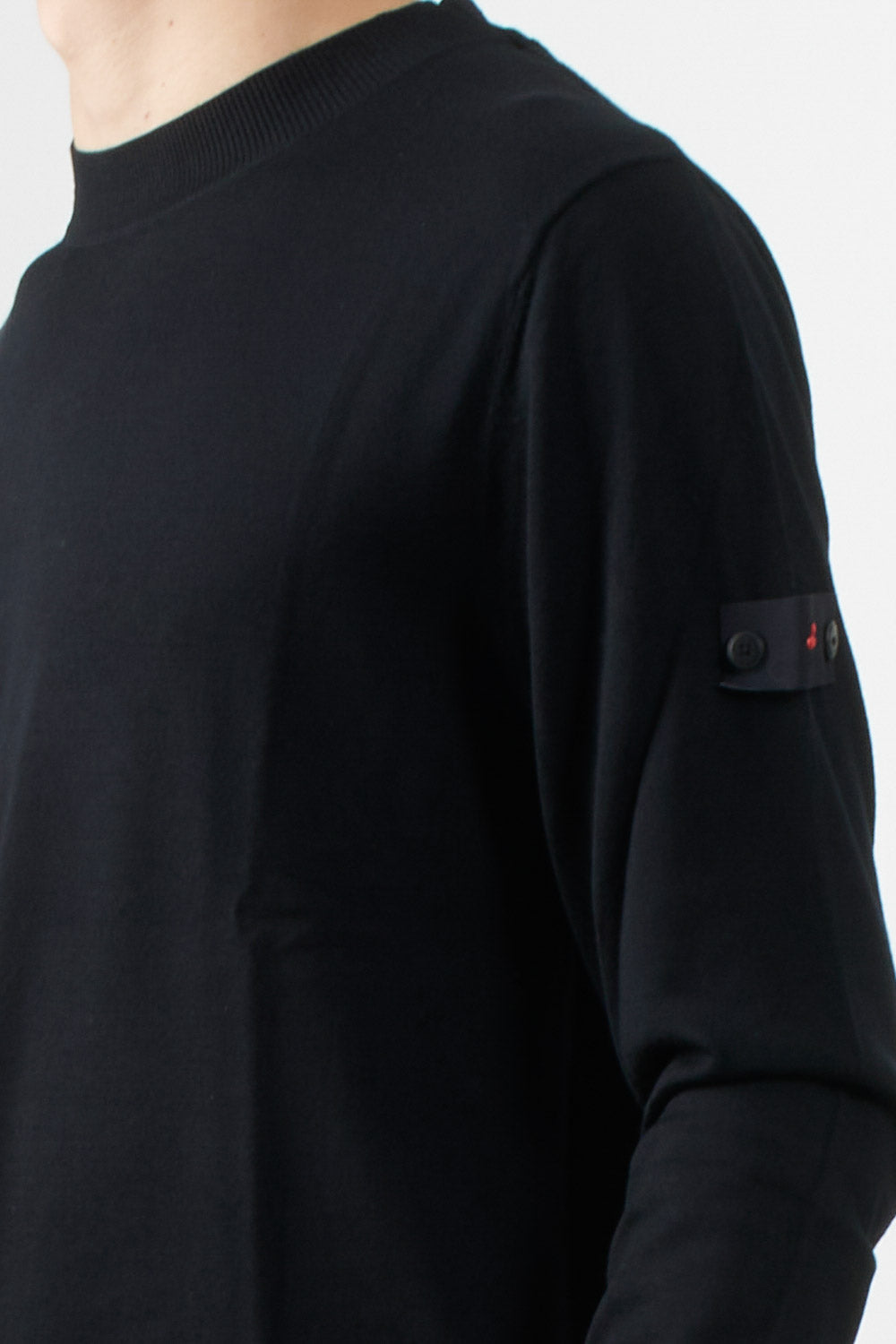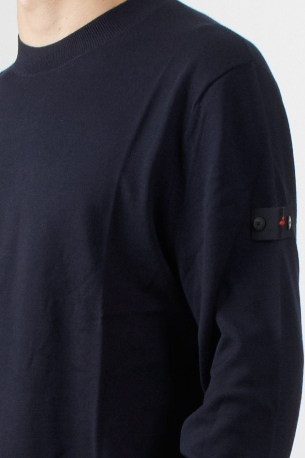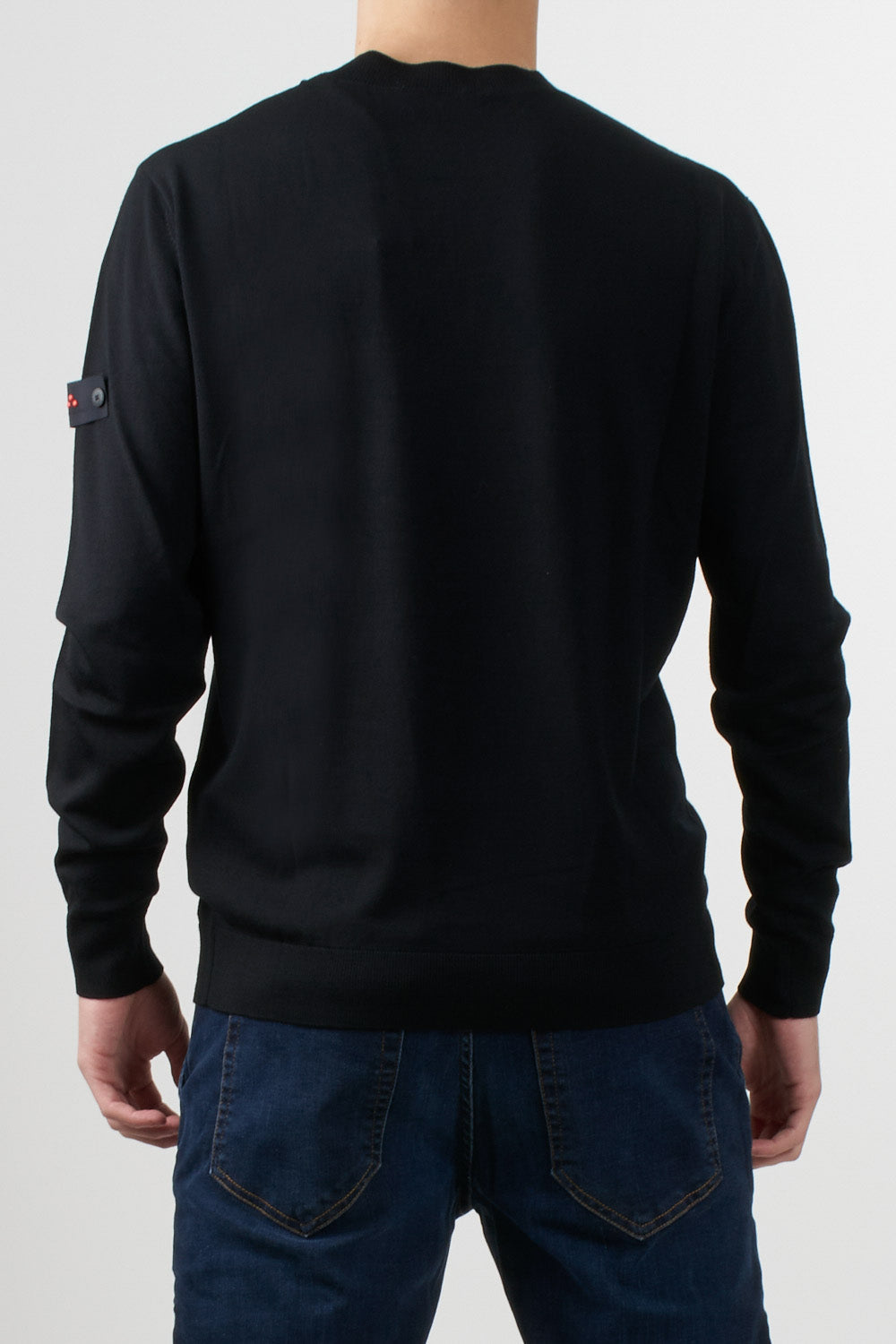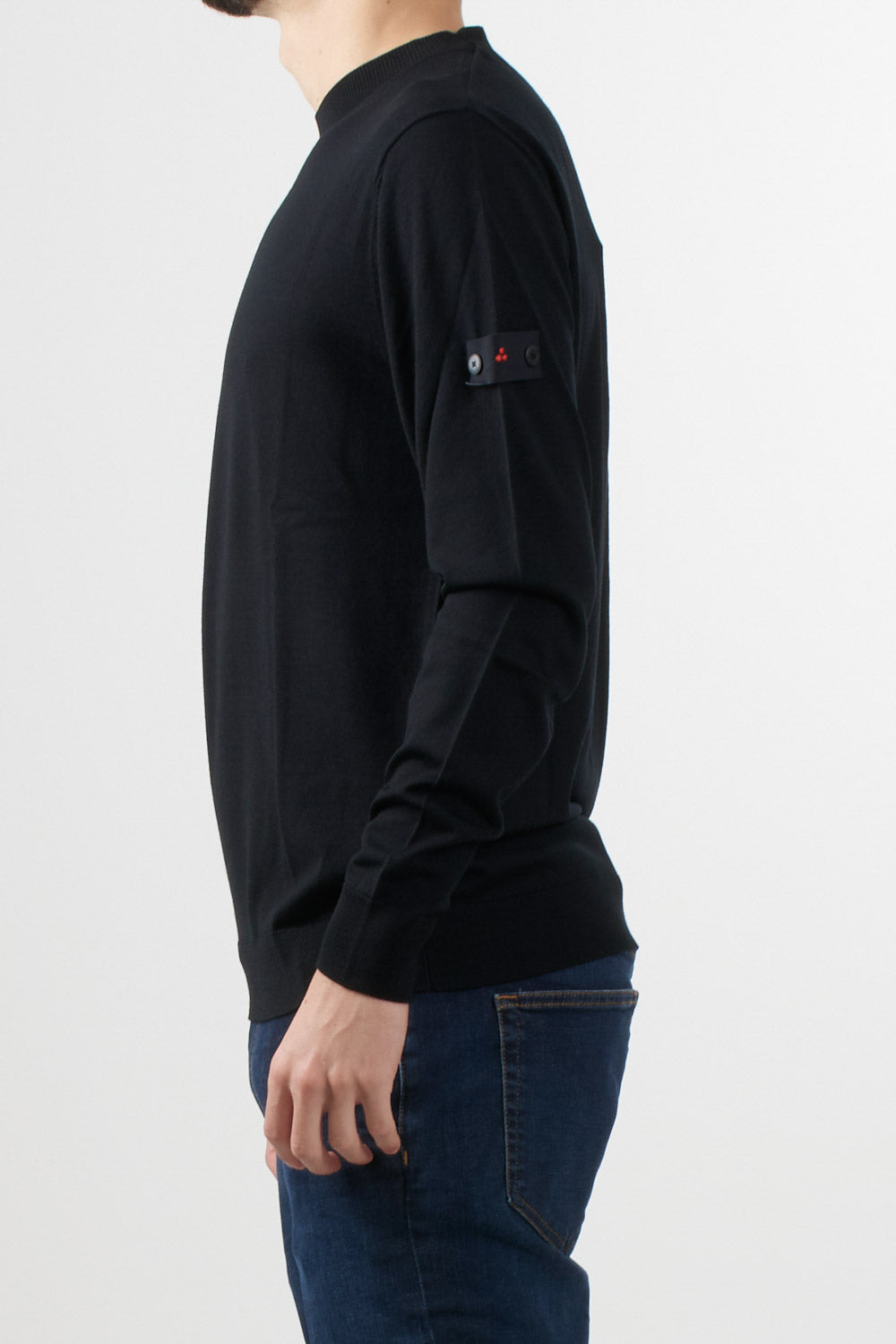 Peuterey long-sleeved sweater made of fine merino wool, featuring a clean cut and an elegant, smooth texture. The model features a ribbed collar, cuffs, and hem, with a Peuterey logo applied to the left sleeve. A basic and versatile piece, ideal for the winter season.