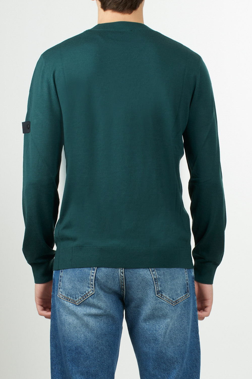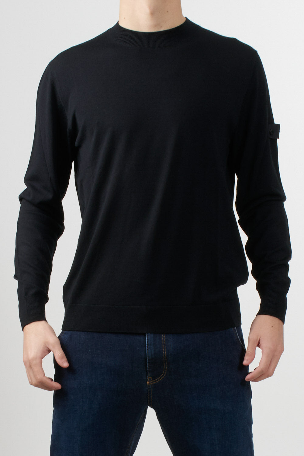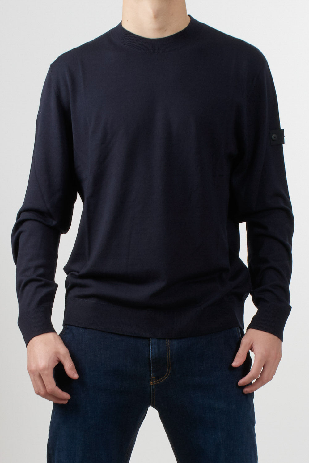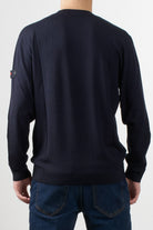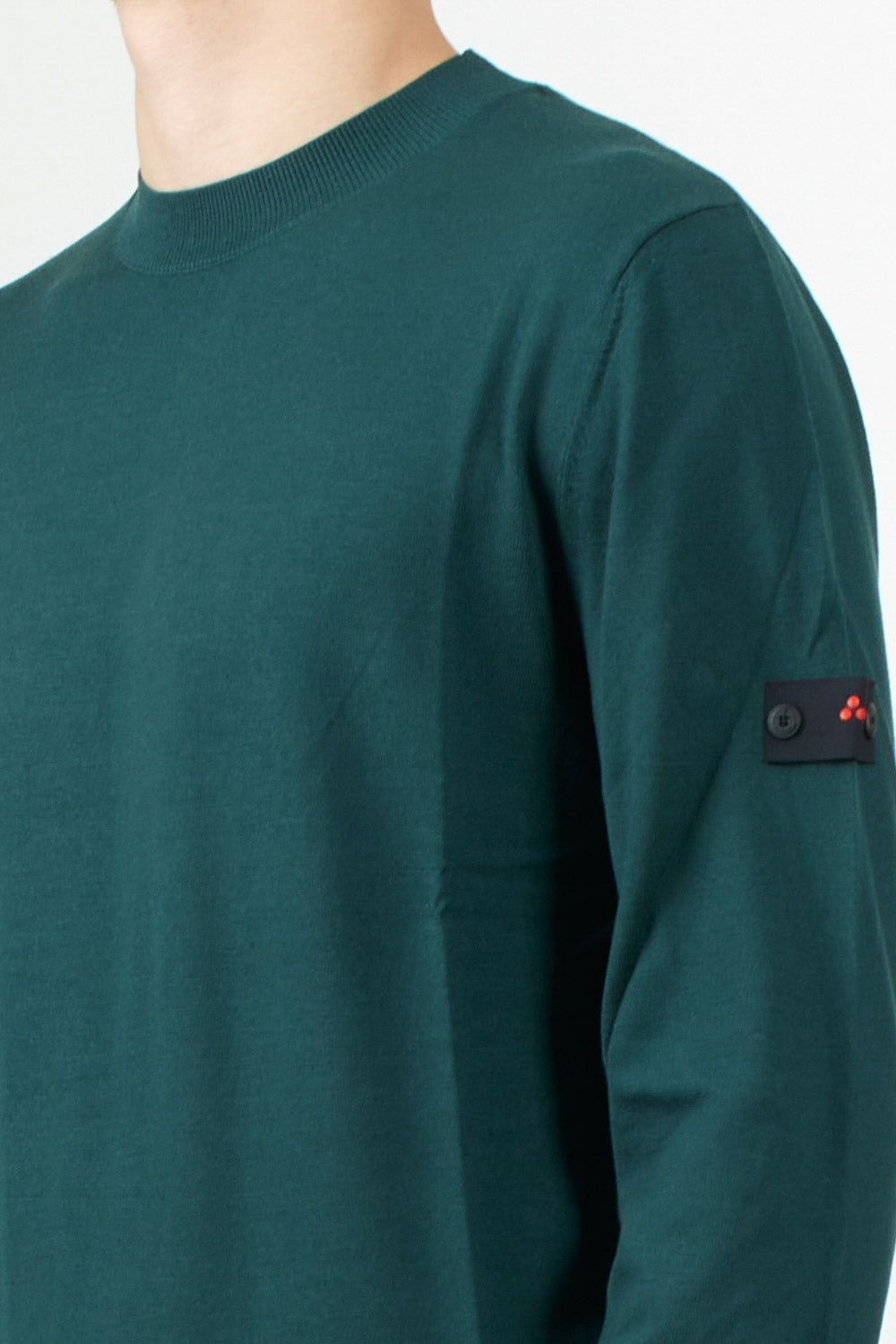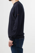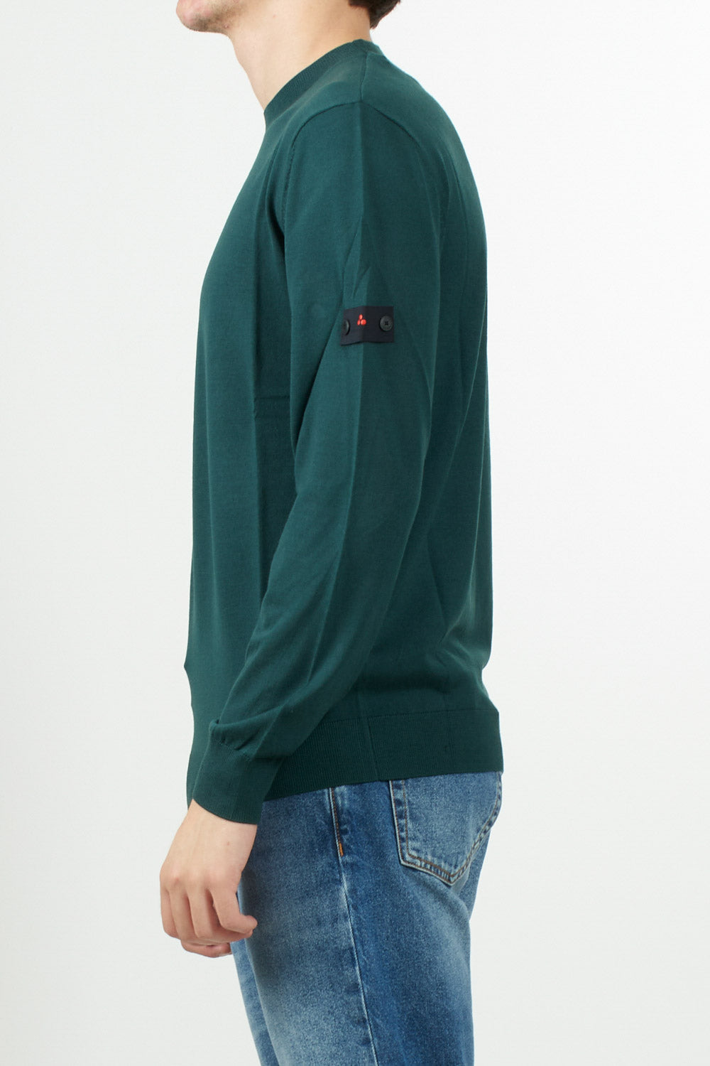 Peuterey long-sleeved sweater made of fine merino wool, featuring a clean cut and an elegant, smooth texture. The model features a ribbed collar, cuffs, and hem, with a Peuterey logo applied to the left sleeve. A basic and versatile piece, ideal for the winter season.