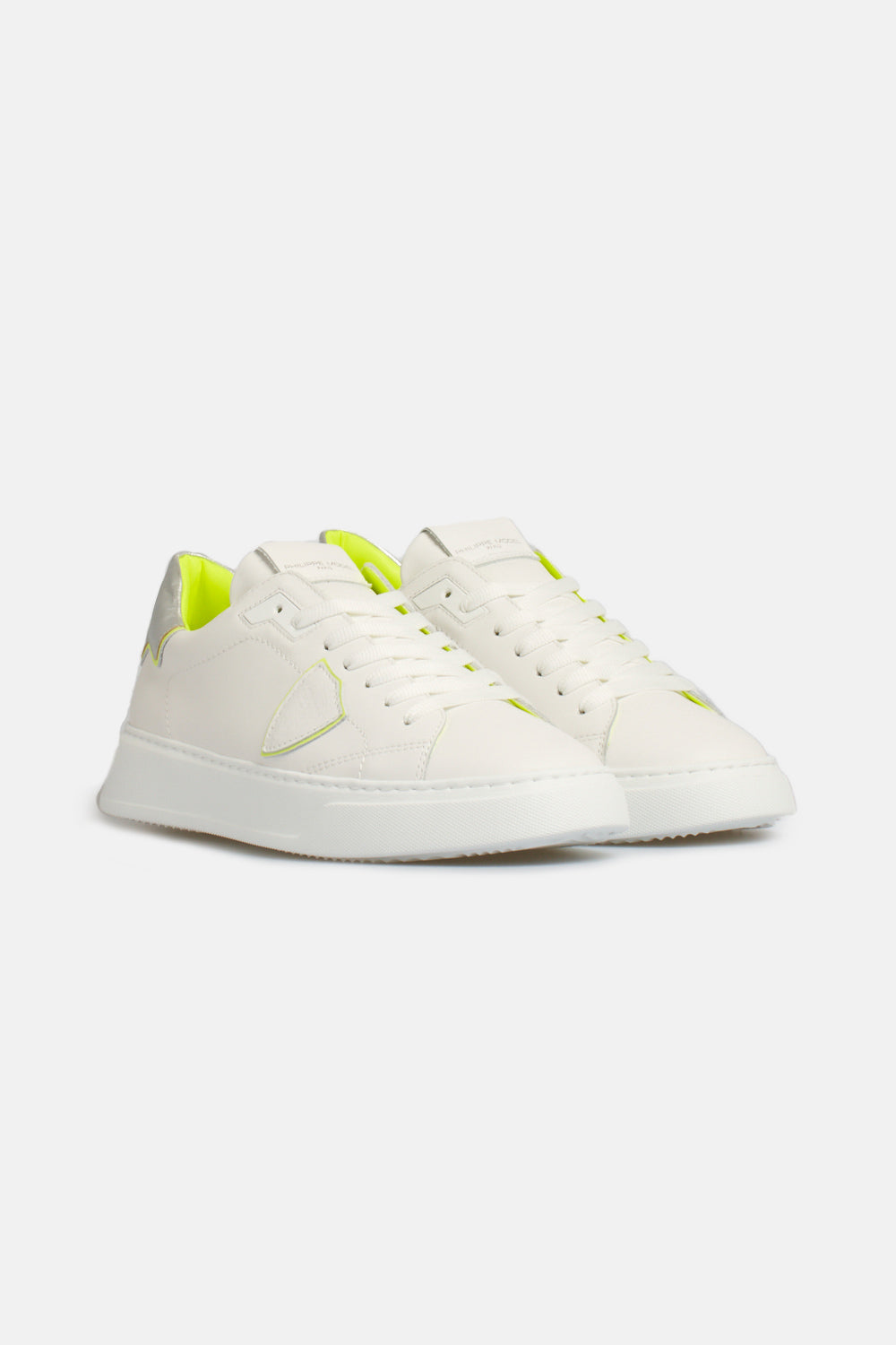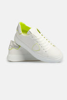 Temple Philippe Model sneakers, upper made of calfskin, white cotton laces, fluorescent yellow logo spoiler, fluorescent yellow inserts, logo tongue, rubber sole