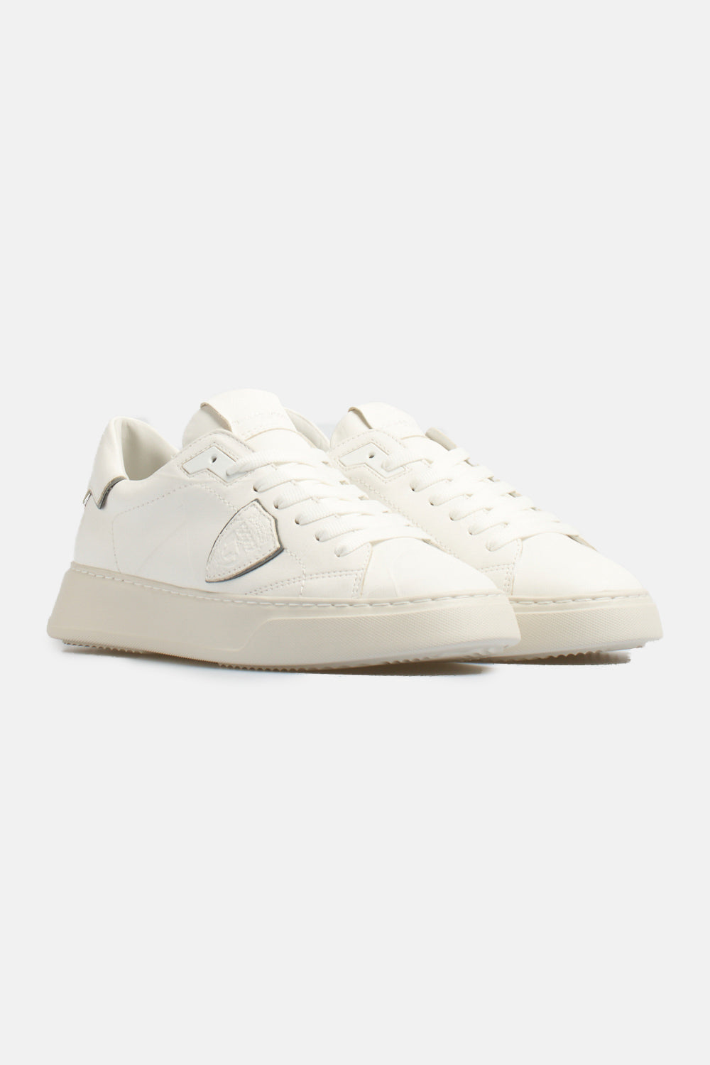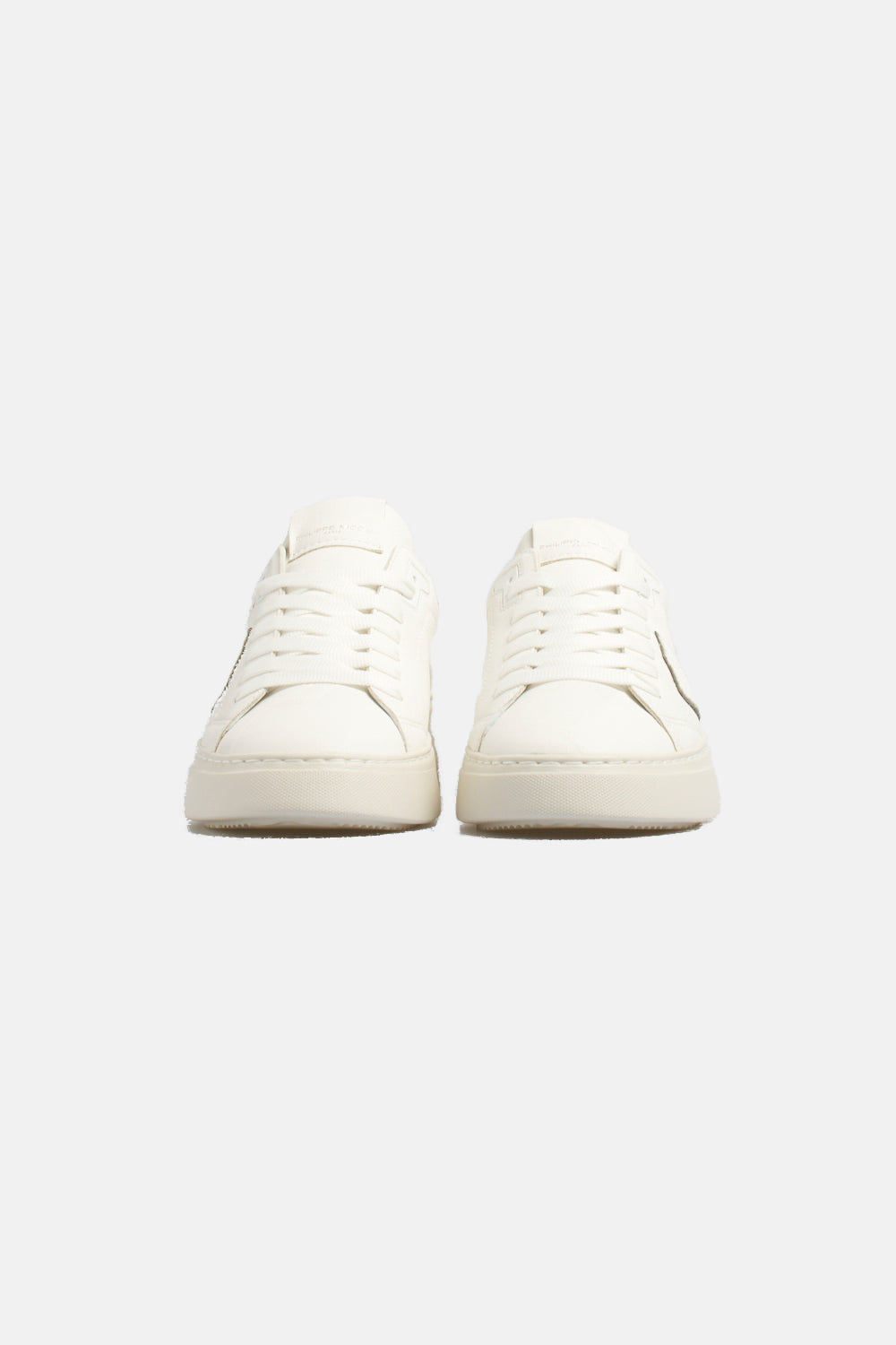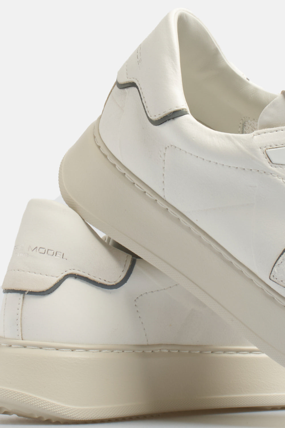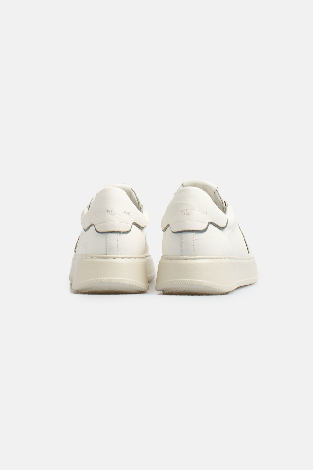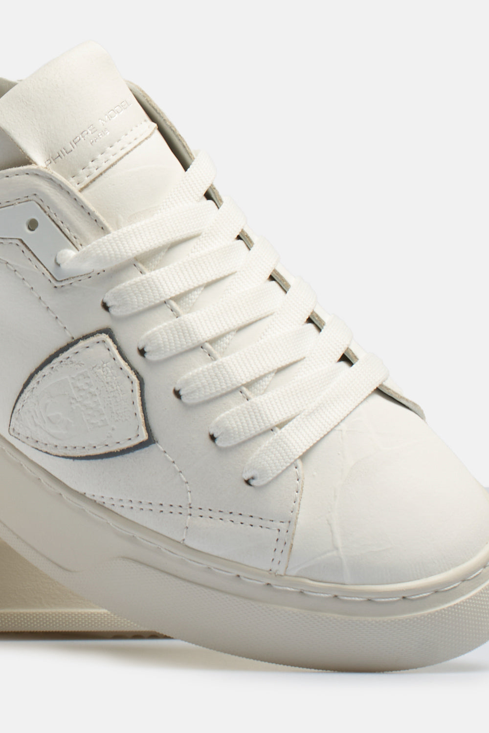 White sneaker by Philippe Model, featuring brushed leather with an embossed effect, leather lining, 4 cm high striped sole with logo, logo on the front and on the spoiler, rounded toe.