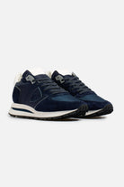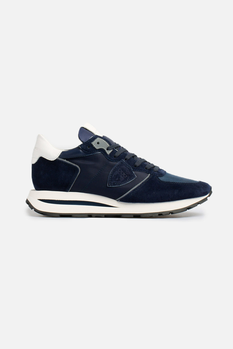 Tropez Low Man sneaker by Philippe Model with a contemporary sporty chic style, using a mix of materials, upper in technical fabric, mesh and suede, 3 cm high Eva sole, cotton laces, lettering logo on the front and back, Philippe Model logo shield on the side
