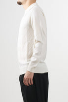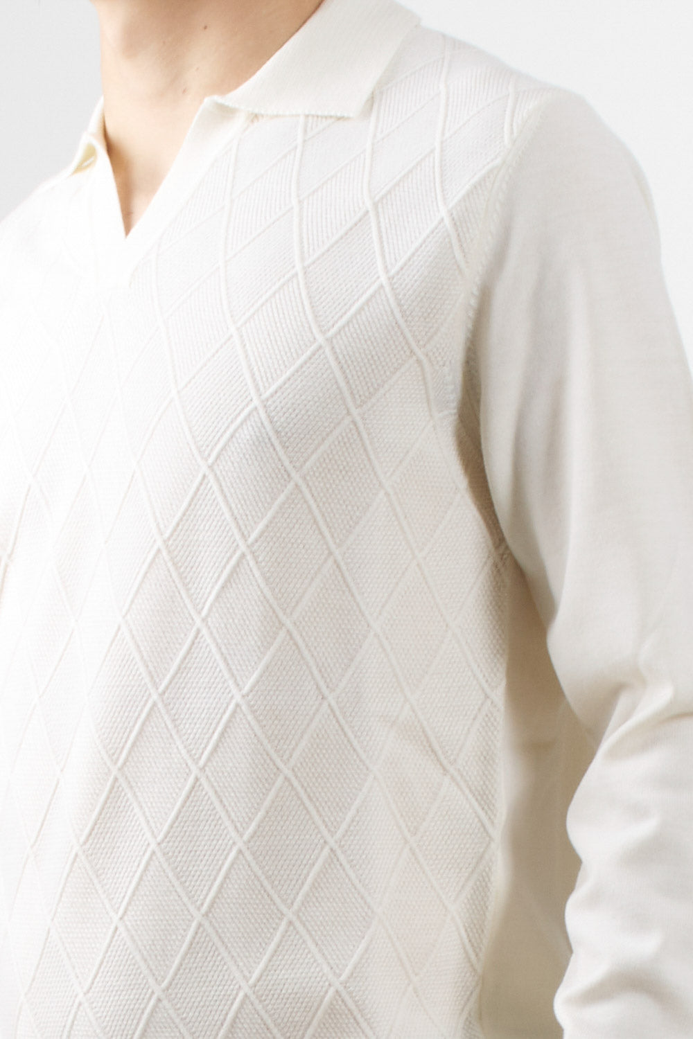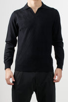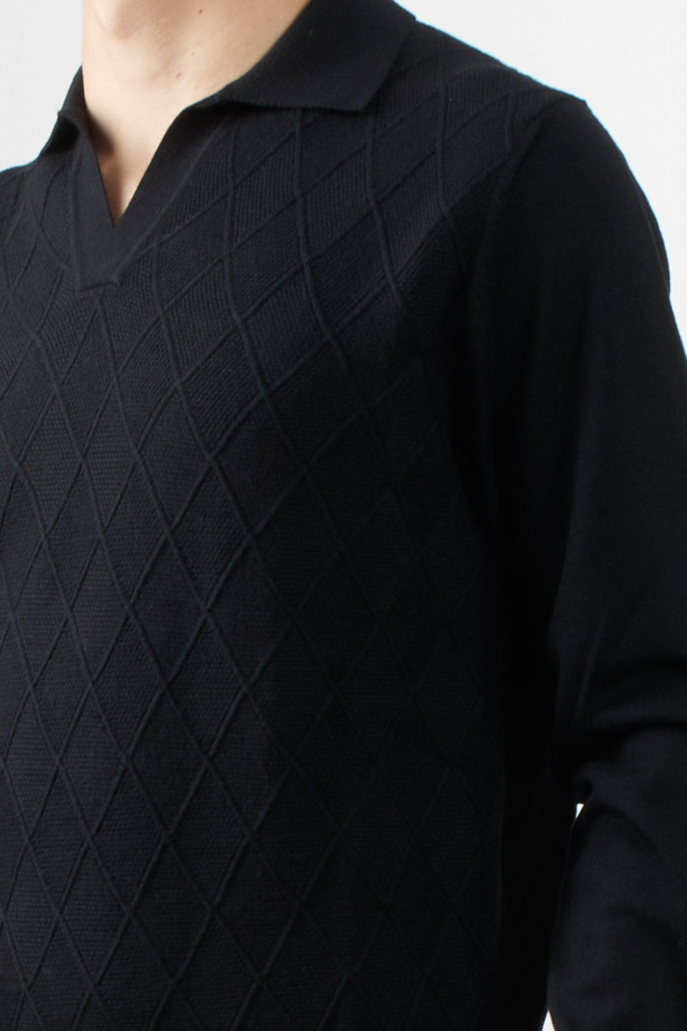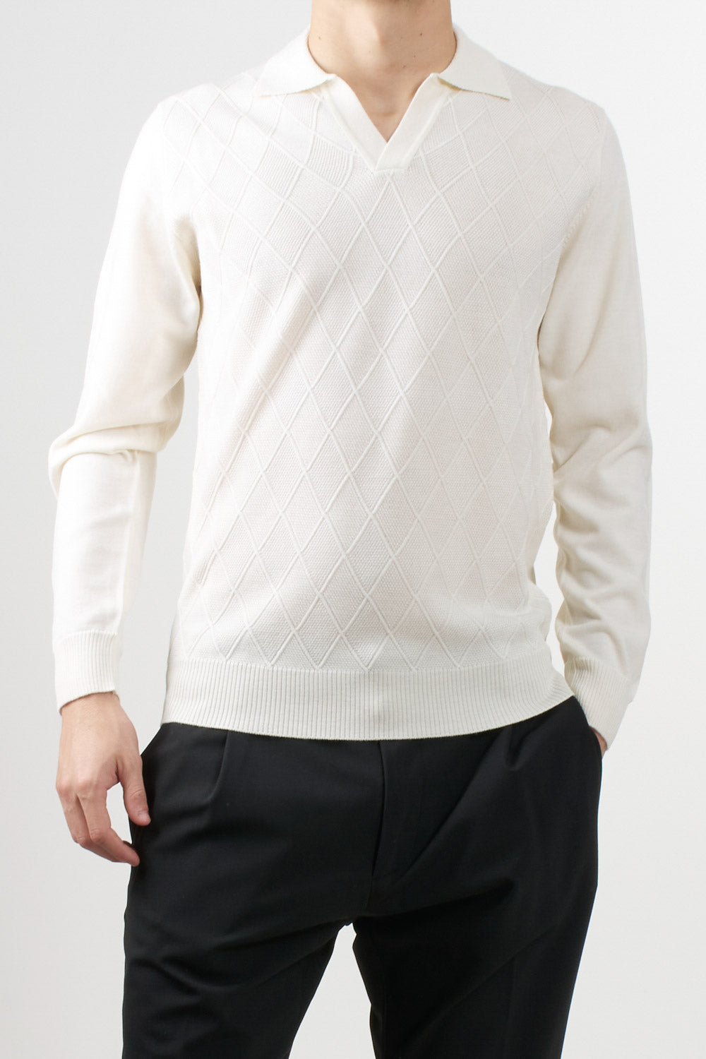 Long-sleeved polo shirt by Masq, featuring a geometric diamond pattern that enriches the texture of the garment, classic collar, finished with ribbed edges on the bottom and cuffs.
