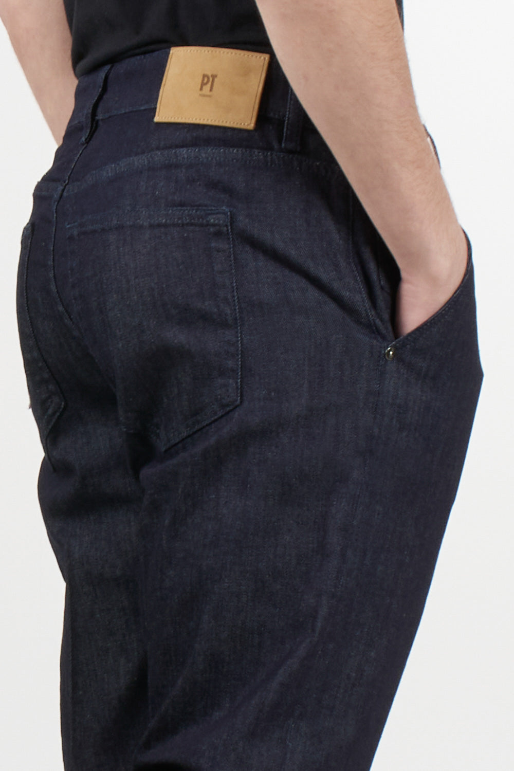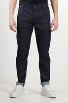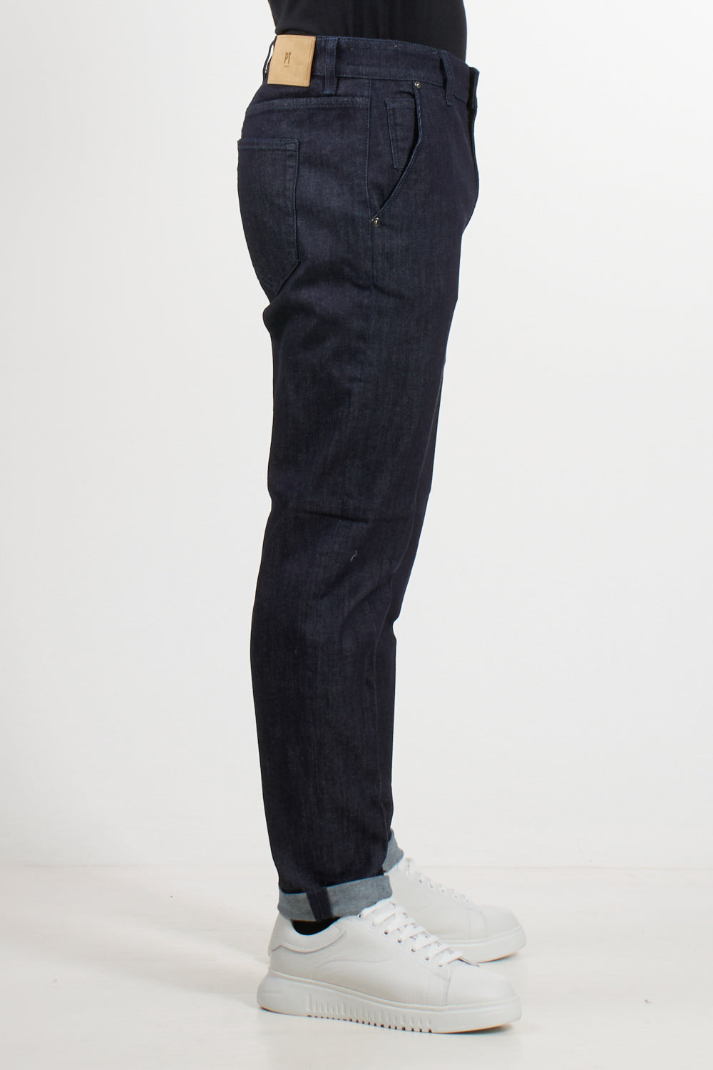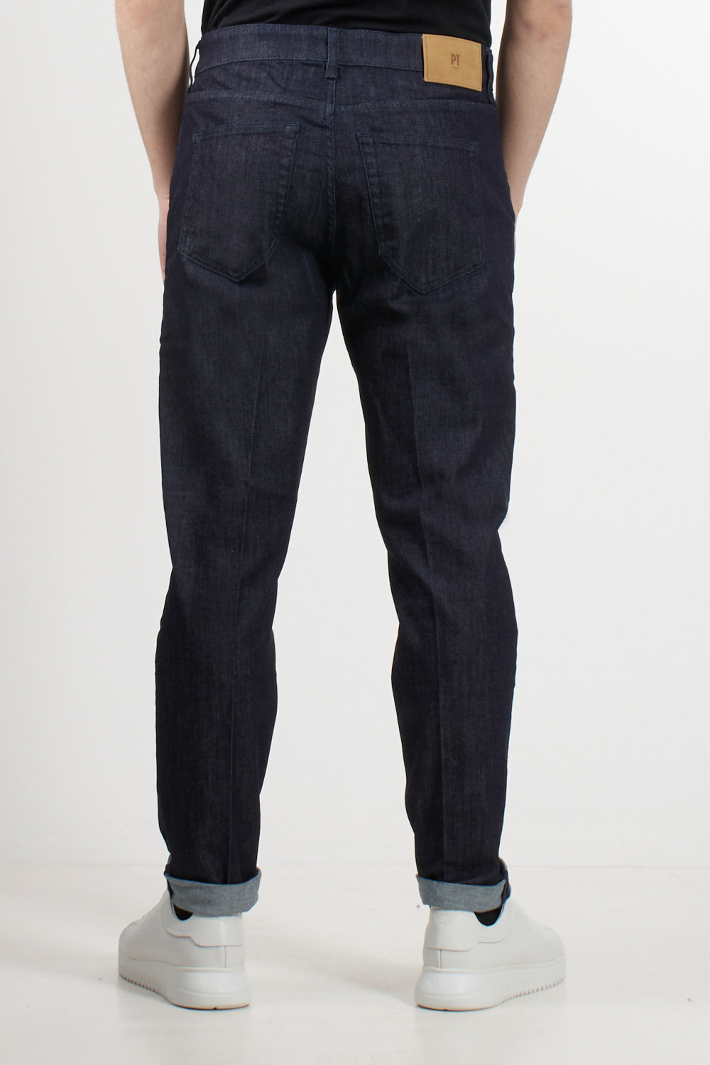 Indie jeans by Pt Torino, five pockets, belt loops, front button fastening, logo patch on the back