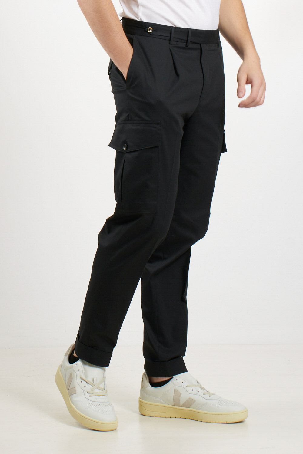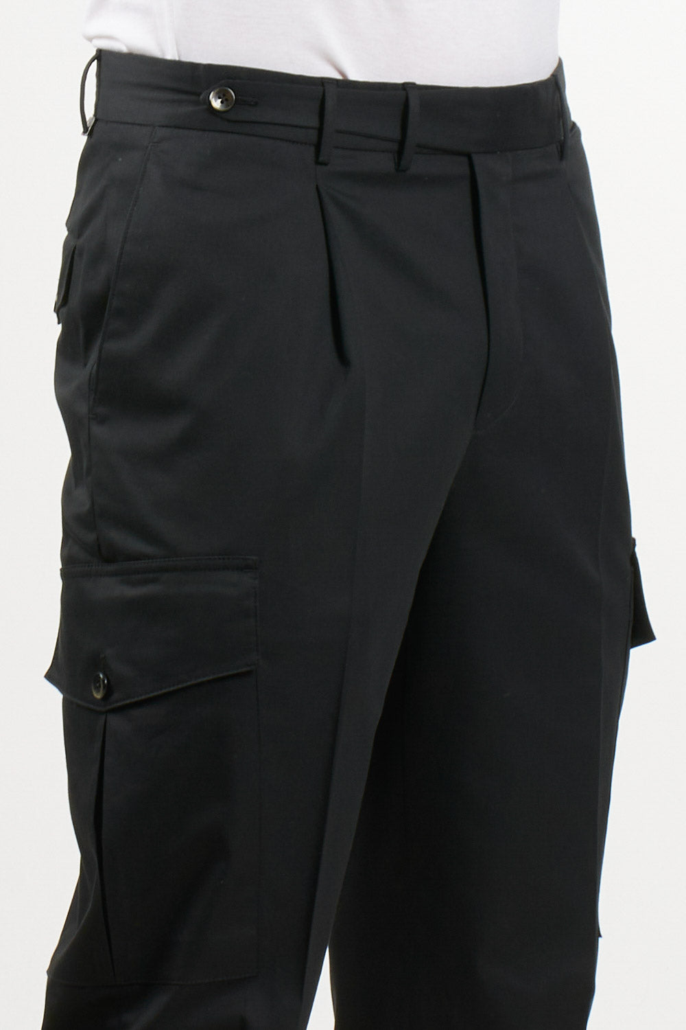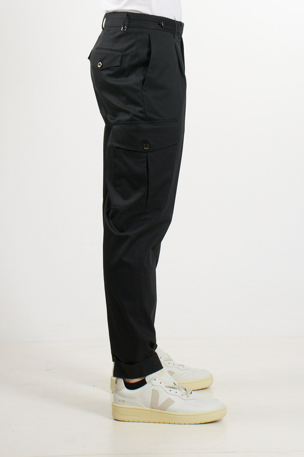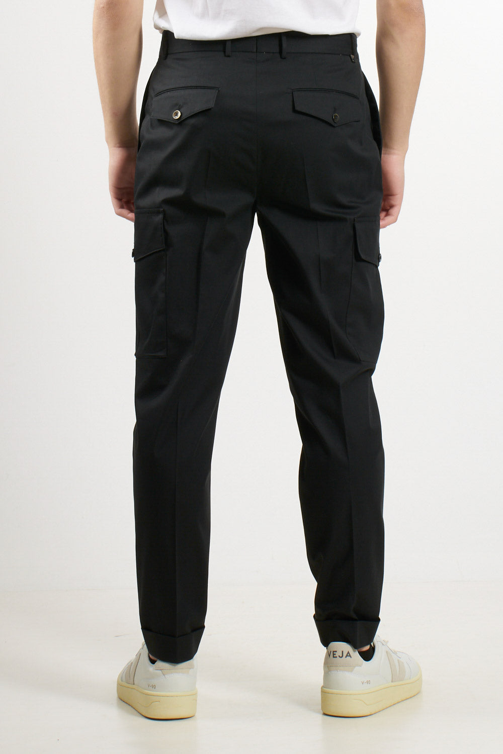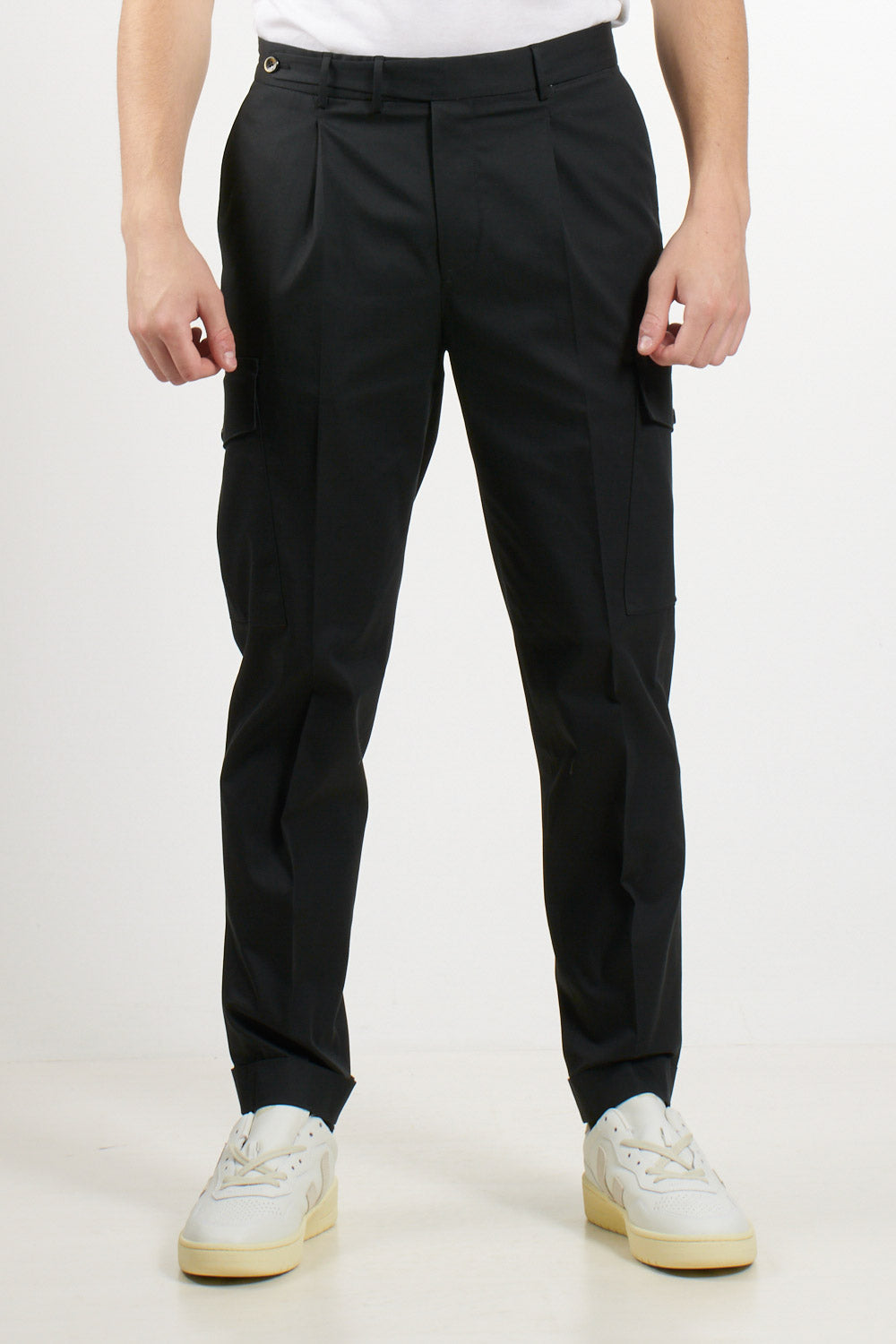 PT Torino cargo trousers in stretch cotton, carrot model with front pleats that enhance the figure, side pockets with flap and buttons, button fastening