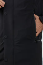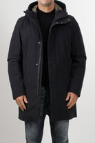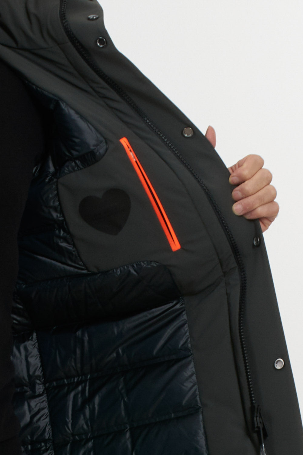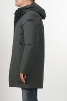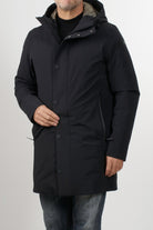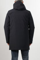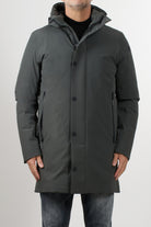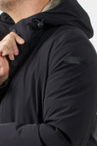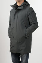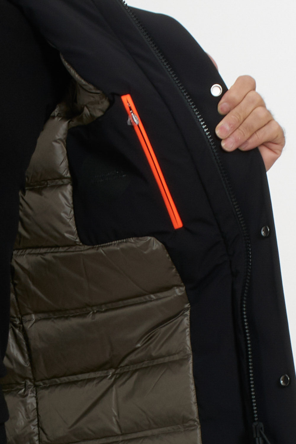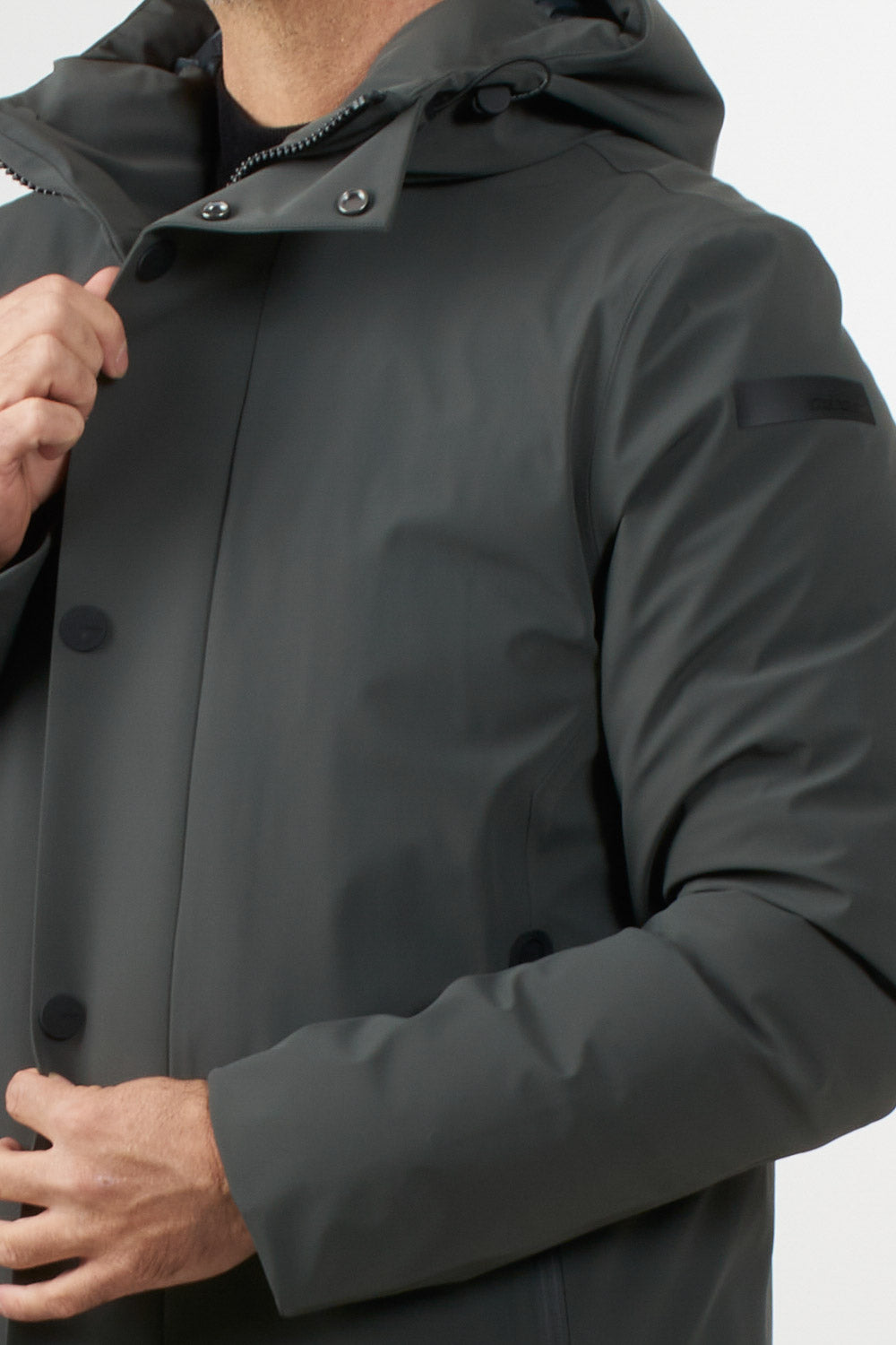 RRD jacket with a simple and sophisticated design, made of breathable and durable Stratofabric #3 technical fabric. The 90/10 duck down padding ensures lightweight warmth, while the fully seam-taped construction ensures waterproofness and comfort even on the coldest days. The fixed drawstring hood, large seam-taped pockets, and flap with rubberized snaps complete a functional and refined design. The interior, with a zip pocket and orange details, is embellished with the "Made with love, designed in Tuscany" tag. The black micro-injected logo on the sleeve completes the garment.