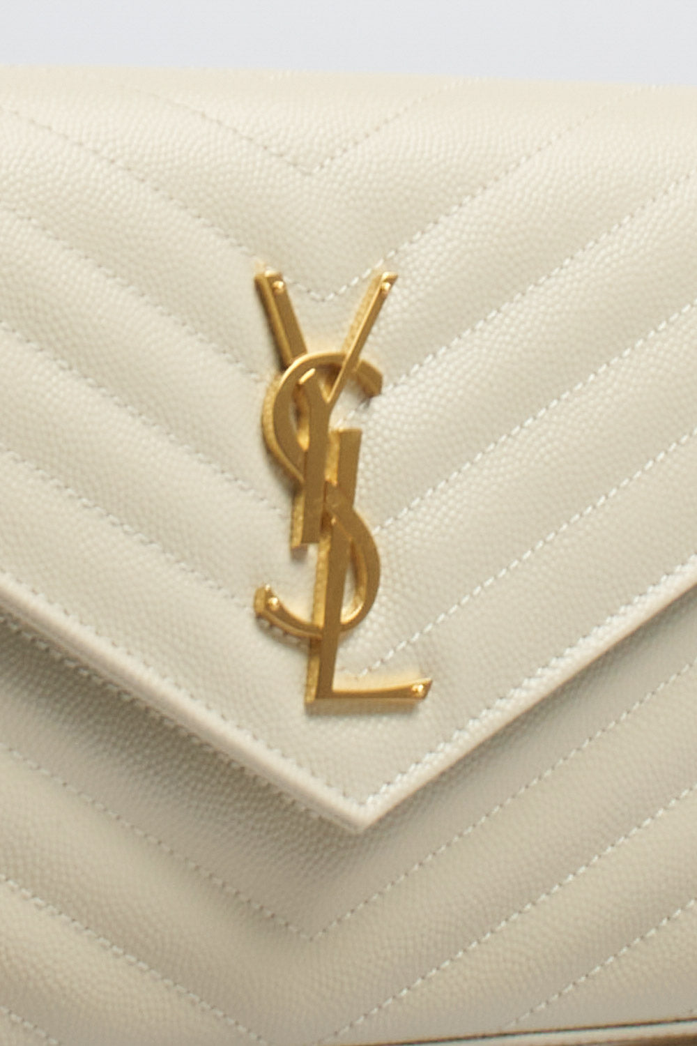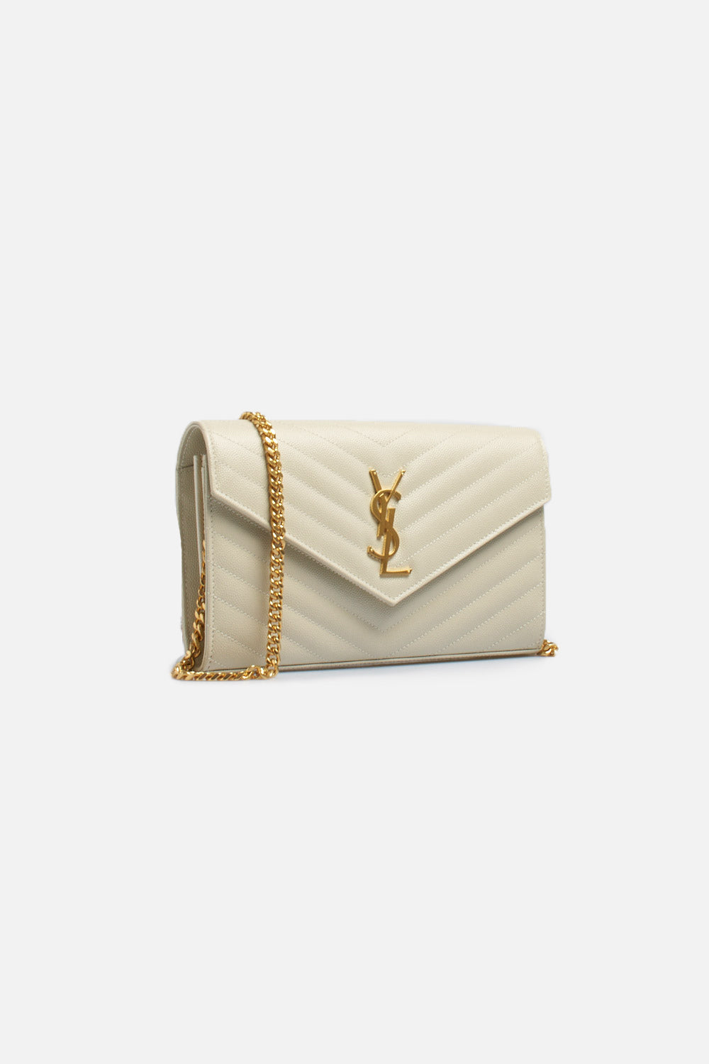 A symbol of timeless elegance, this Saint Laurent chain clutch embodies the Maison's iconic style with its refined quilted chevron motif and distinctive gold-tone Cassandre logo . Crafted from chrome- and metal-free tanned calfskin , it features a structured and sophisticated silhouette that blends aesthetics and functionality.