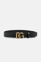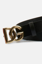 DG belt made of leather, featuring a crossed DG logo buckle, mushroom closure under the buckle and a loop to secure the tip.