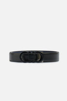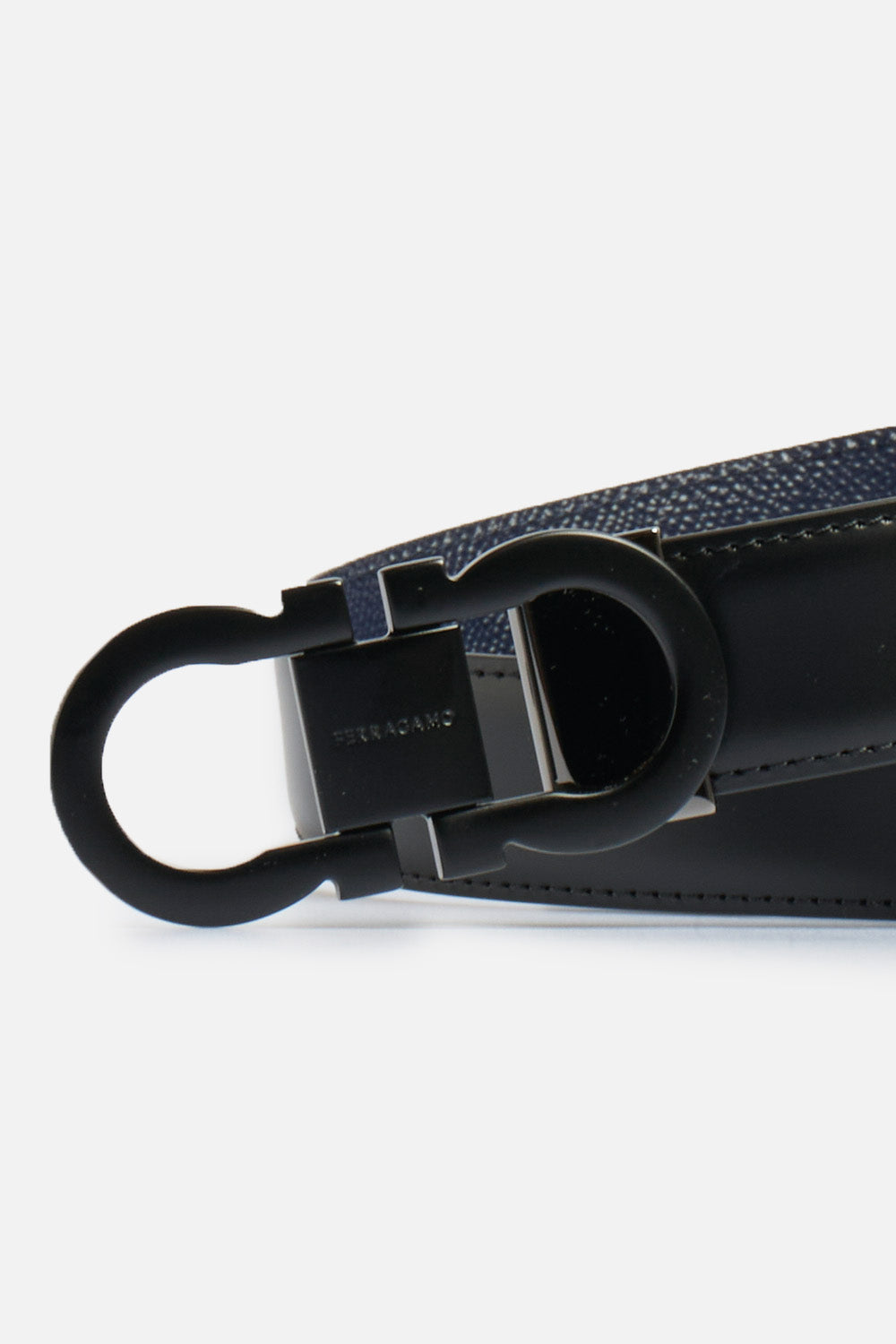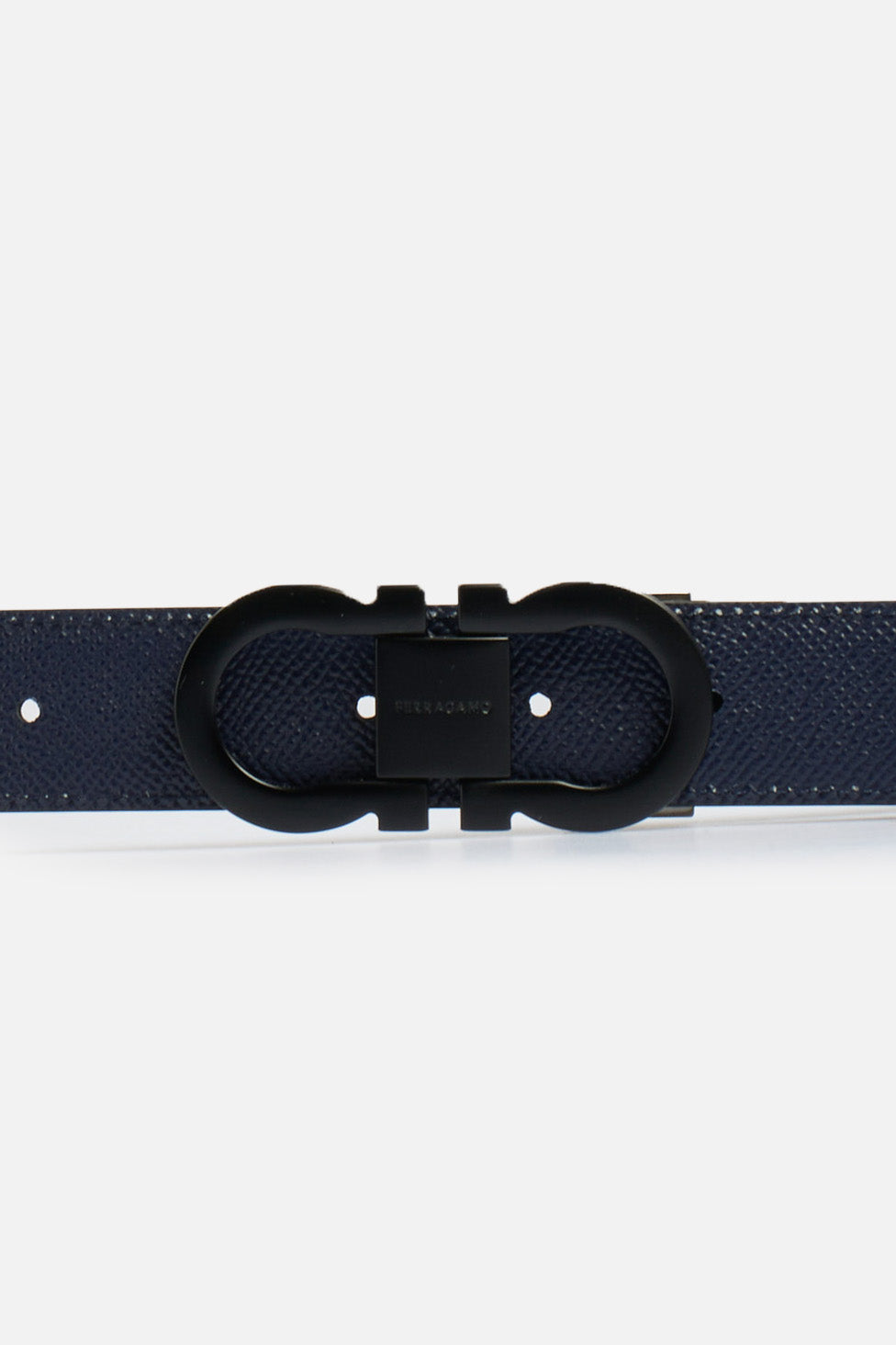 Reversible, two-tone belt by Ferragamo, with one smooth side and one hammered finish, double Gancini buckle features a square central plaque with embossed signature.