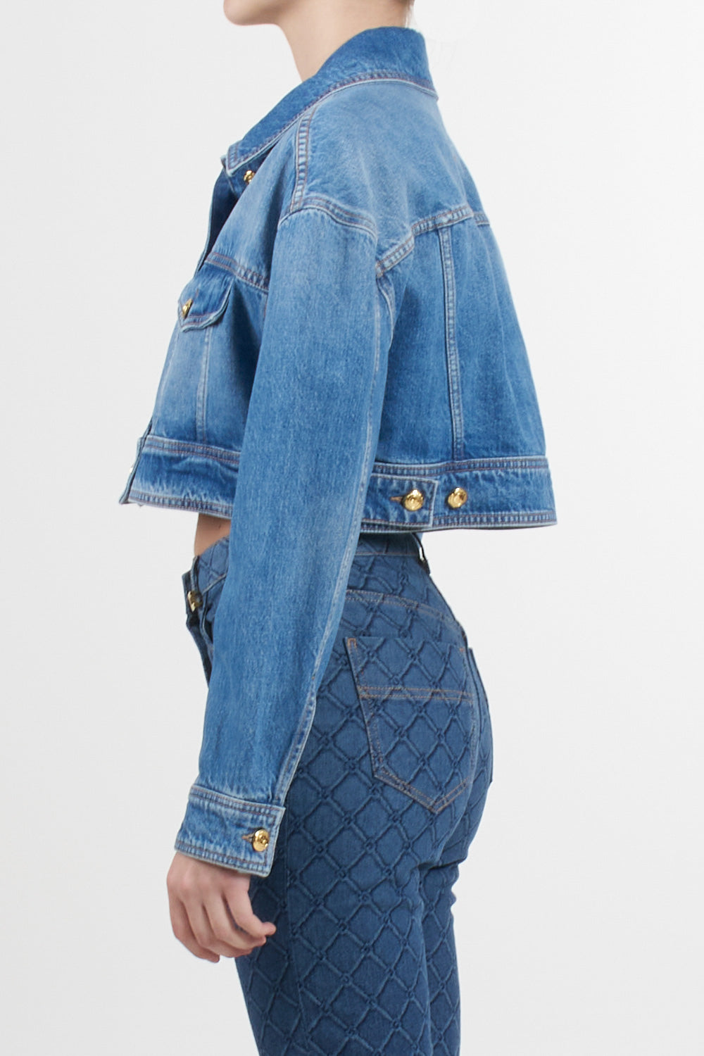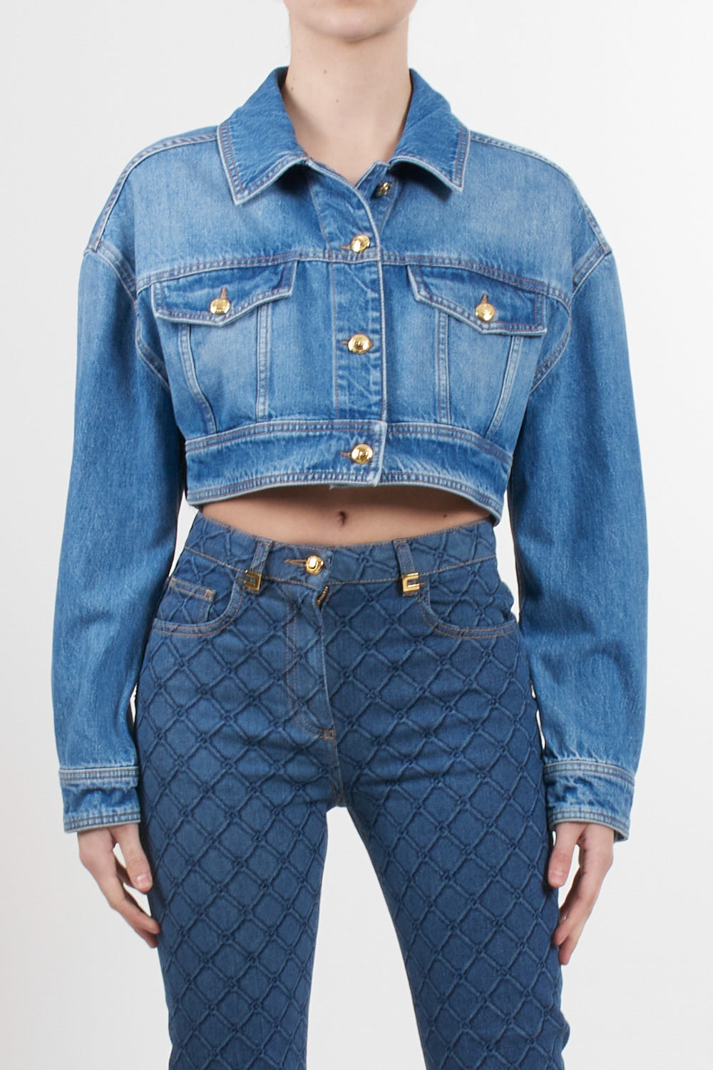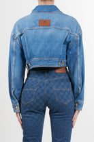 Elisabetta Franchi denim crop jacket, dropped shoulders and oversized sleeves, tobacco-colored stitching, gold metal logo buttons, logo label on the back, oversized fit