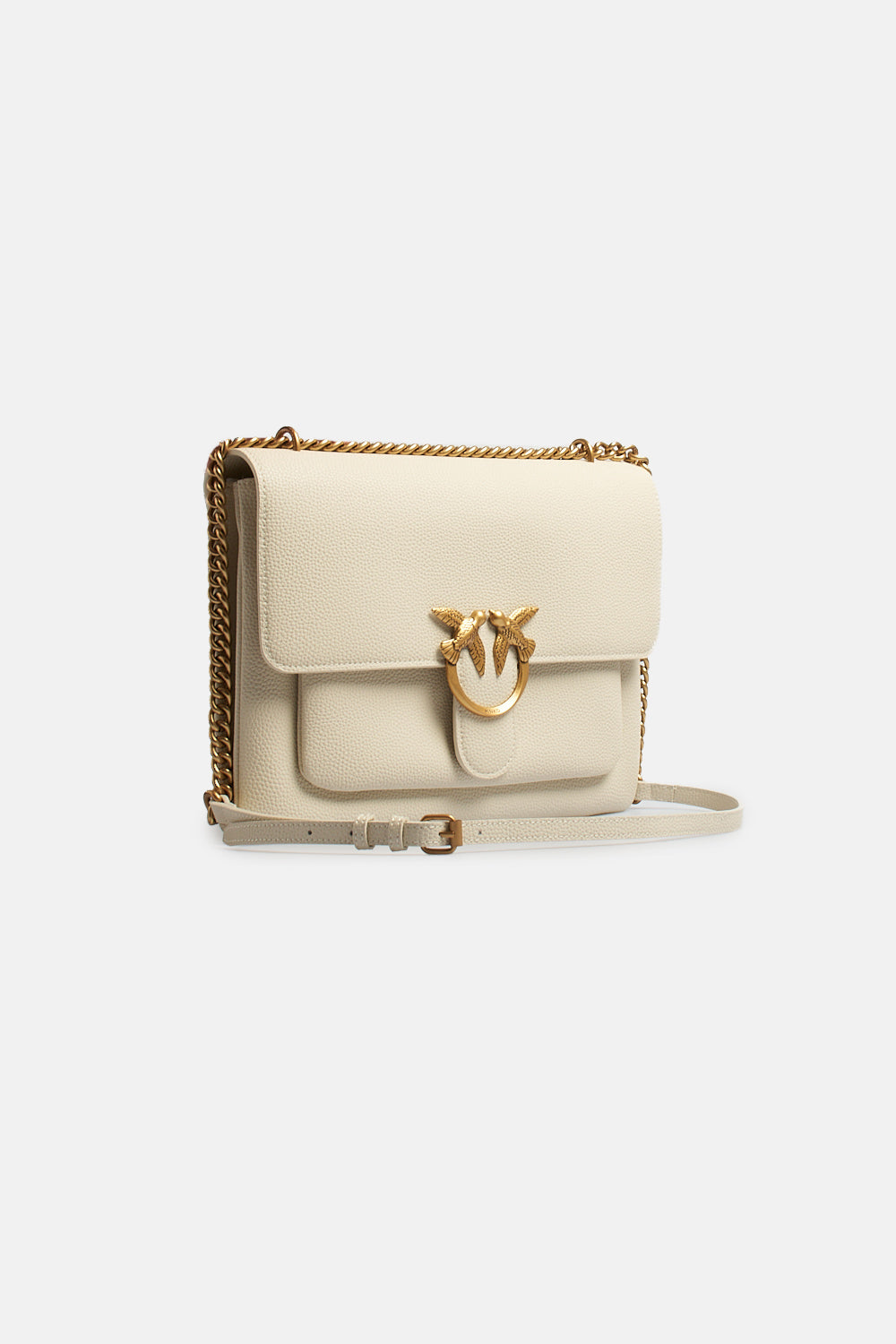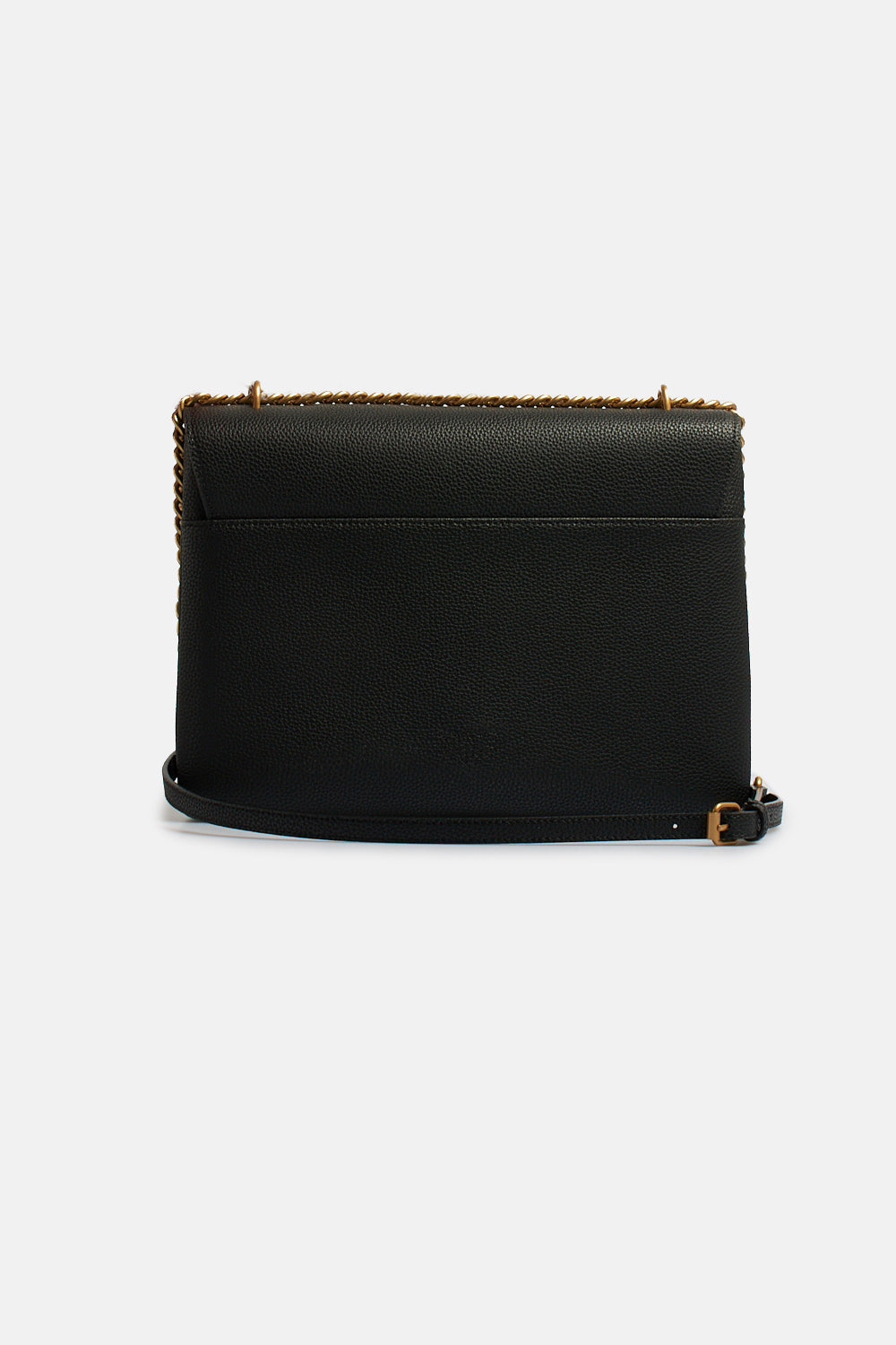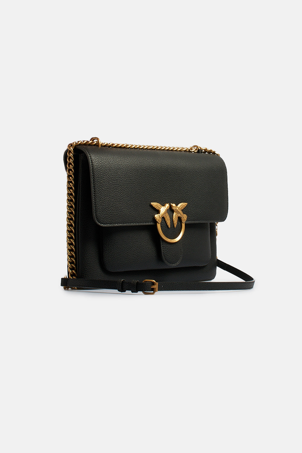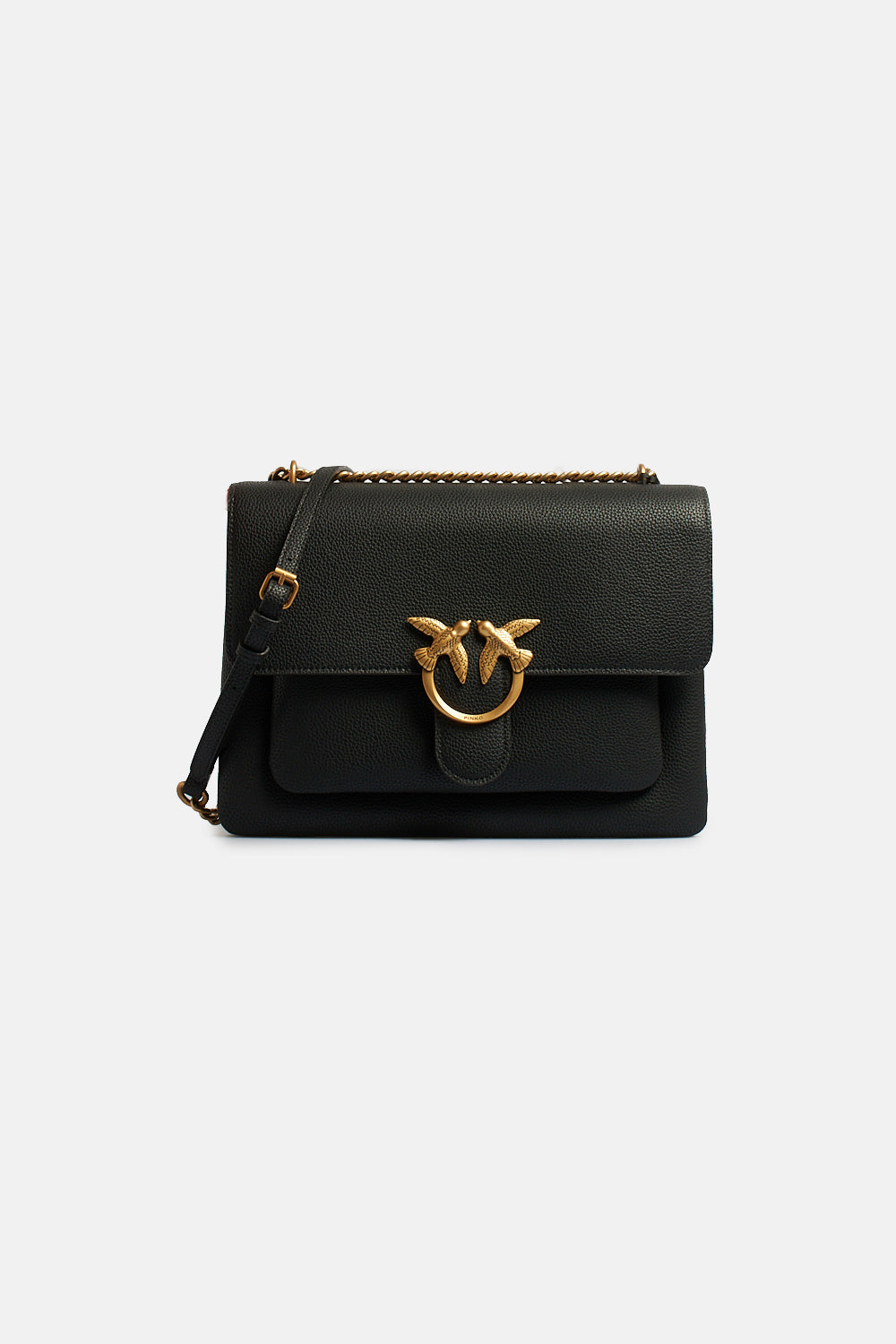 Love One Soft bag by Pinko made of tumbled leather, golden buckle with Love Birds swallow logo, golden chain shoulder strap and adjustable leather shoulder strap, flap and hook closure, three compartments
