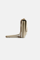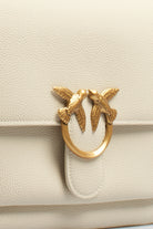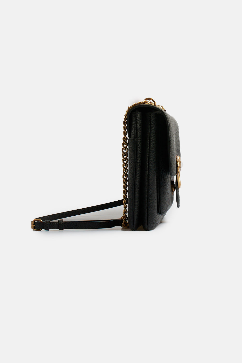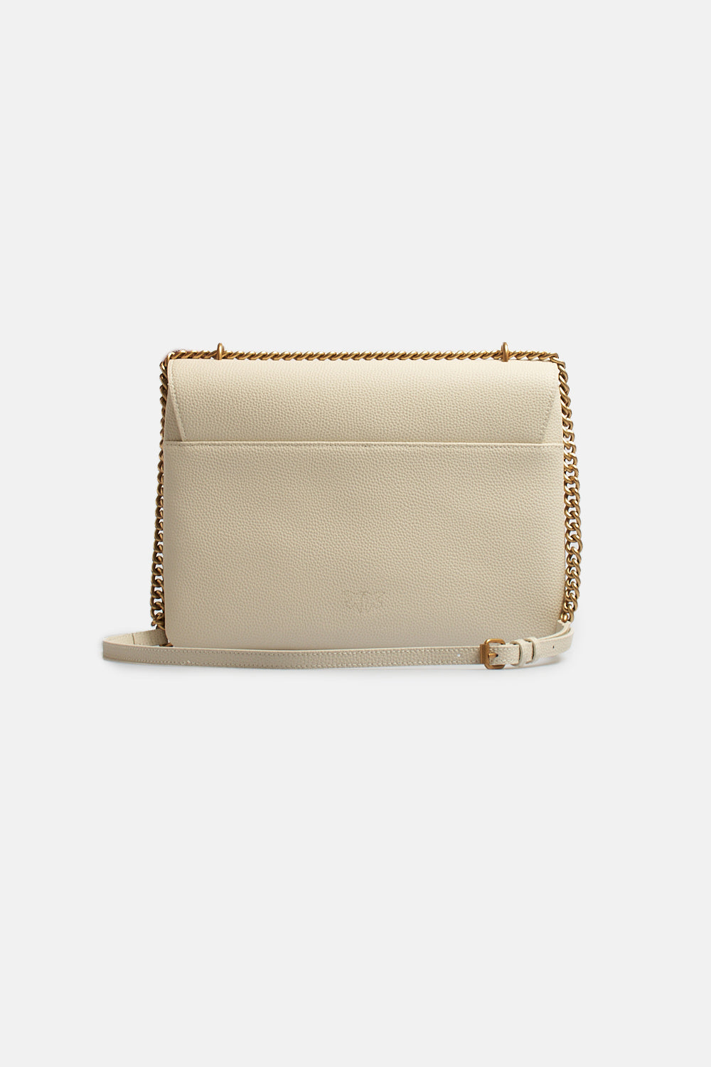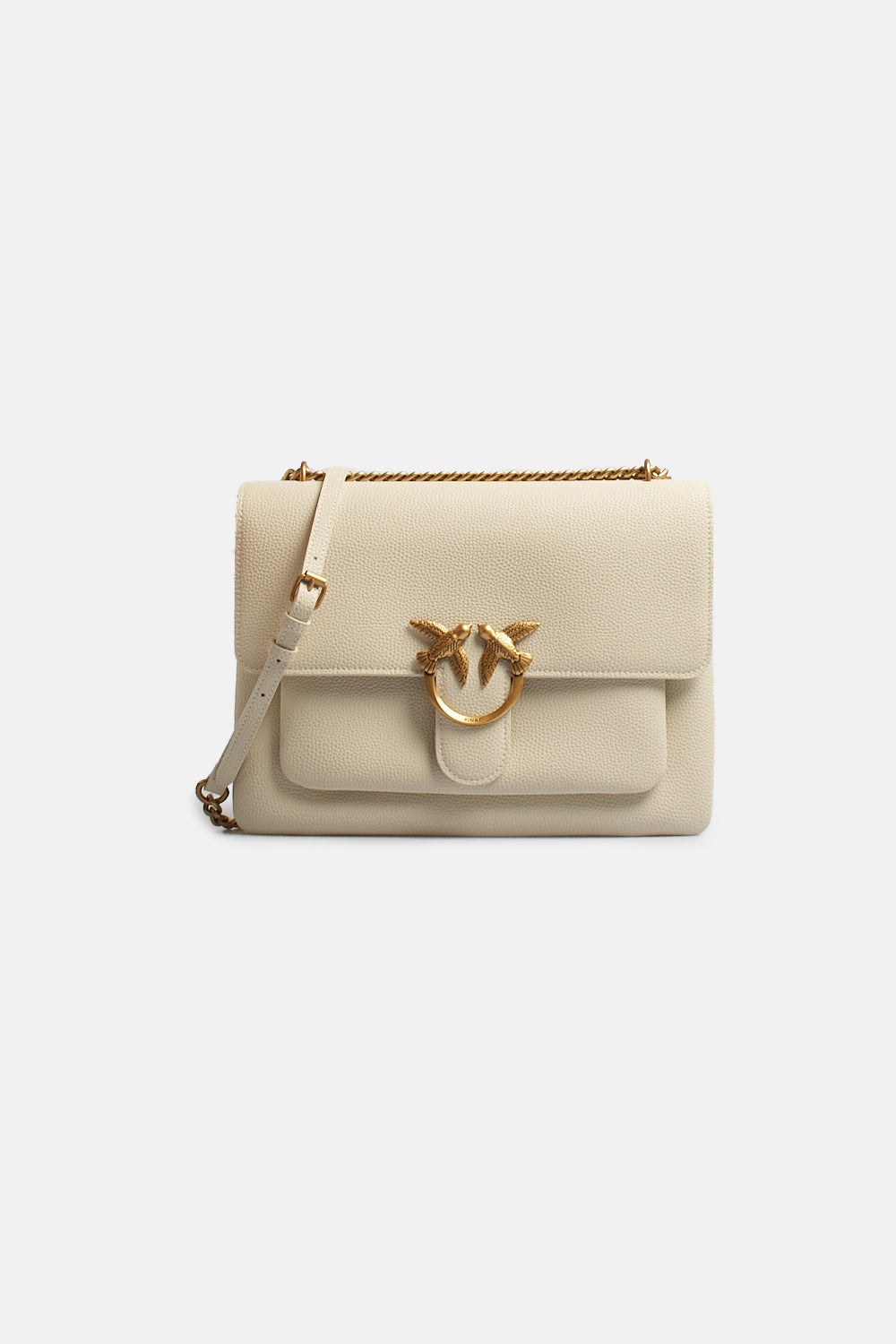 Love One Soft bag by Pinko made of tumbled leather, golden buckle with Love Birds swallow logo, golden chain shoulder strap and adjustable leather shoulder strap, flap and hook closure, three compartments