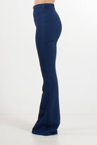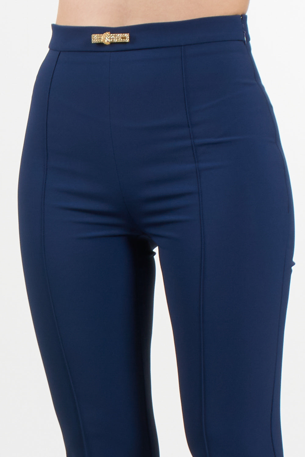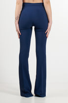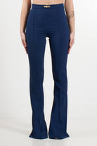 Flared trousers in light double crepe, featuring a tight fit on the hips and wide at the bottom. The model features a jewel detail with logo and rhinestones positioned on the waistband, adding a touch of brightness to the garment. The closure is with an invisible zip on the back, offering an elegant and sophisticated look.