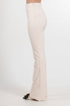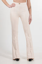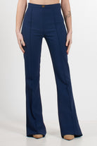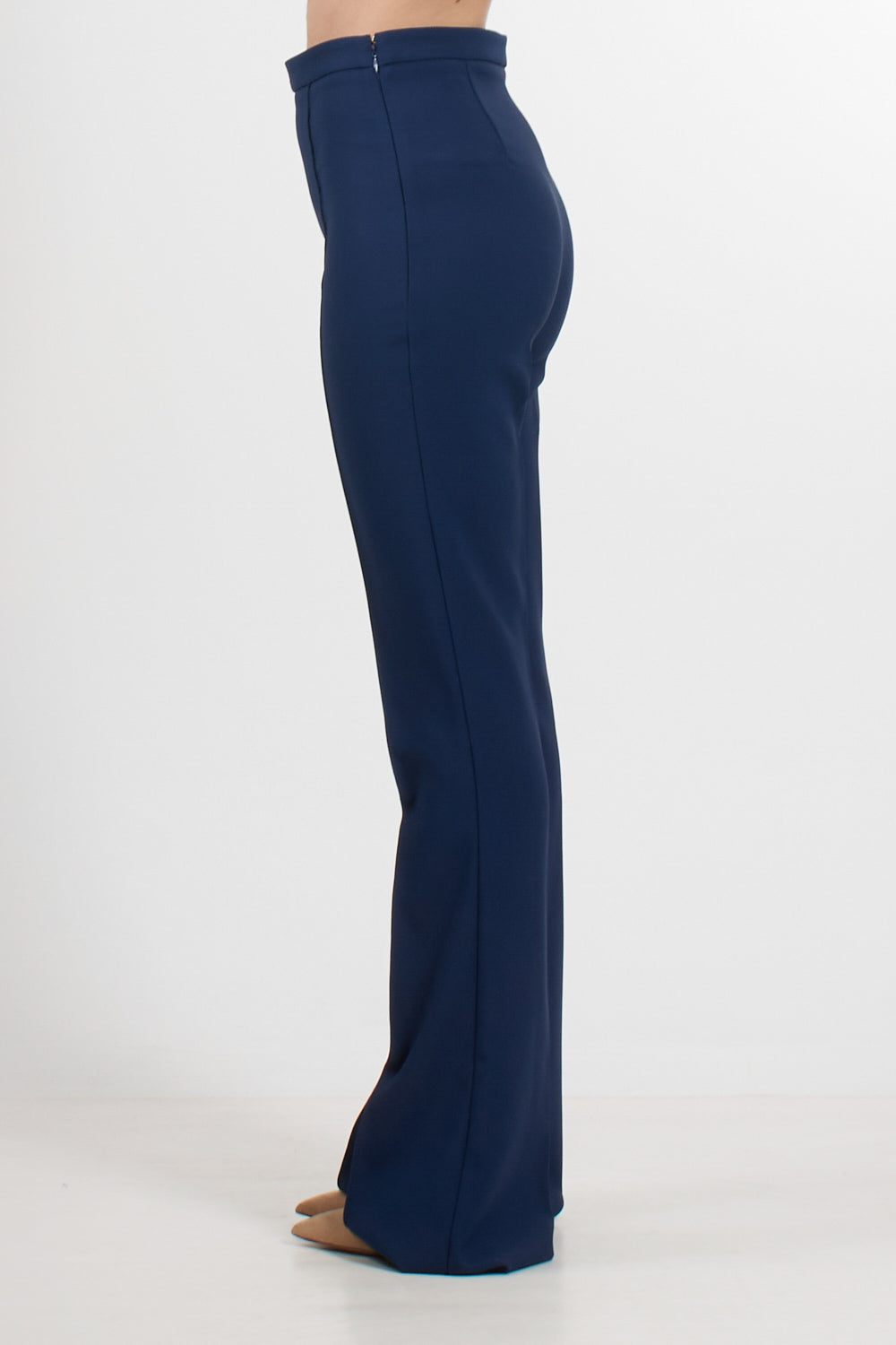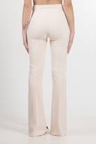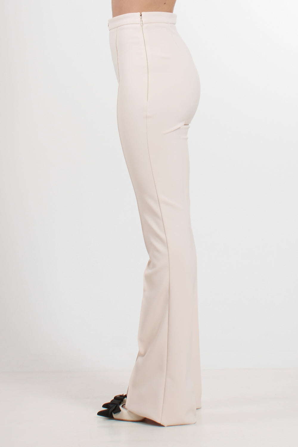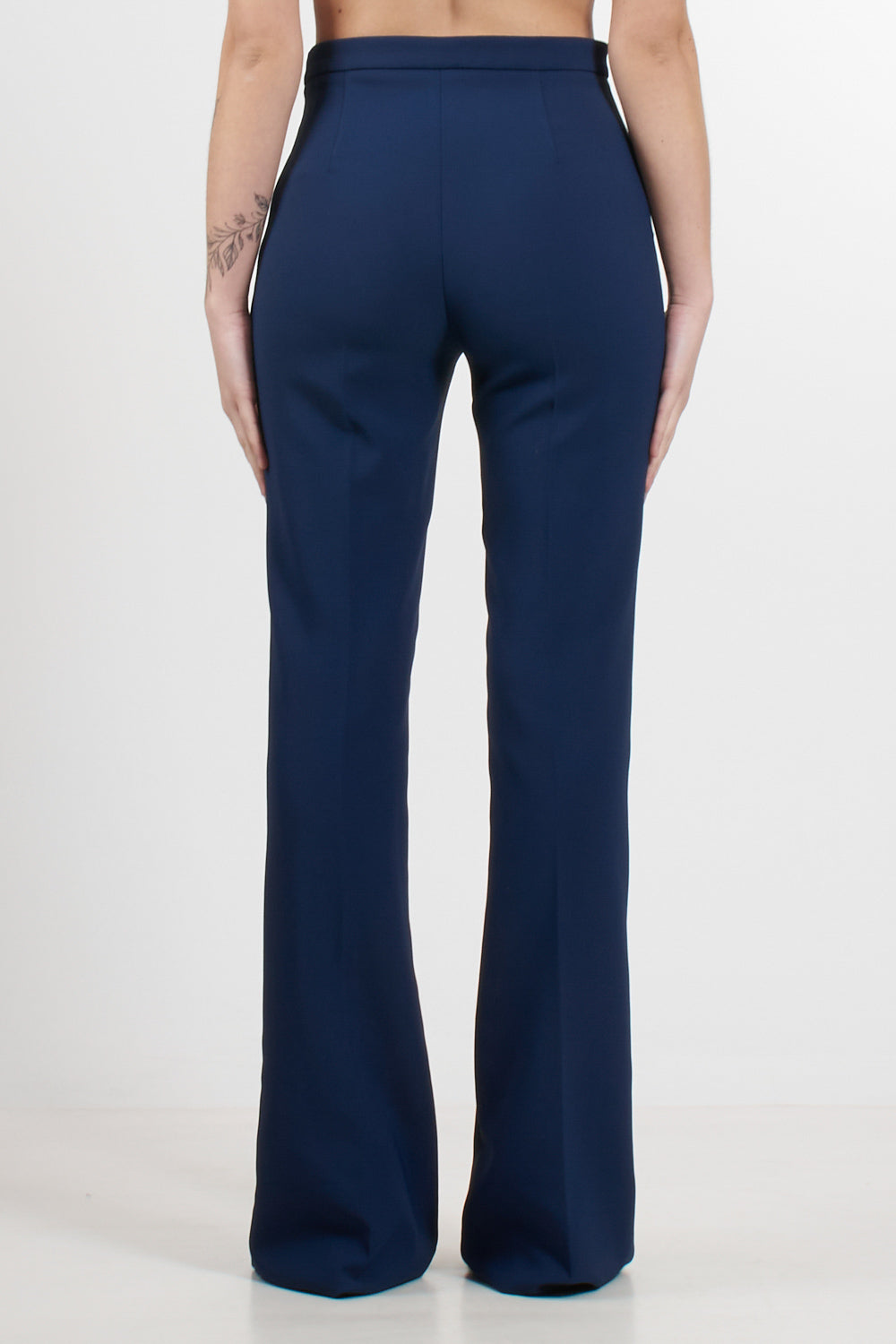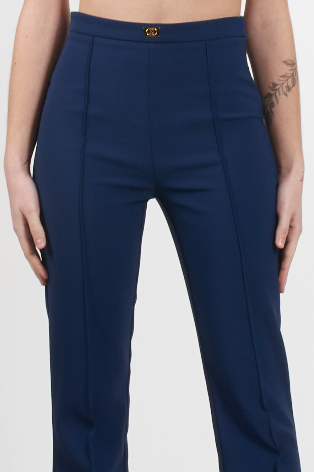 Elisabetta Franchi flared trousers in stretch crepe, flared leg at the bottom, gold metal logo plaque detail positioned on the waistband, tight fit