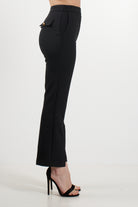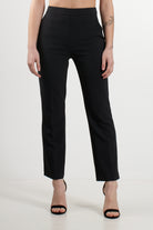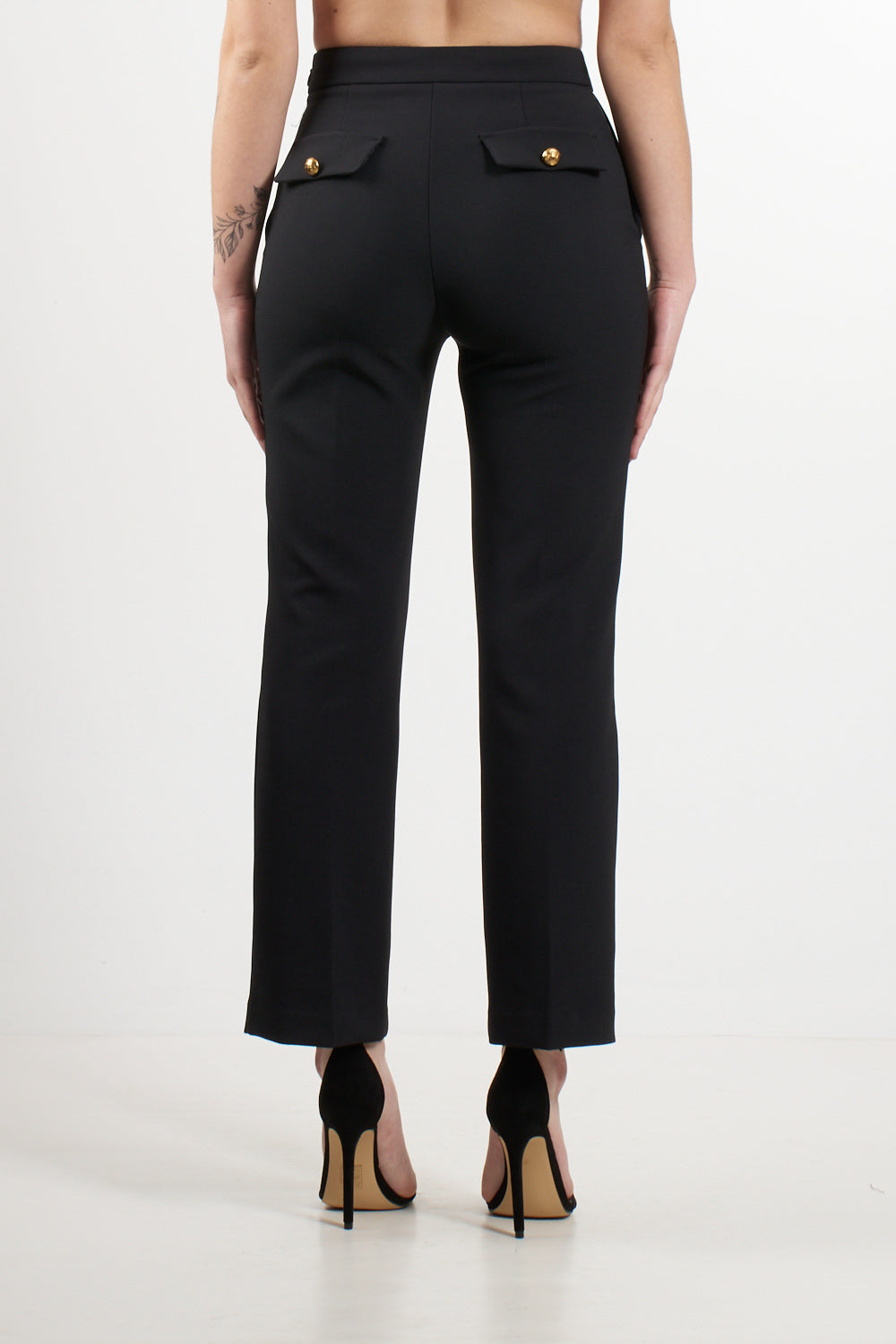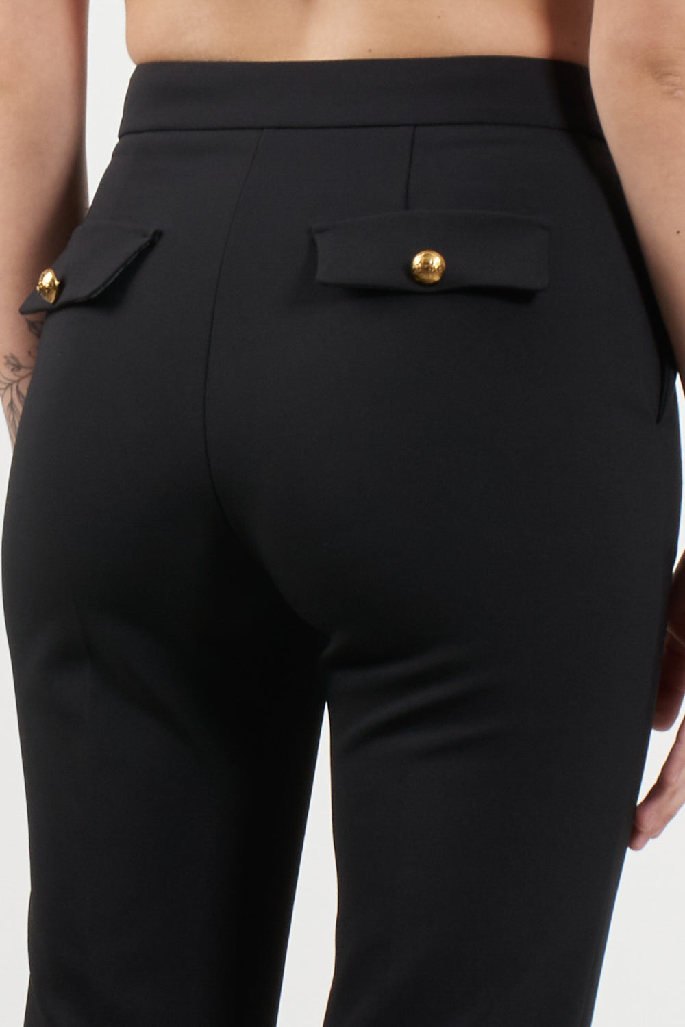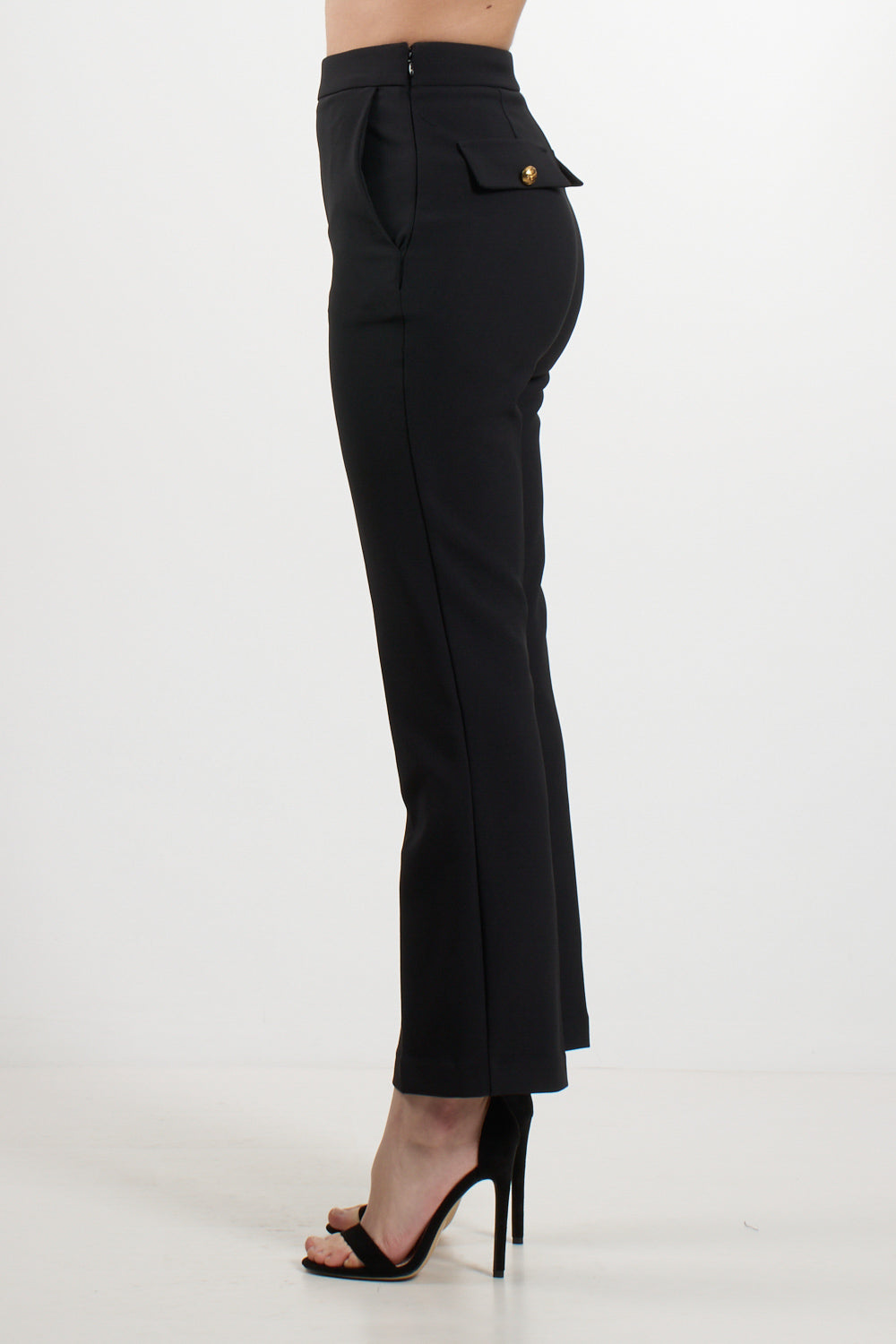 Stretch crepe cropped trousers featuring a slim fit and a slightly flared leg at the bottom. The model features an invisible side zip, French pockets and buttoned flaps on the back, offering an elegant and sophisticated look.