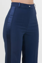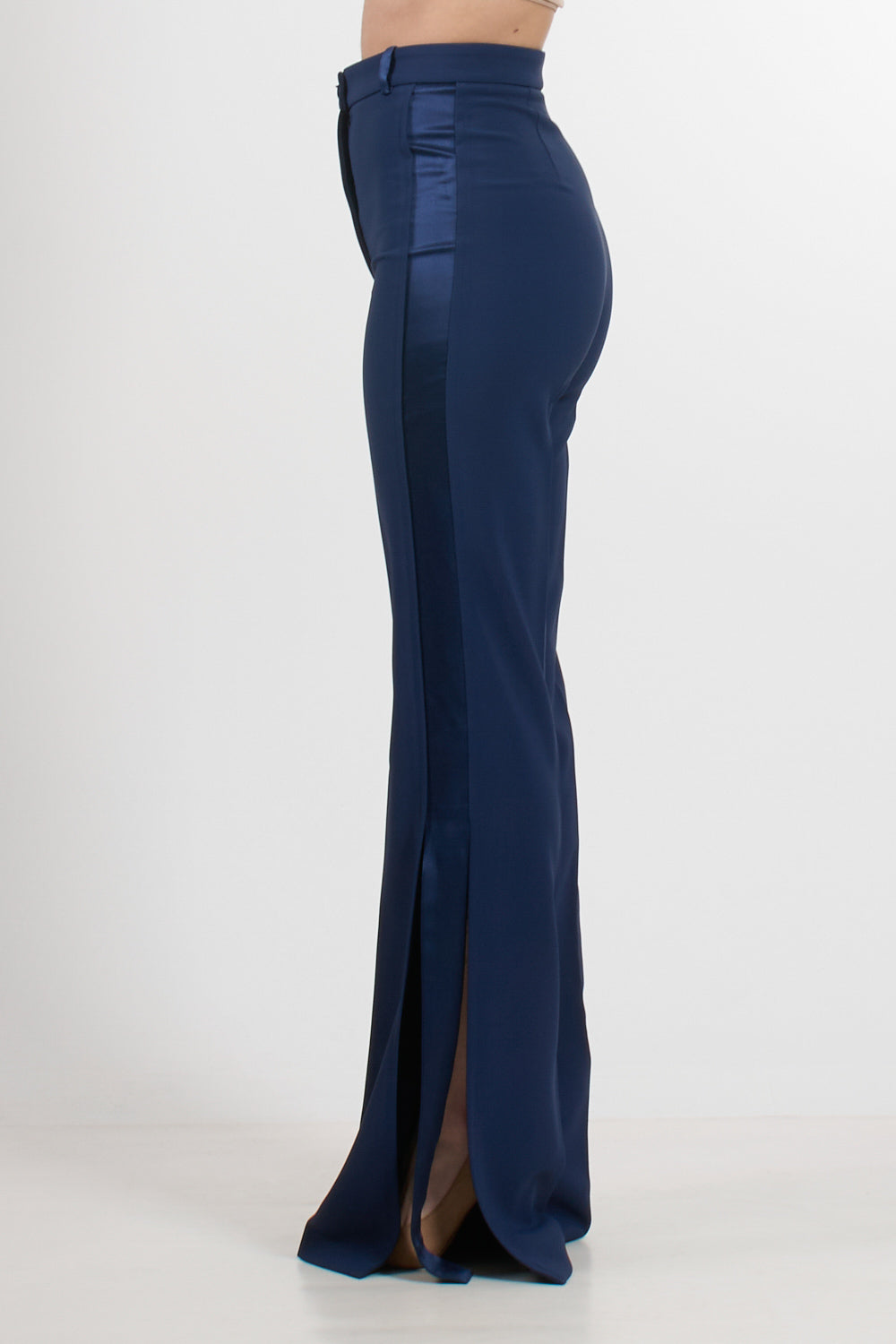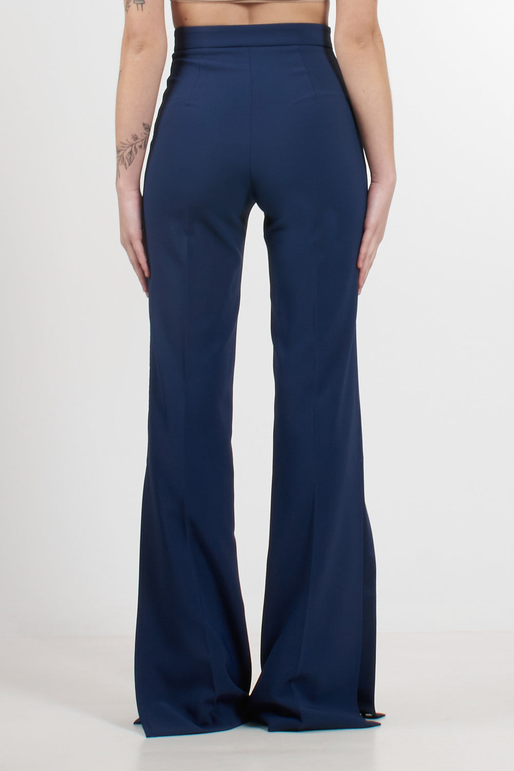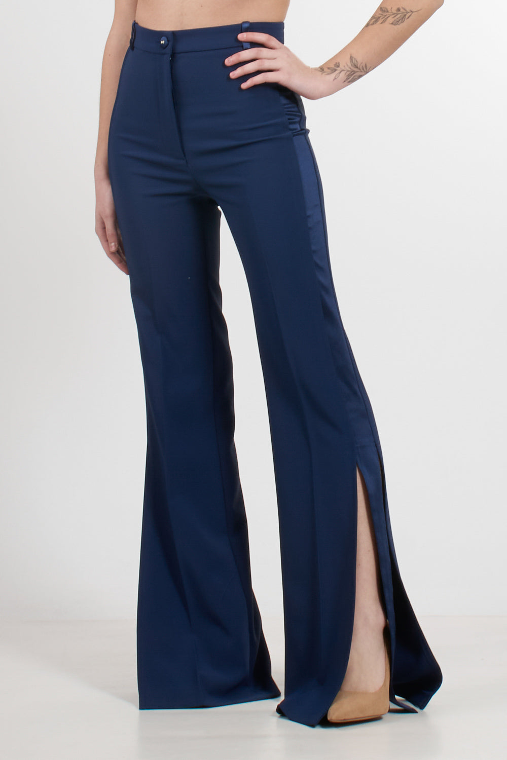 Elisabetta Franchi trousers in light crepe, tuxedo line, high waist, belt loops, fastening with logo button, no pockets, side bands in shiny satin up to the bottom to create large slits, tight fit