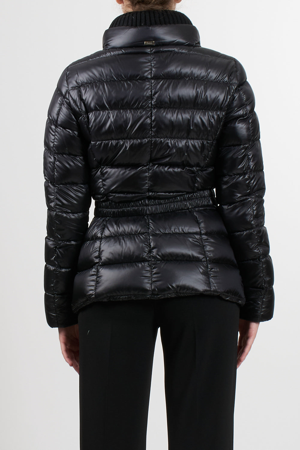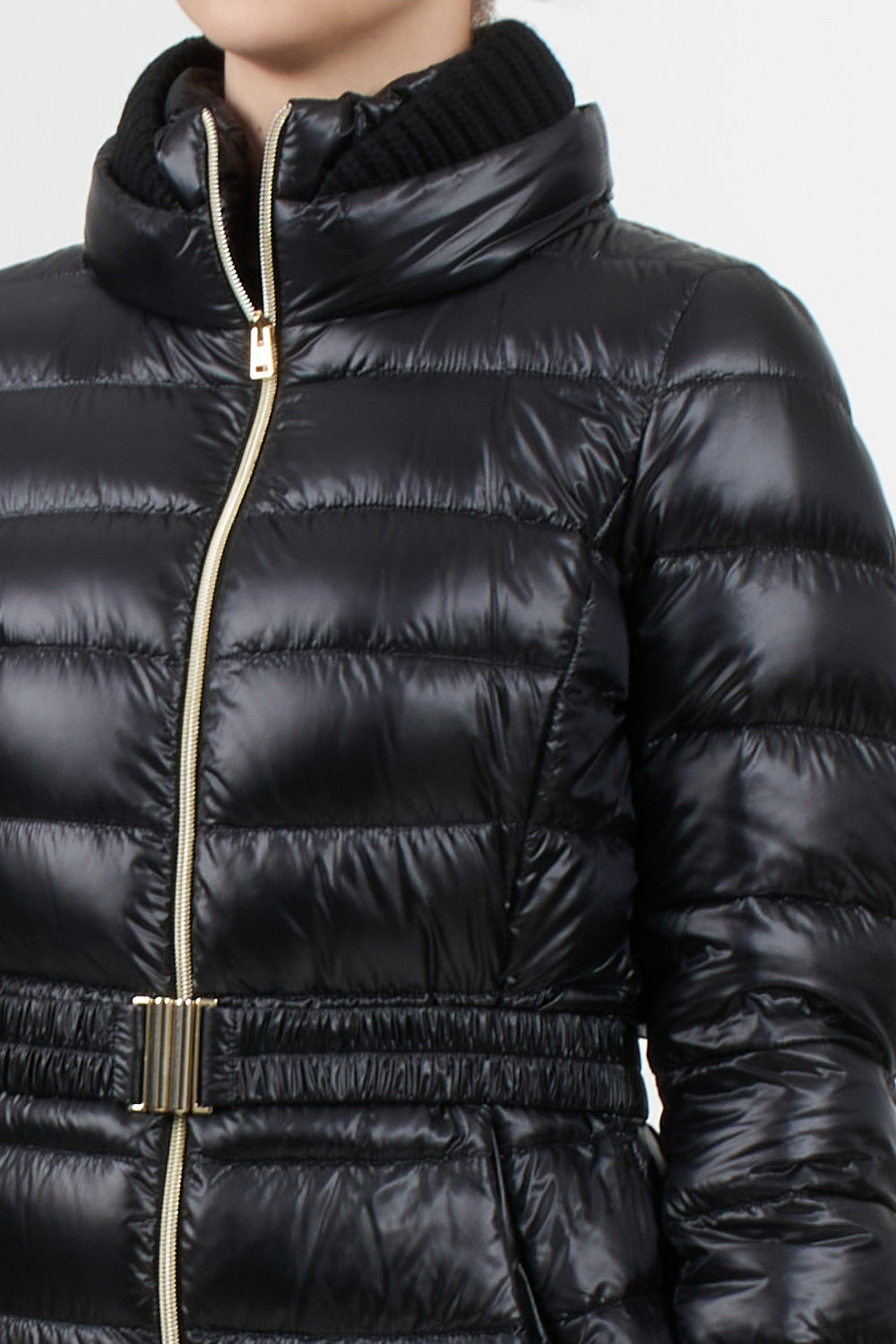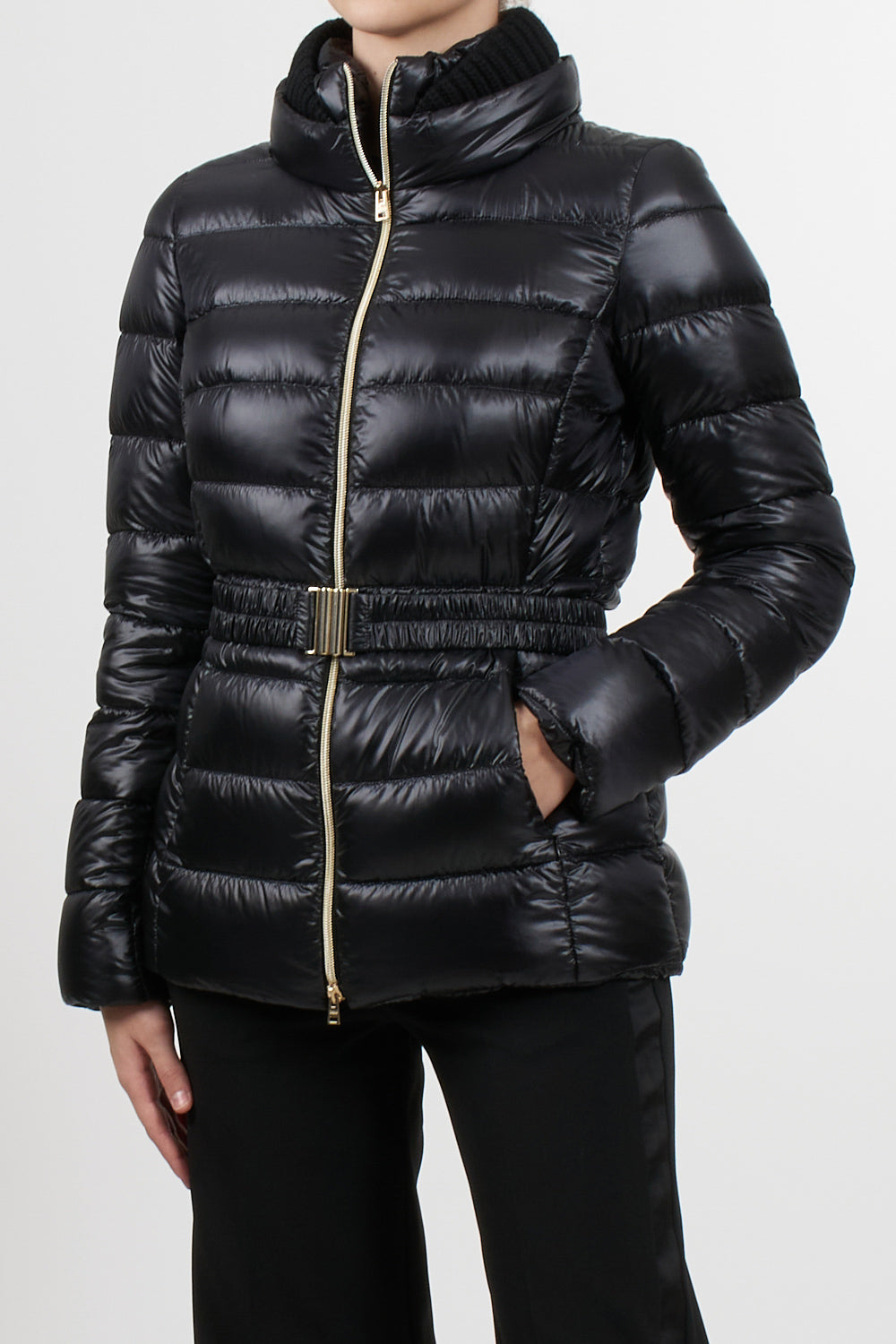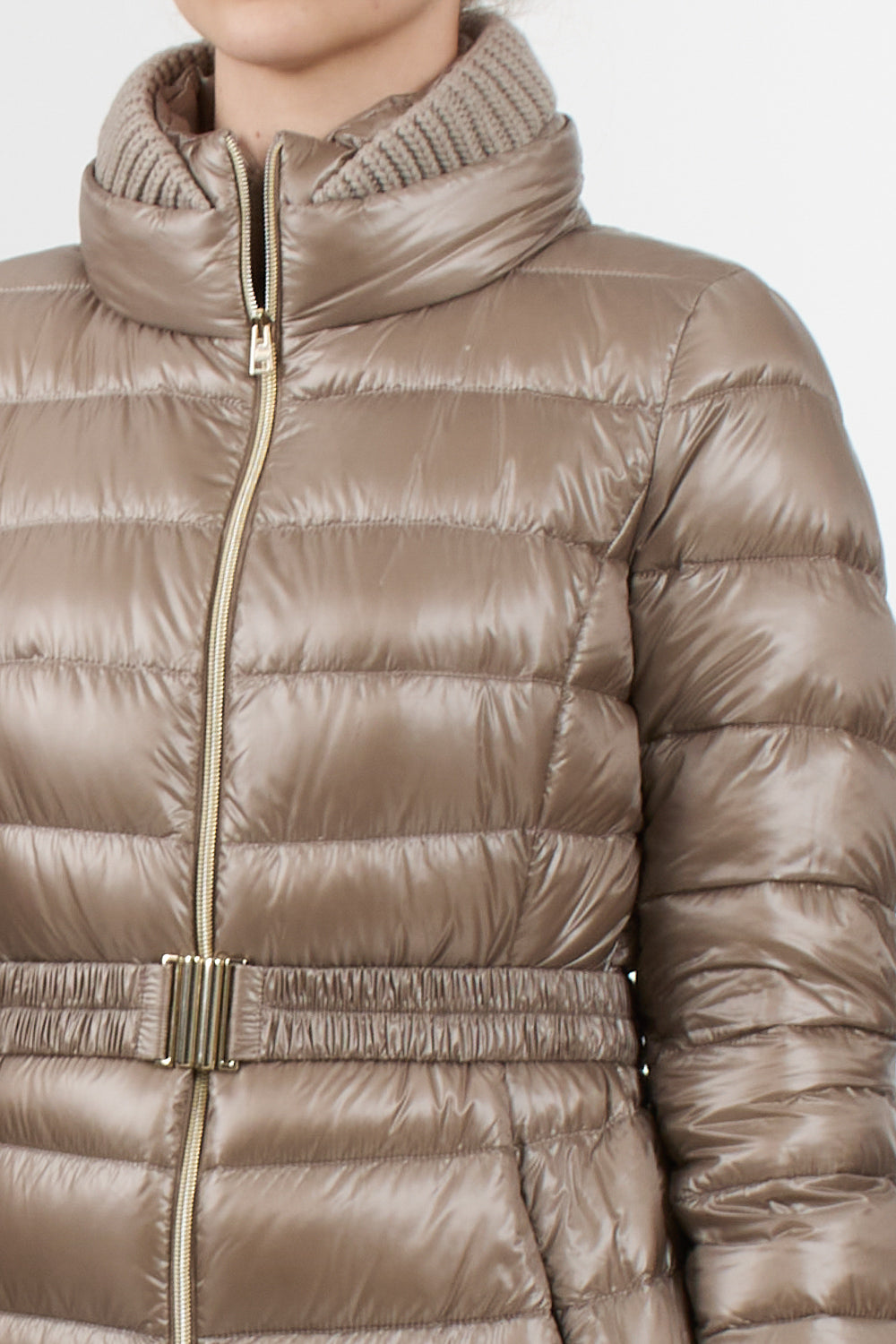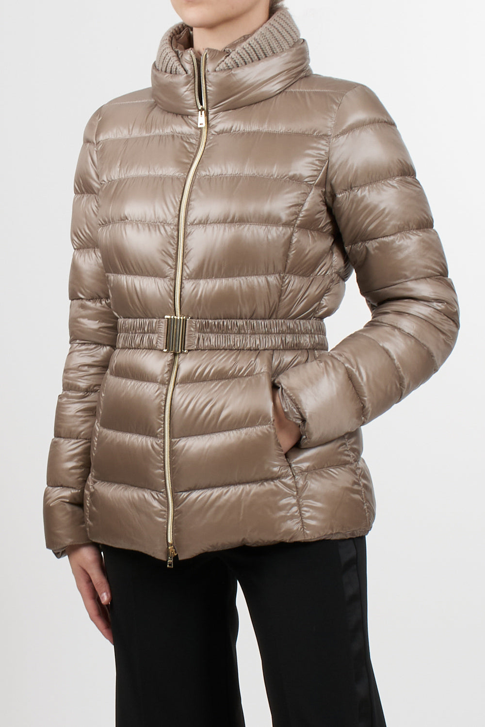 Claudia parka Herno casual sophisticated style, made with the iconic Herno ultralight nylon that combines water resistance and an extremely soft touch effect like silk, feather padding, slim design with high neck finished in English rib knit like the bottom and cuffs, double slider zip closure, elastic belt with metal buckle, pockets with invisible zip, slim fit