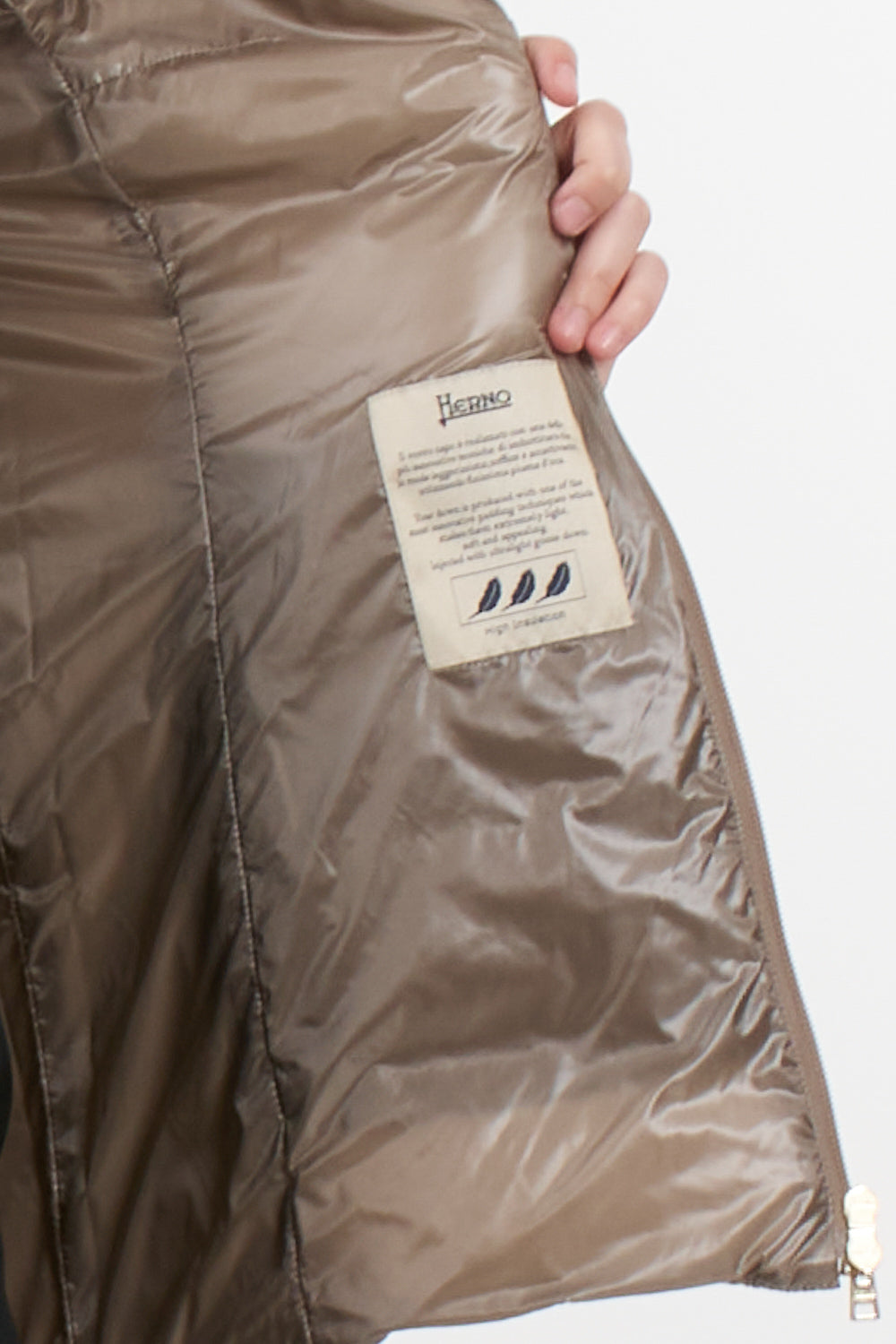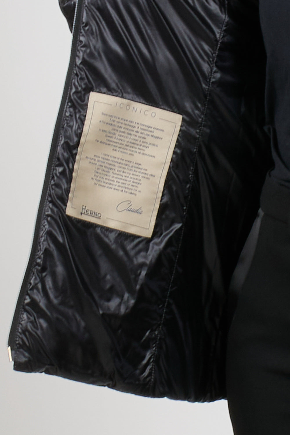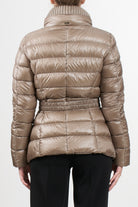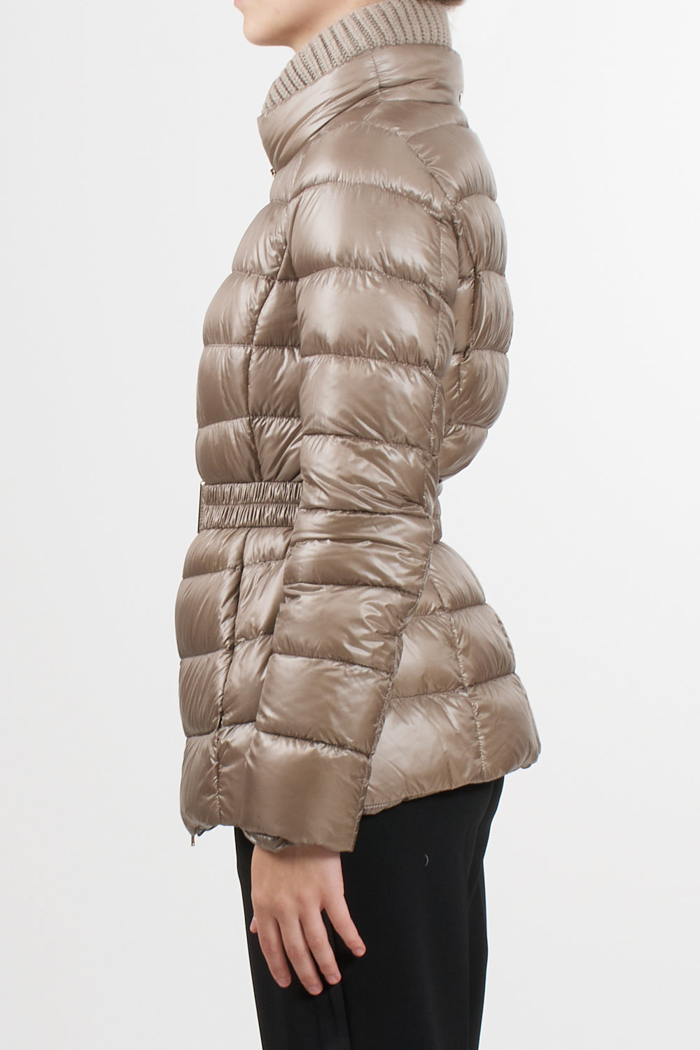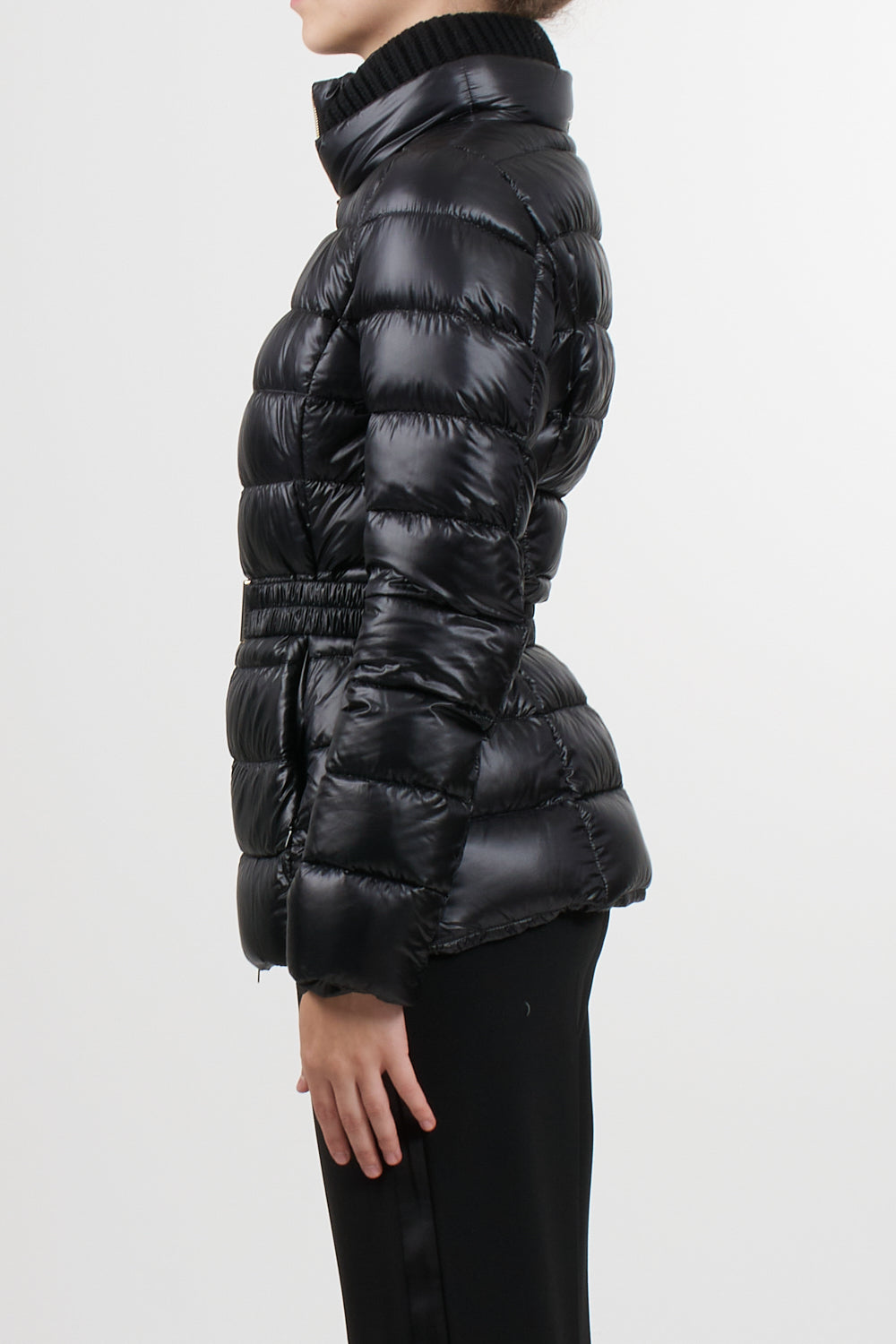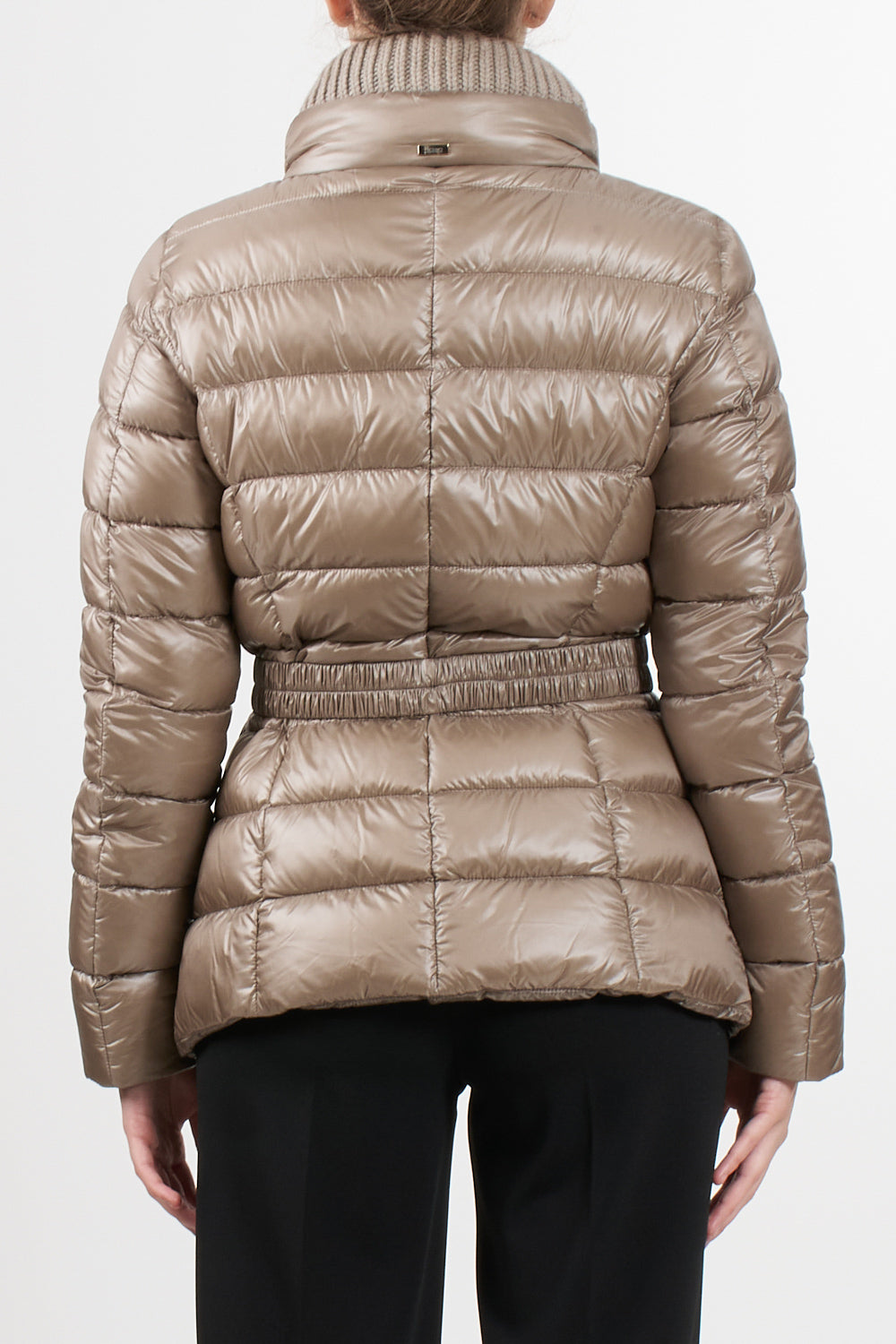 Claudia parka Herno casual sophisticated style, made with the iconic Herno ultralight nylon that combines water resistance and an extremely soft touch effect like silk, feather padding, slim design with high neck finished in English rib knit like the bottom and cuffs, double slider zip closure, elastic belt with metal buckle, pockets with invisible zip, slim fit