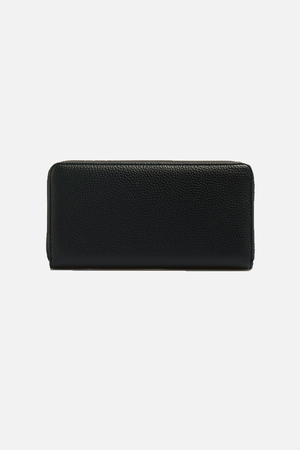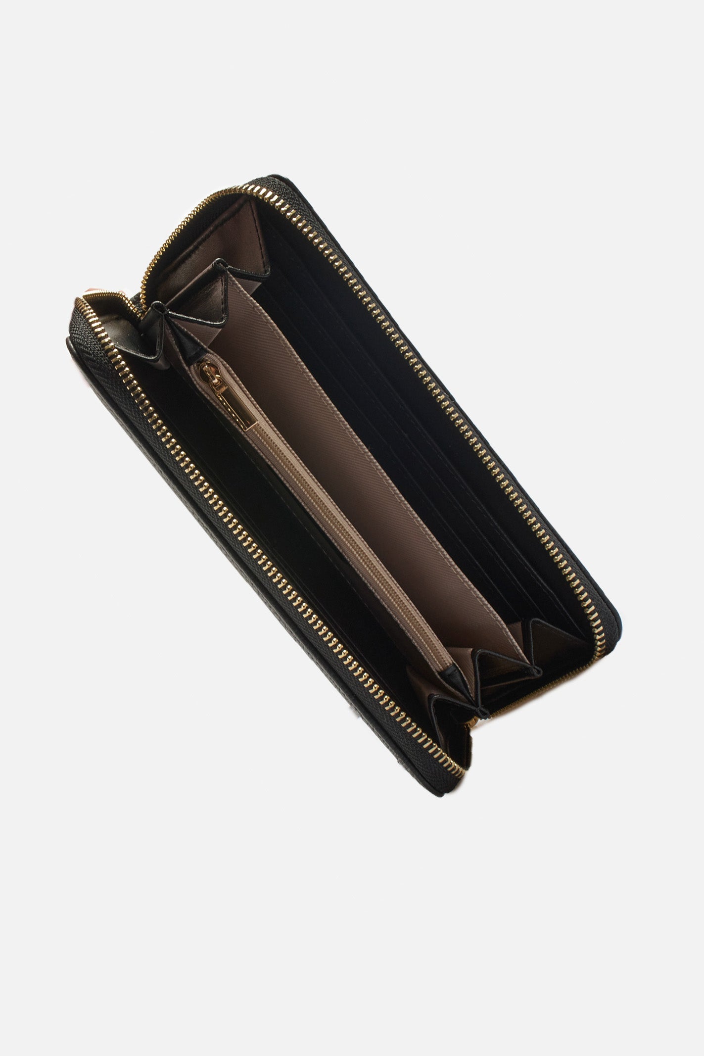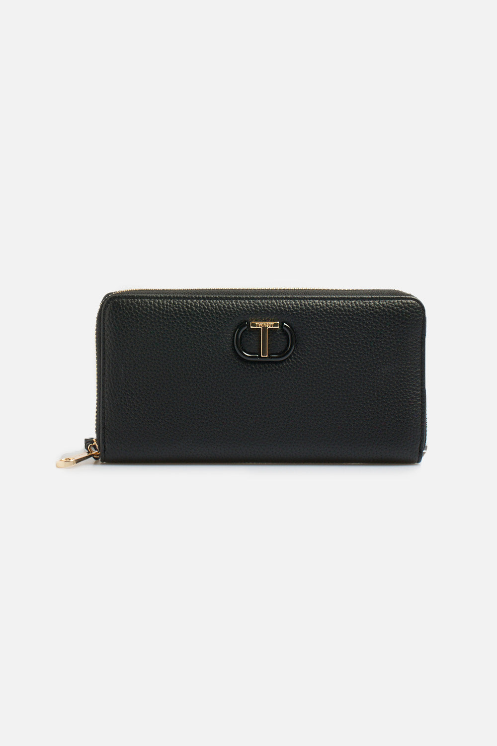 Timeless elegance and everyday practicality meet in this wallet by Twinset. Made of hammered leather , it is embellished with the iconic Oval T logo in tone- on - tone metal . Equipped with a perimeter zip , it has a roomy interior with multiple compartments , card holders and a central pocket with zip closure to neatly store coins and small objects .