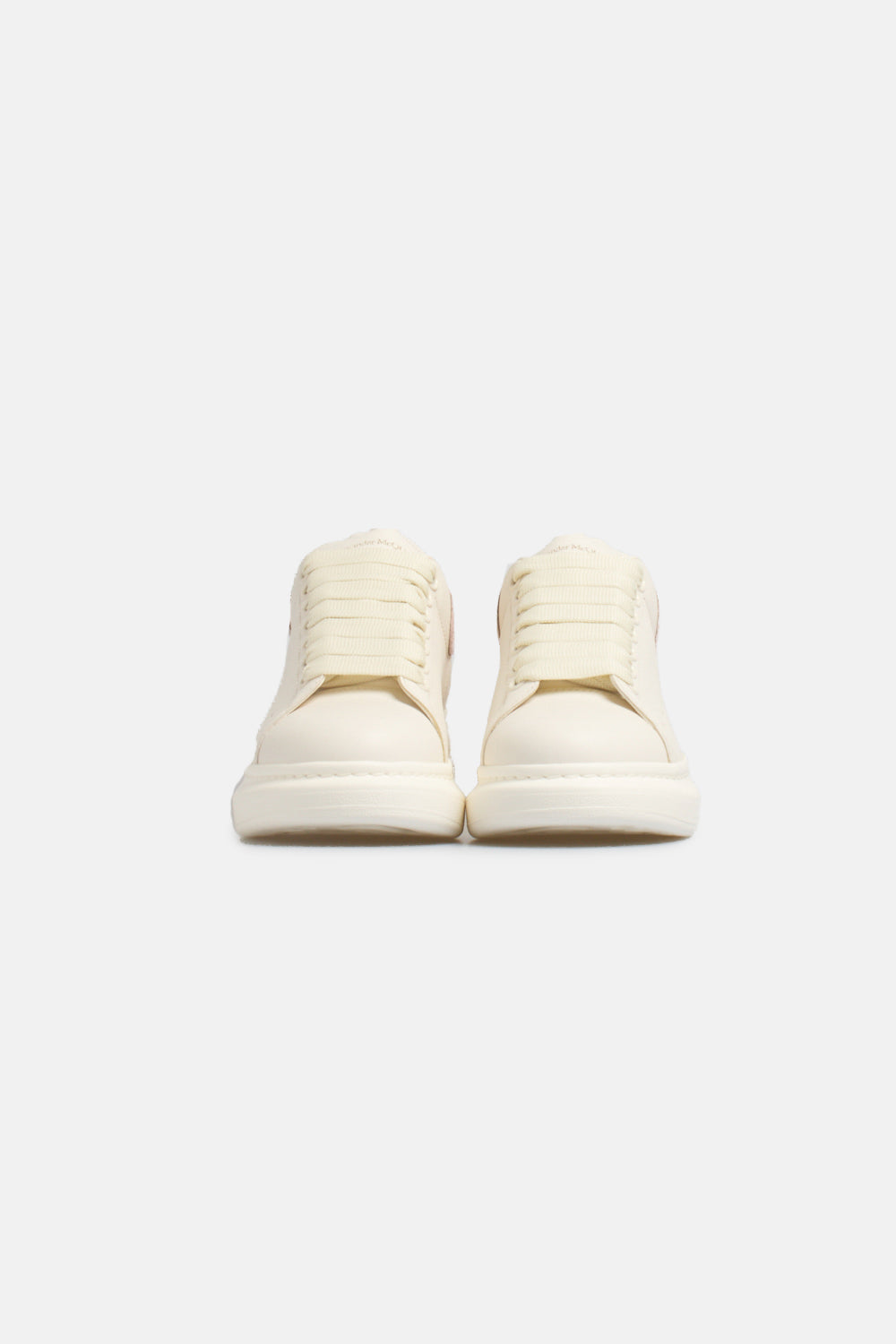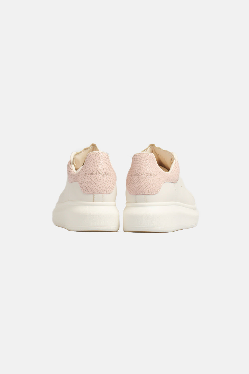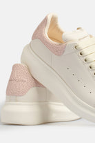 Alexander McQueen Oversize Sneaker in off-white leather and pink crackle effect spoiler, Alexander McQueen signature logo on the back and tongue, thick rubber sole