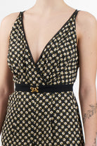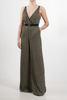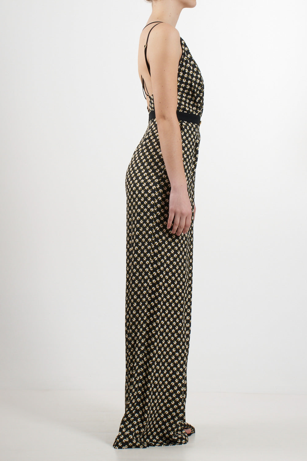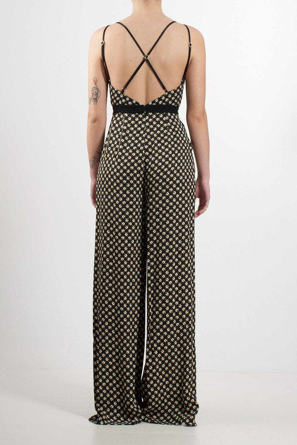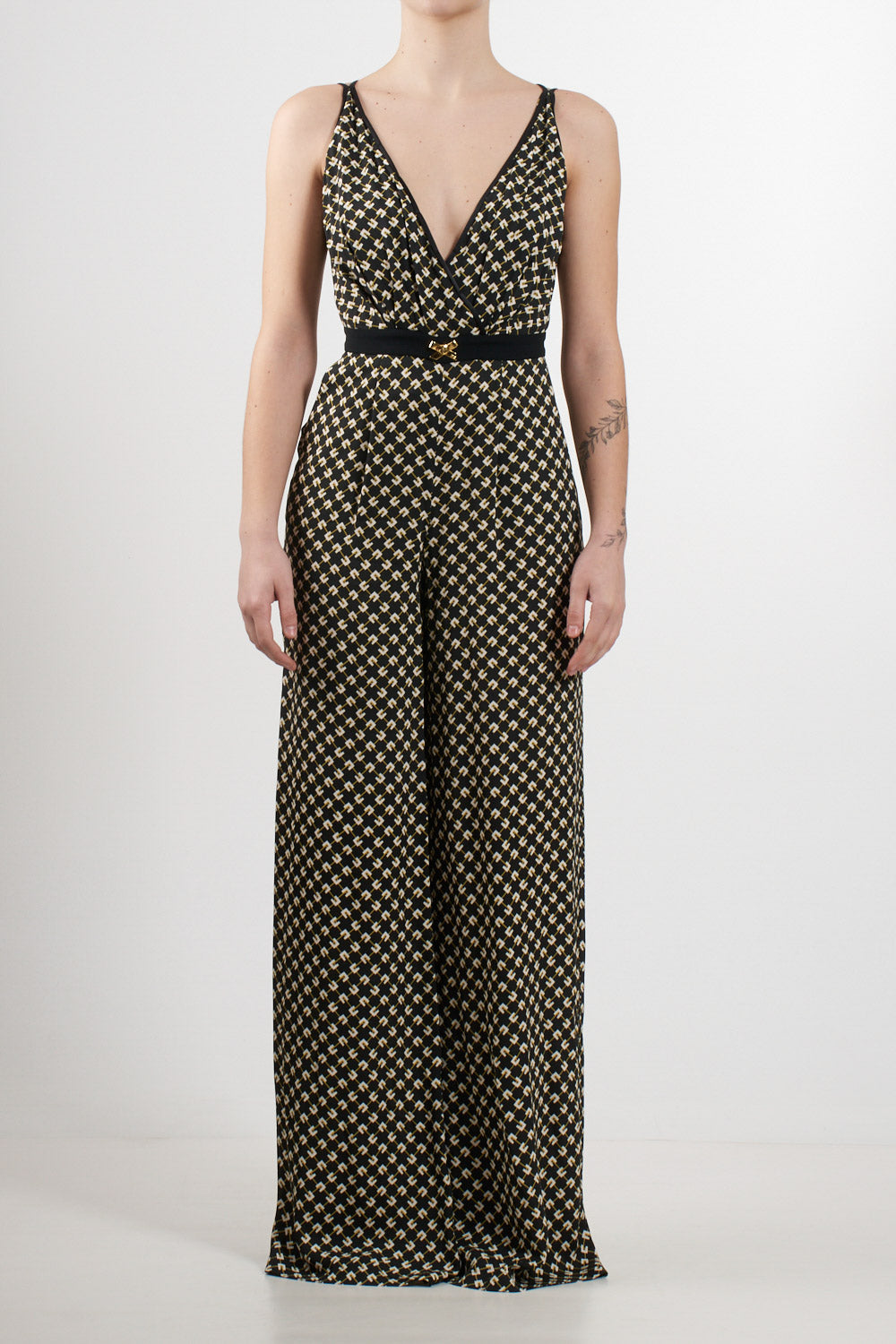 Elegant jumpsuit made of viscose georgette, featuring an all-over diamond print. The model features a wrap neckline, palazzo pants and adjustable shoulder straps. The waist is highlighted by a strap with a jeweled bow and logo, while the closure is entrusted to an invisible zip on the side. The slim fit enhances the silhouette, offering a sophisticated and feminine look.