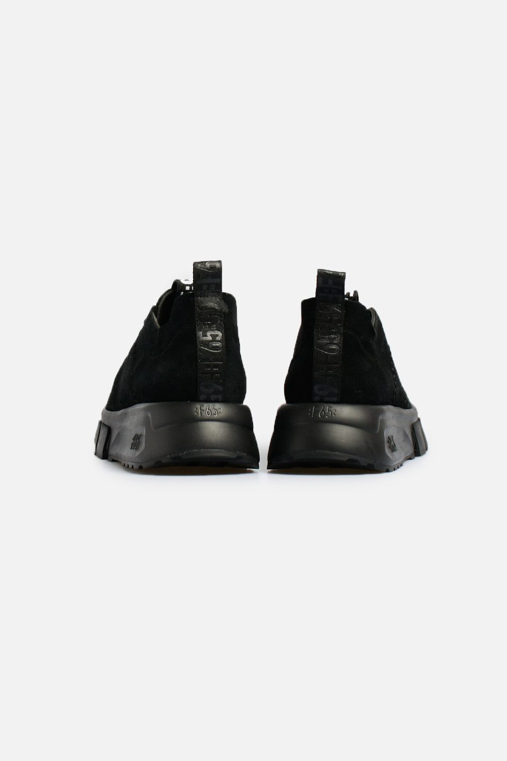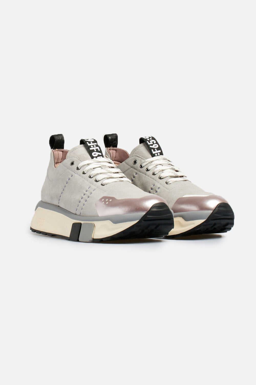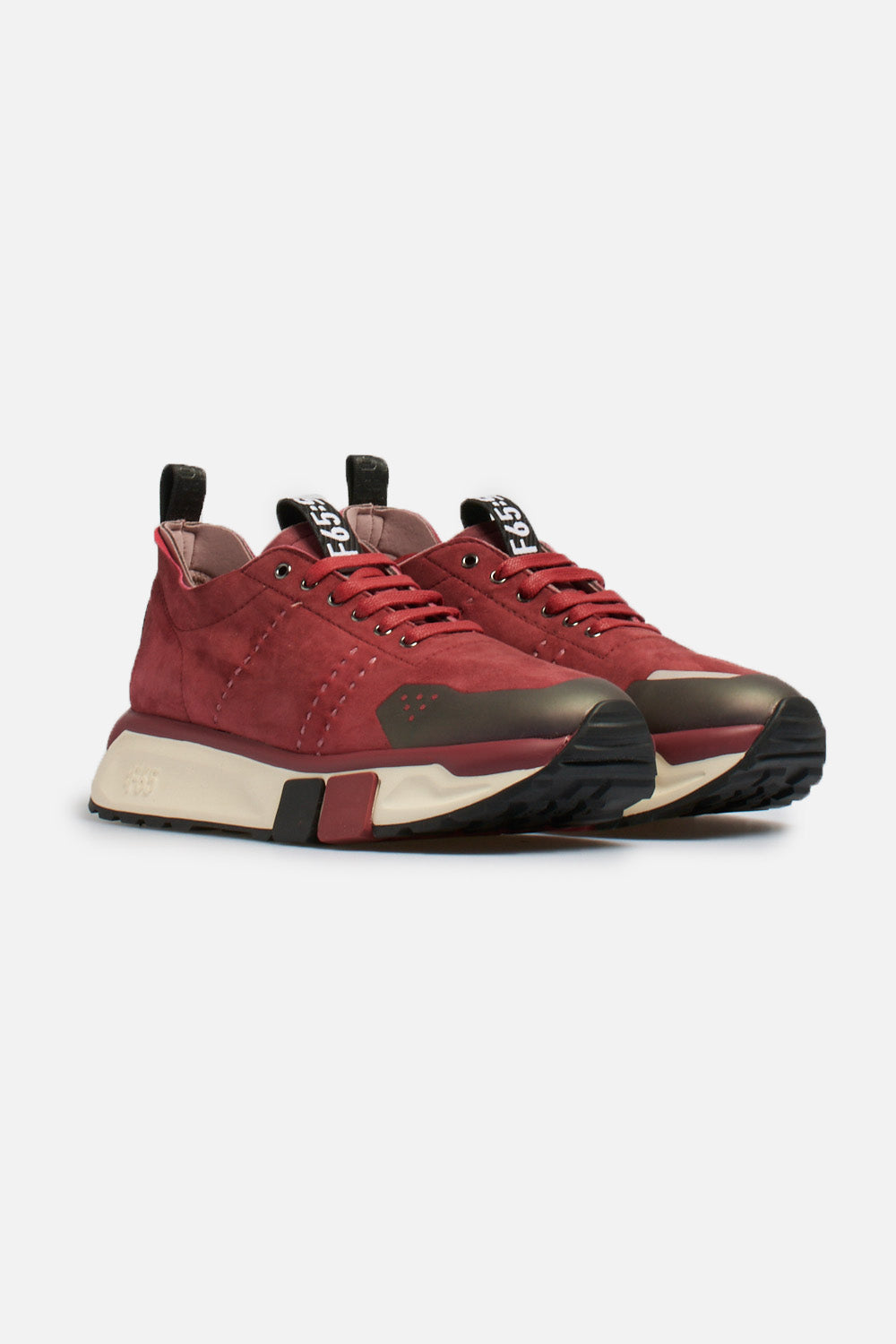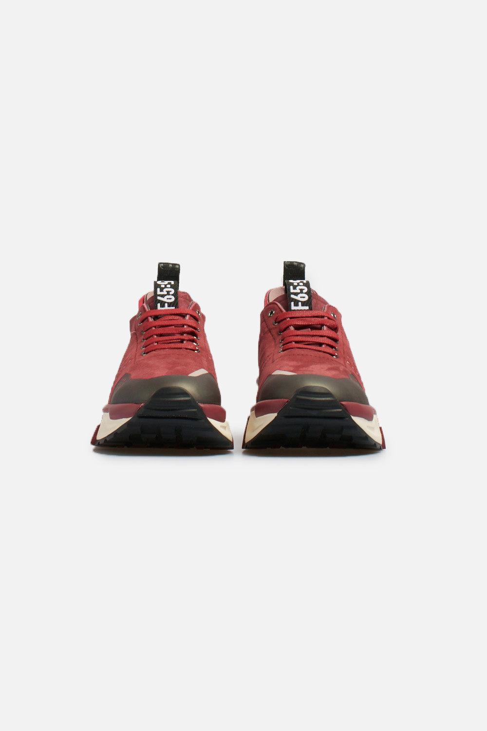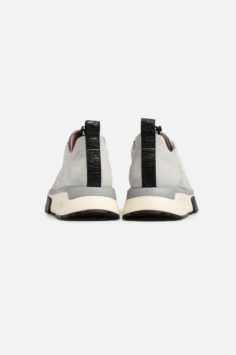 F65 sneakers, featuring a suede upper with contrasting shiny inserts on the toe. The oversized tongue with logo and technical details on the heel give it a dynamic, urban look. Rubber sole.