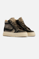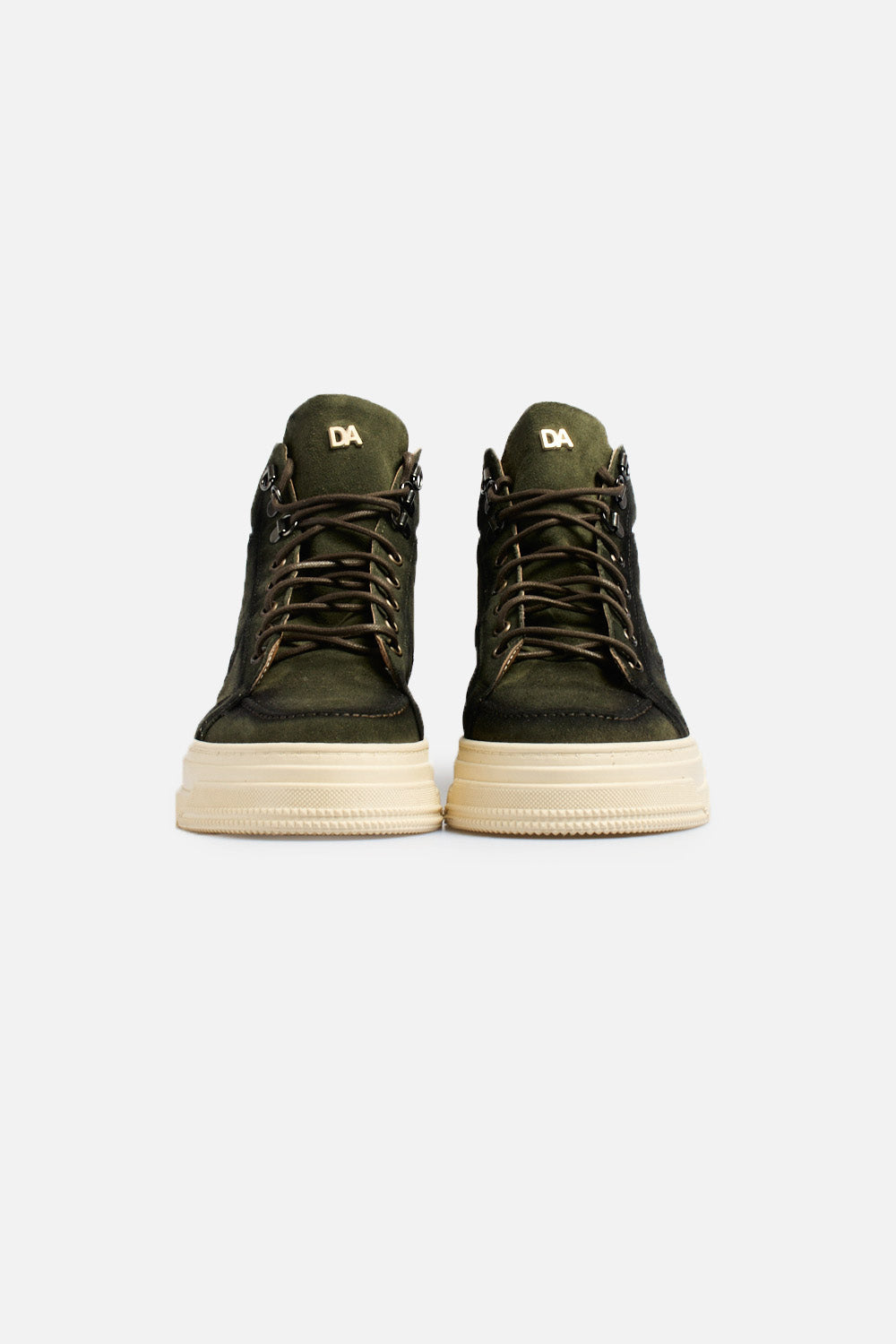 These Daniele Alessandrini sneakers, crafted from suede with a gradient effect, stand out for their modern design and structured upper with padded inserts. The thick, contoured beige rubber sole ensures comfort and stability, while the metal hooks and hiking-style lacing evoke the outdoors. A metal "DA" logo detail on the tongue.