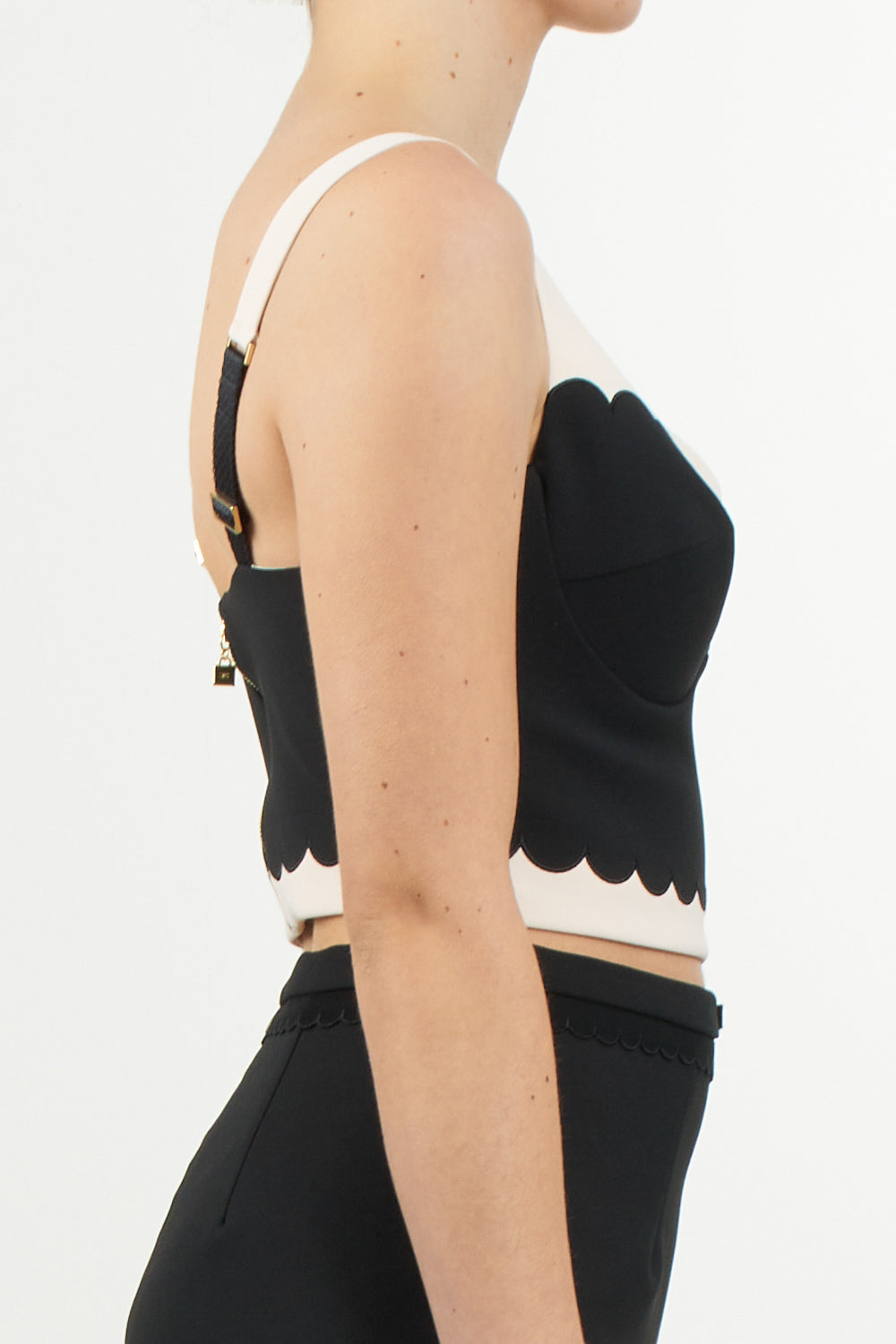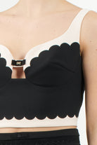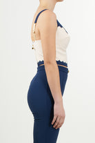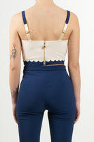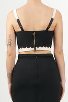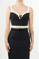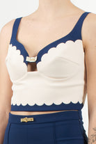 Elegant top in double stretch crepe, featuring a refined embroidered scalloped edge. The model features thin adjustable straps and a tight fit, offering a sophisticated and feminine look.