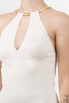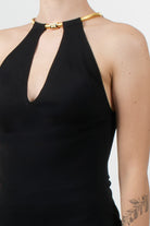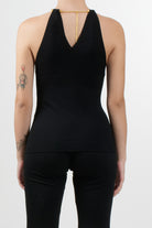 Slim-fit ribbed knit top featuring a deep halterneck on both the front and back. The distinctive element is the gold-tone metal jewel accessory with logo.