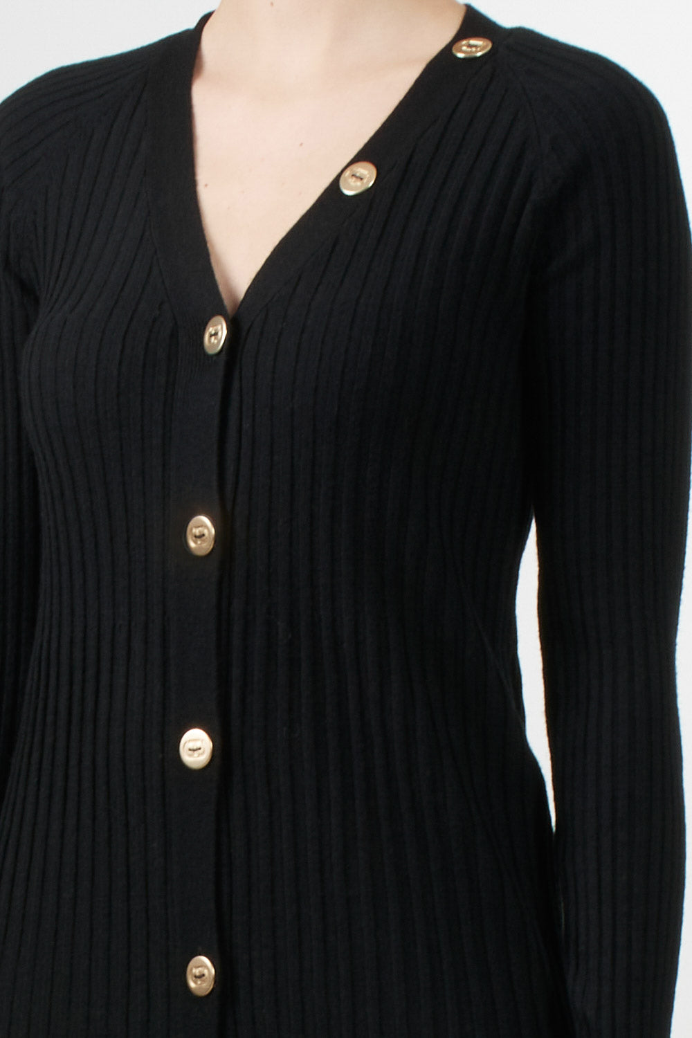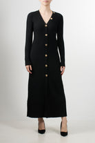 Maxi cardigan dress by Twinset in a wool and viscose blend with ribbed knit, V-neck, long sleeves, front fastening with logo buttons, finished with an Oval T logo plaque on the back