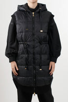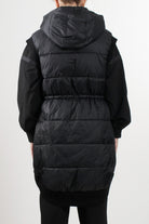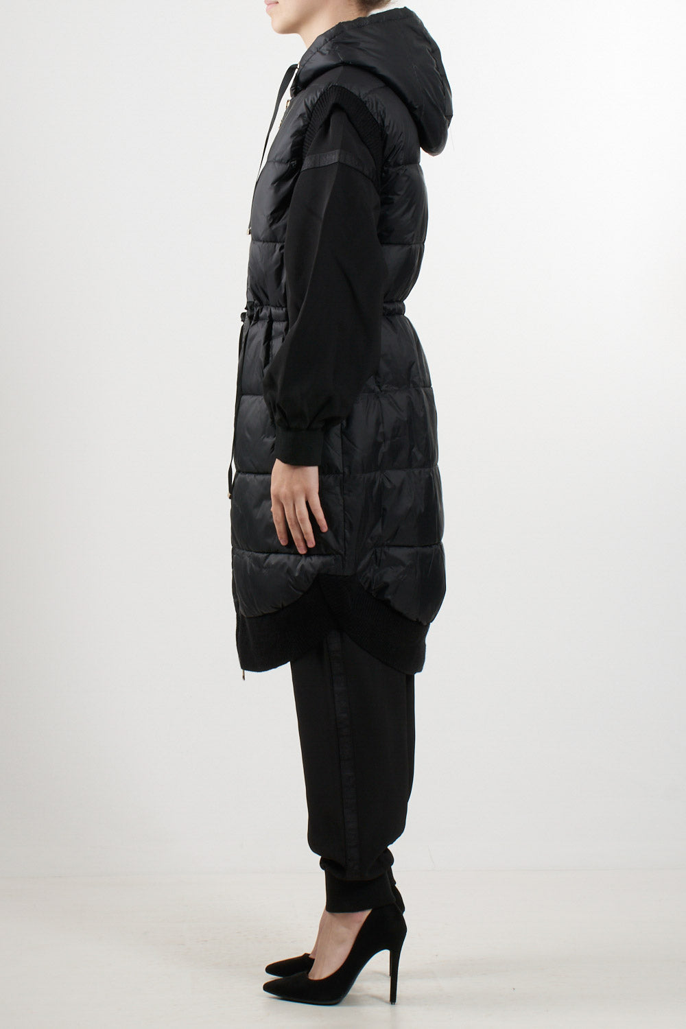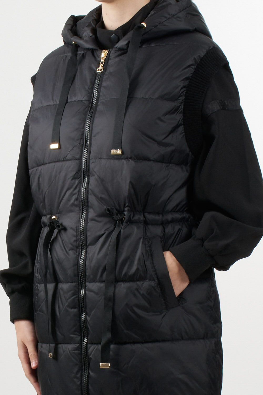 Twinset padded sleeveless jacket with an oversized fit, quilted technical fabric, adjustable hood with drawstring, front fastening with gold zip and adjustable waist with laces, knitted finishes on the hem and metal logo details complete the garment with a modern and sophisticated touch.