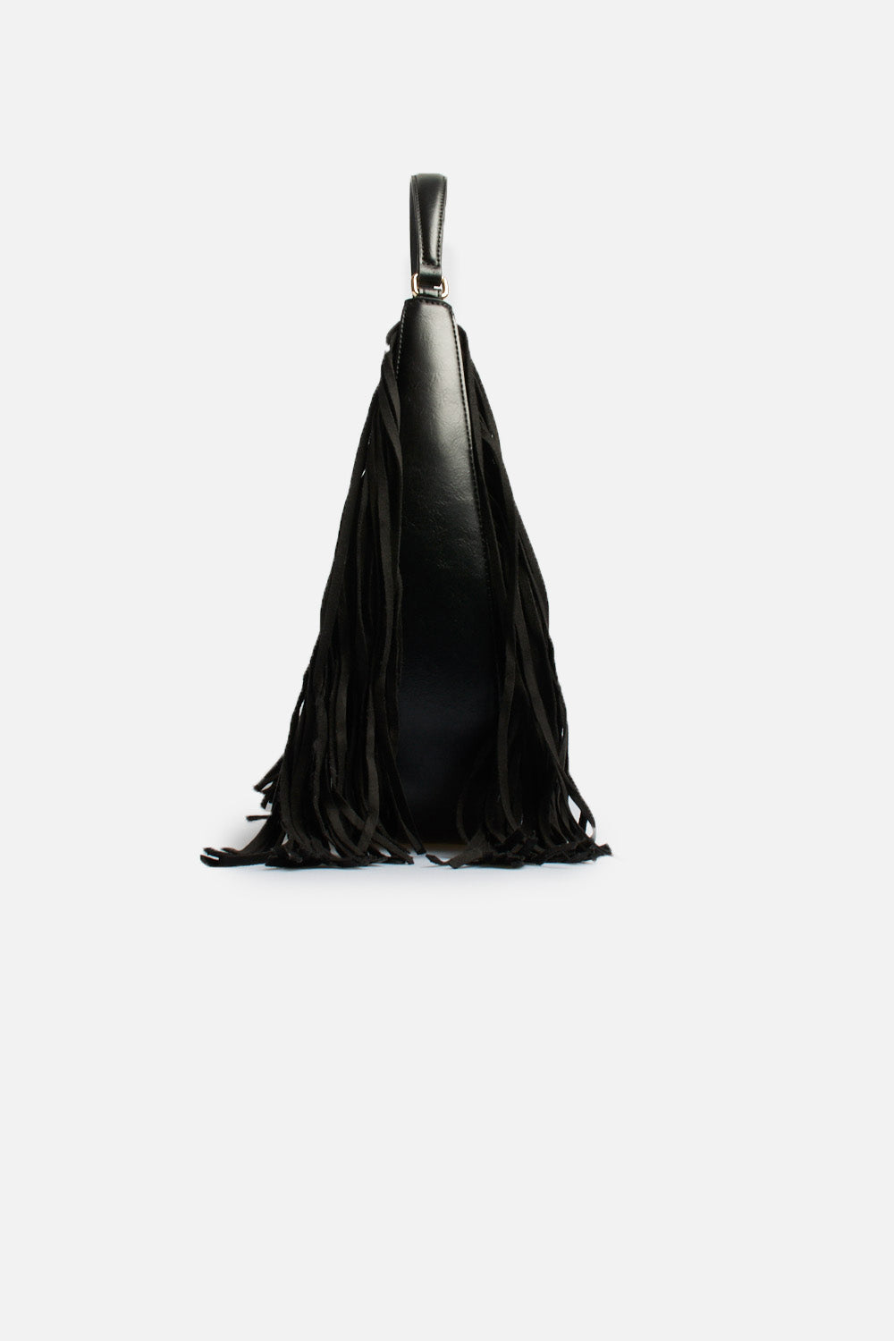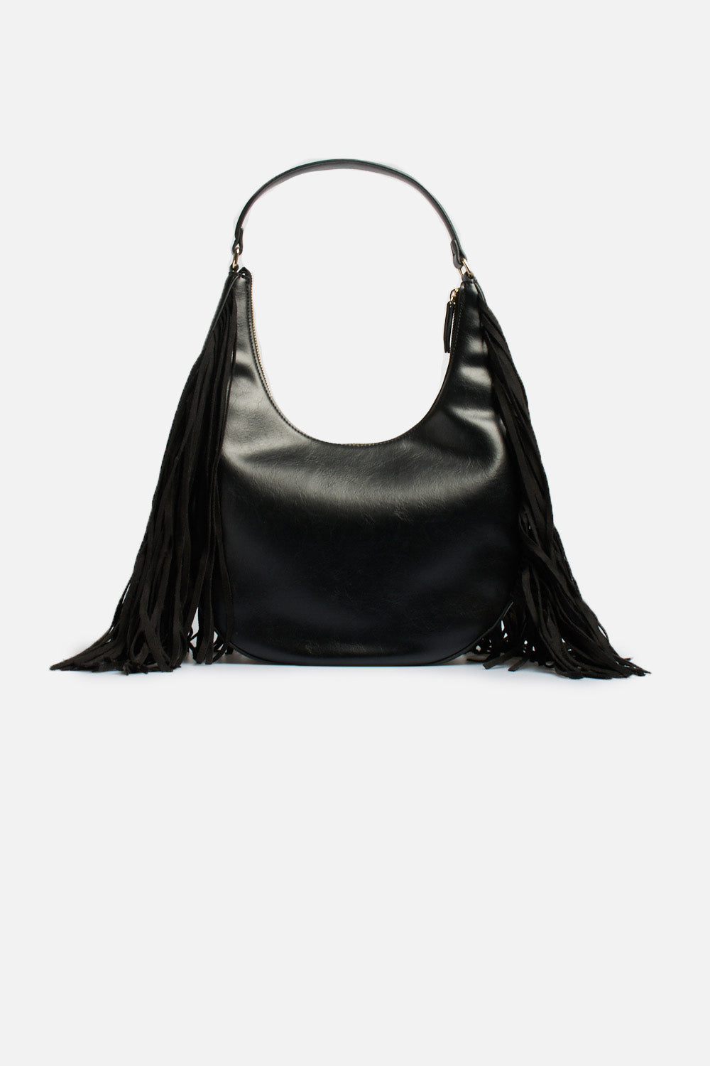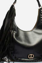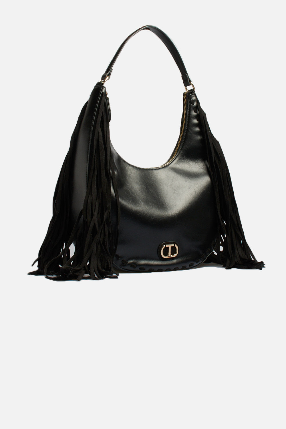 Twinset hobo bag in smooth leather-effect material, featuring maxi side fringes, top zip closure, front Oval T logo in gold metal and woven details along the bottom. Single wide handle allows it to be worn comfortably on the shoulder.