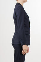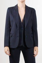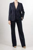Vicolo single-breasted blazer with micro pinstripes, notched lapels, two-button front closure, and flap pockets. Wear with matching trousers and a waistcoat for an elegant and modern ensemble.