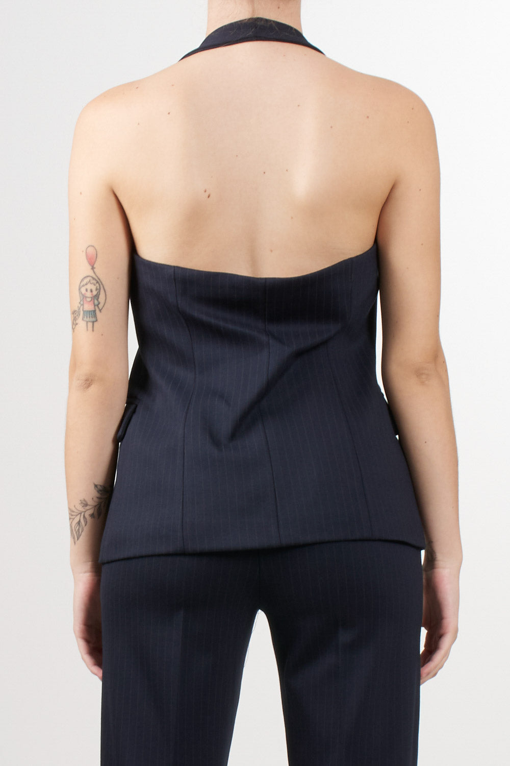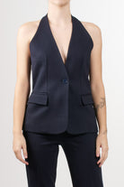 Vicolo vest with a deep halterneck, featuring a fitted silhouette and a single front button closure, a tonal pinstripe pattern, and flap pockets. Perfect for pairing with the matching trousers and jacket for a sophisticated ensemble.