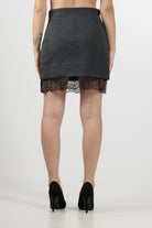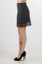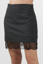 Straight-cut mini skirt by Vicolo, made of compact fabric with a micro-check pattern, bottom edge finished with an elegant floral lace insert.