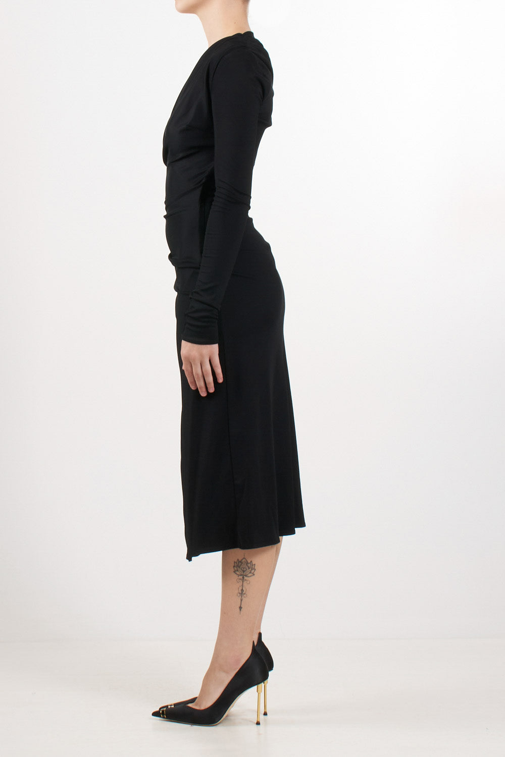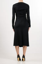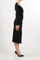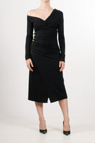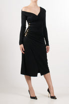 Stretch jersey midi dress with a fitted and sophisticated fit. Long sleeves, an asymmetrical neckline that creates a one-shoulder effect, a slit at the hem, and side draping, held in place by gold metal buttons with the logo, accentuate the waist and create a sculpted silhouette.