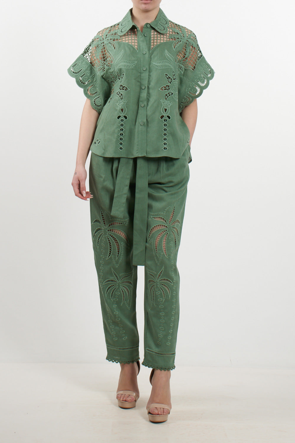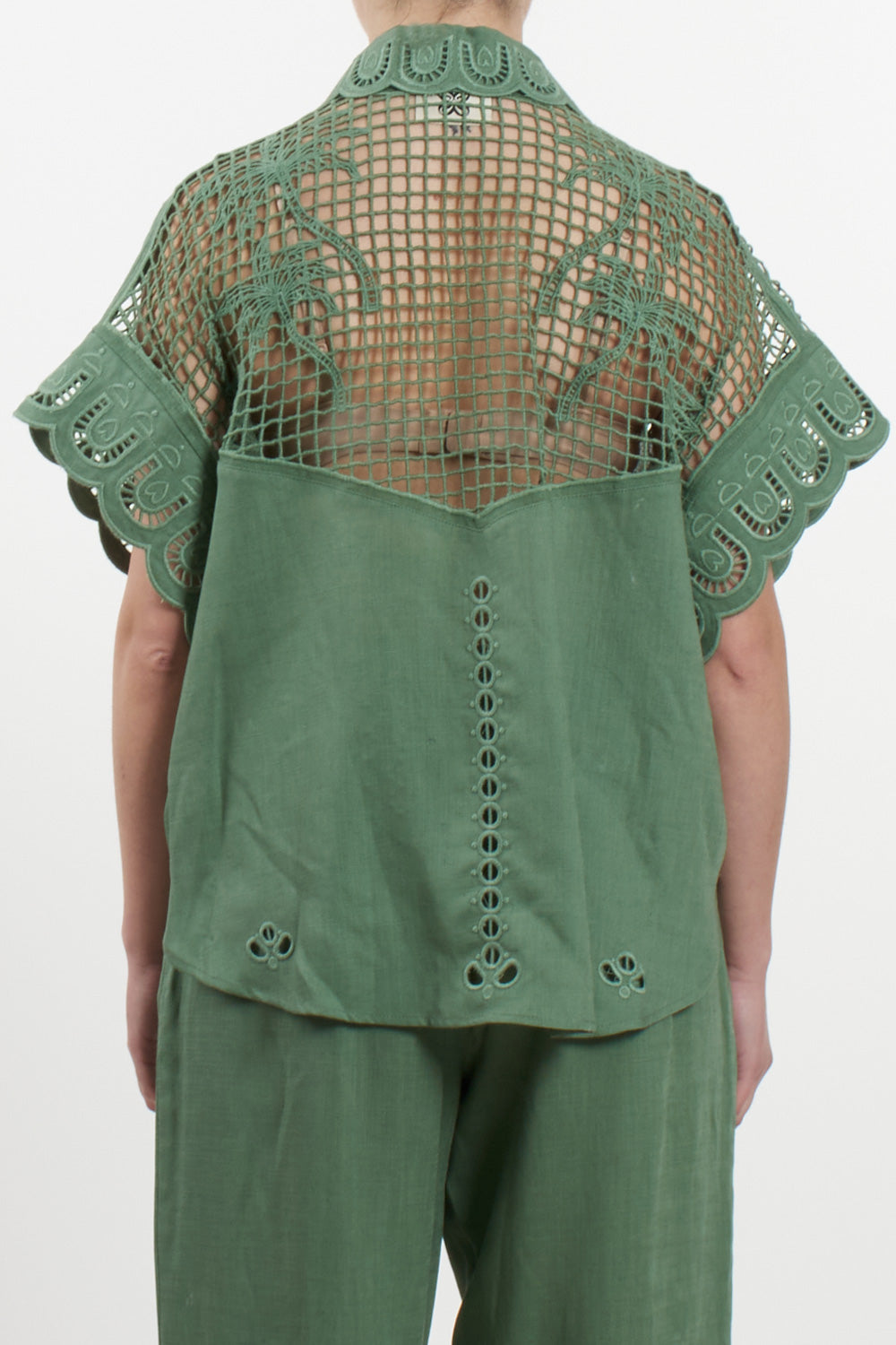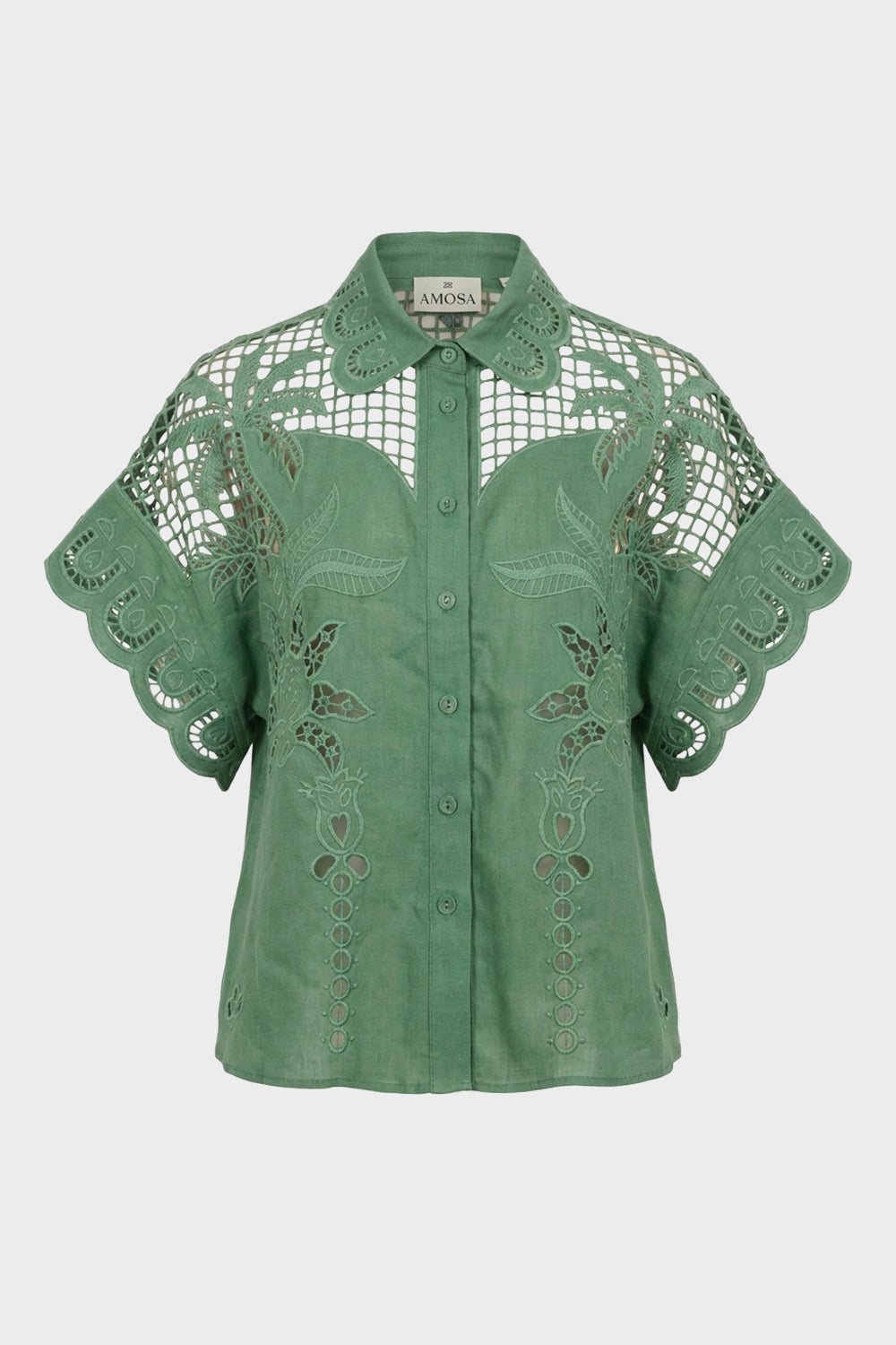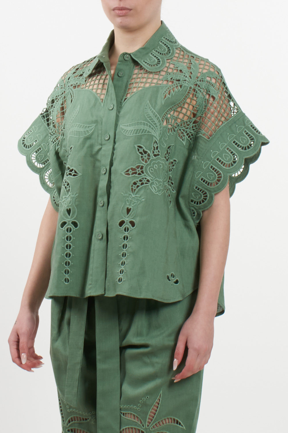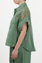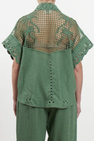 Short-sleeved shirt by Amosa, featuring a refined design that combines a classic style with the preciousness of artisanal details. The garment is made from a sustainable blend of 60% Lyocell and 40% Linen, ensuring freshness and a soft texture against the skin. The uniqueness of the shirt lies in the elaborate cut-out embroidery, with floral and geometric motifs, adorning the shoulders, yoke, and sleeves. It features a classic collar, a front closure with tone-on-tone buttons, and a straight cut that makes it perfect worn both closed or open as a light overshirt. The sage green hue evokes a natural and elegant aesthetic, ideal for the summer season.