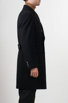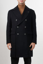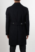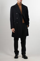 Long double-breasted coat crafted from fine wool and cashmere, with a refined, tailored fit. It features classic lapels, a six-button front closure, flap pockets, and a logo pin on the lapel. An iconic piece of contemporary men's style, perfect for formal occasions and timeless elegance.