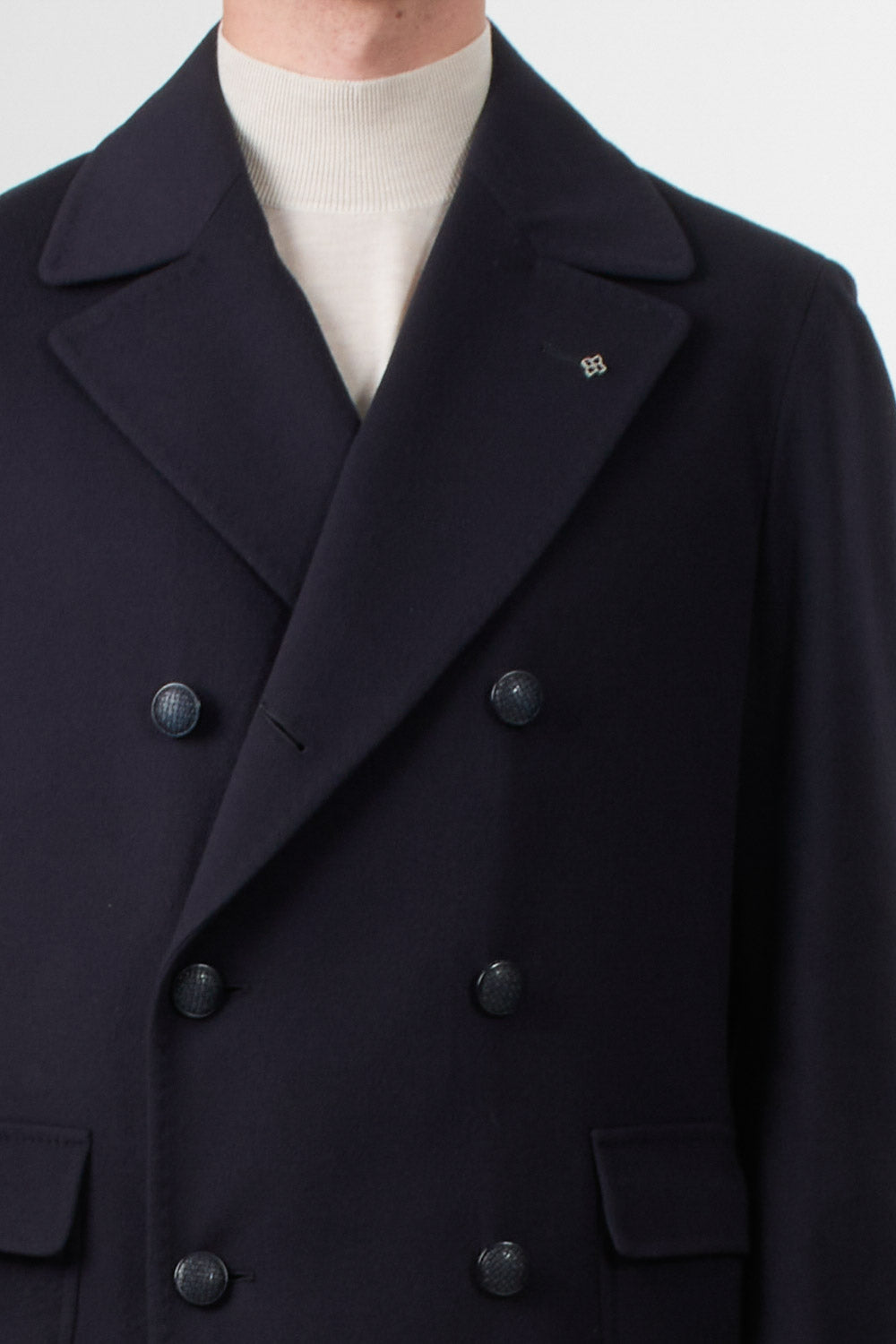 Long double-breasted coat crafted from fine wool, with a refined, tailored fit. It features classic lapels, a six-button front closure, flap pockets, and a logo pin on the lapel. An iconic piece of contemporary men's style, perfect for formal occasions and timeless elegance.