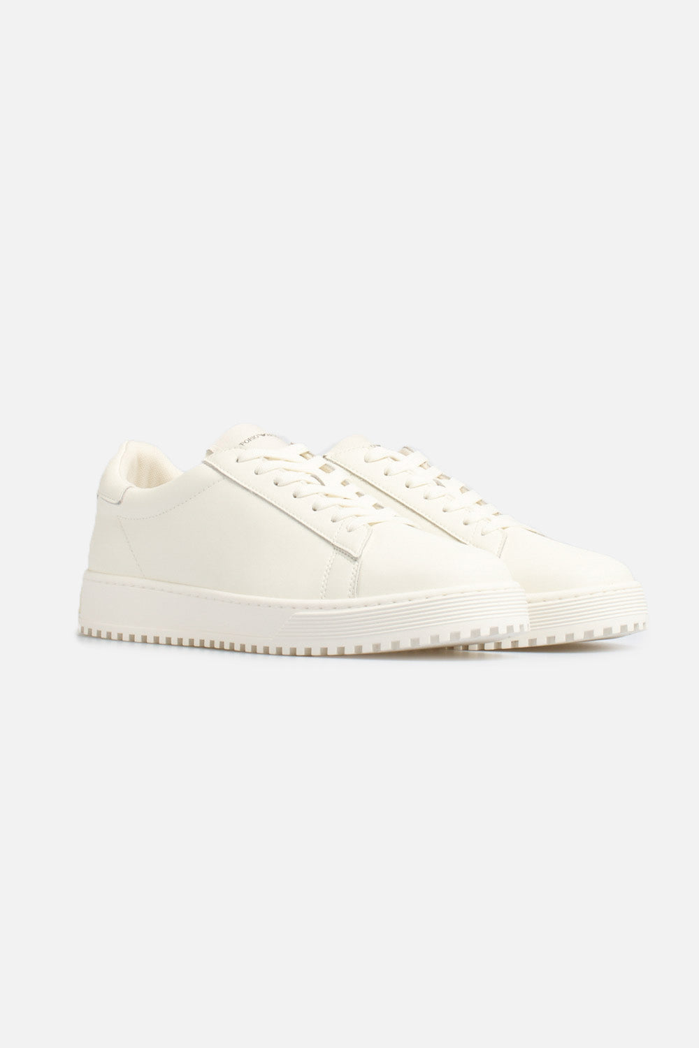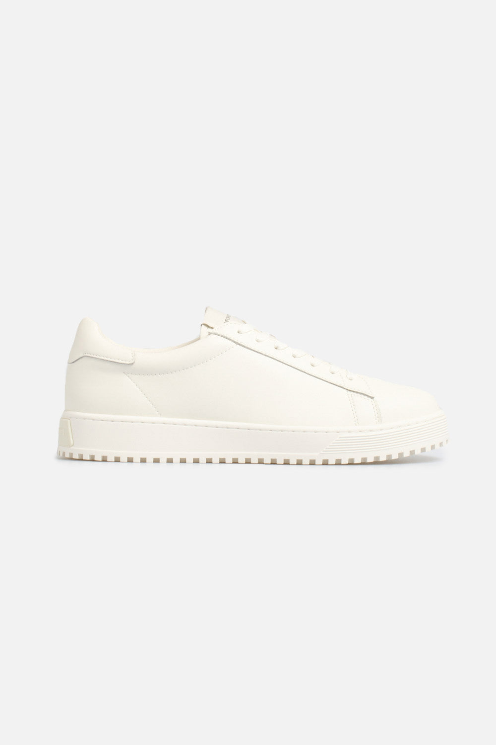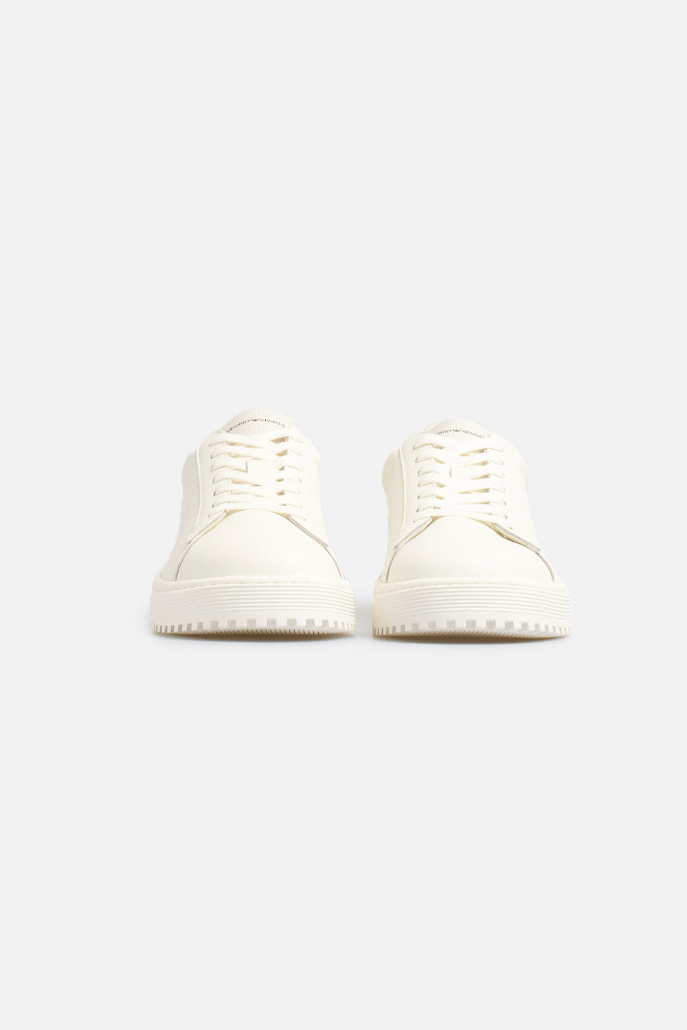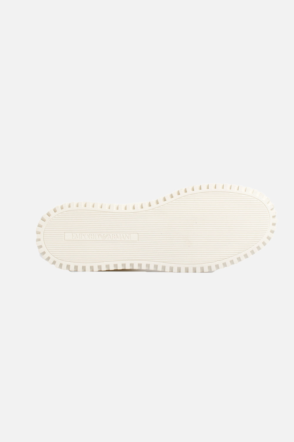 Leather sneaker by Emporio Armani with embossed logo on the back of the sole and featuring a serrated tread, upper with padding on the neck and ankle, lace-up fastening