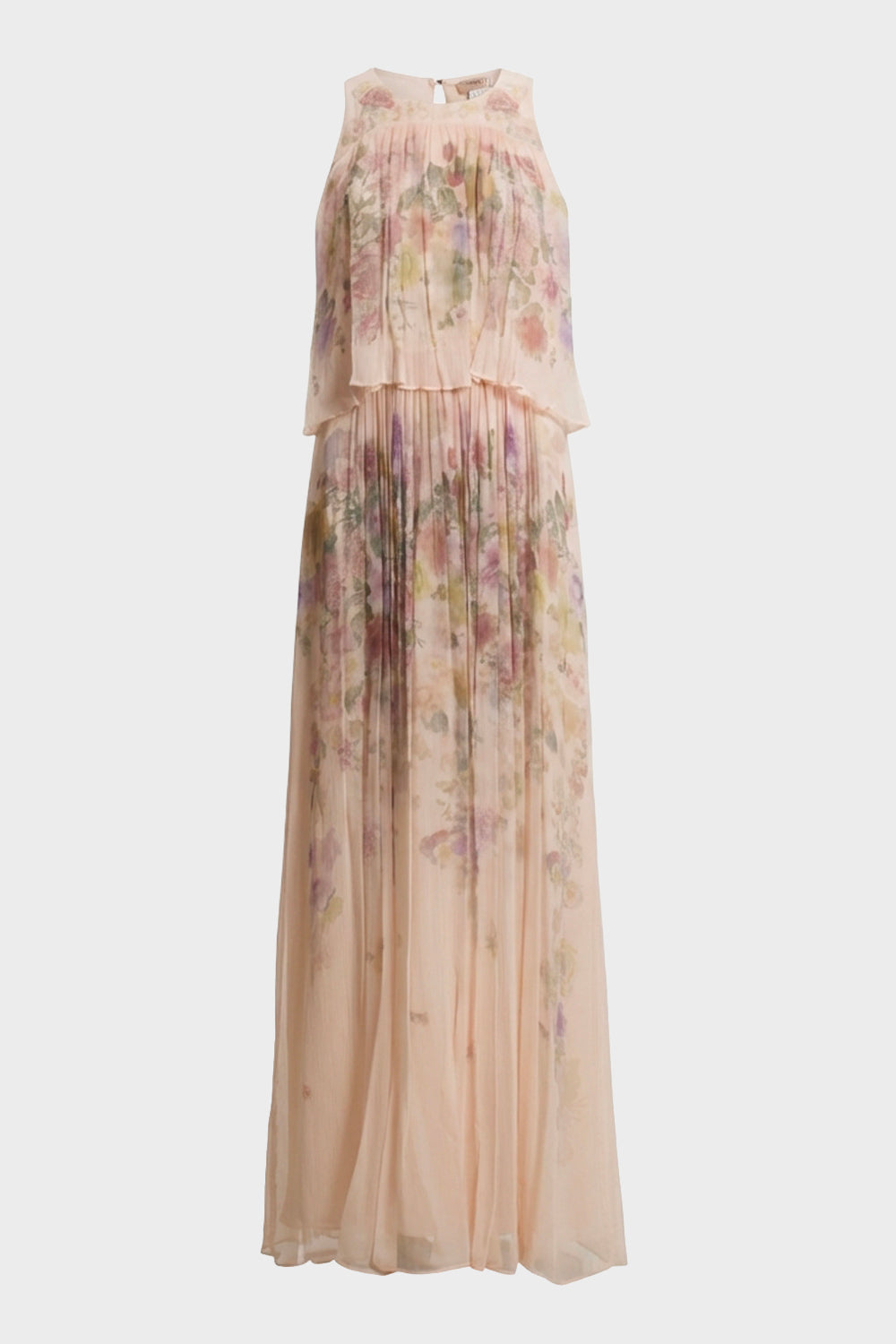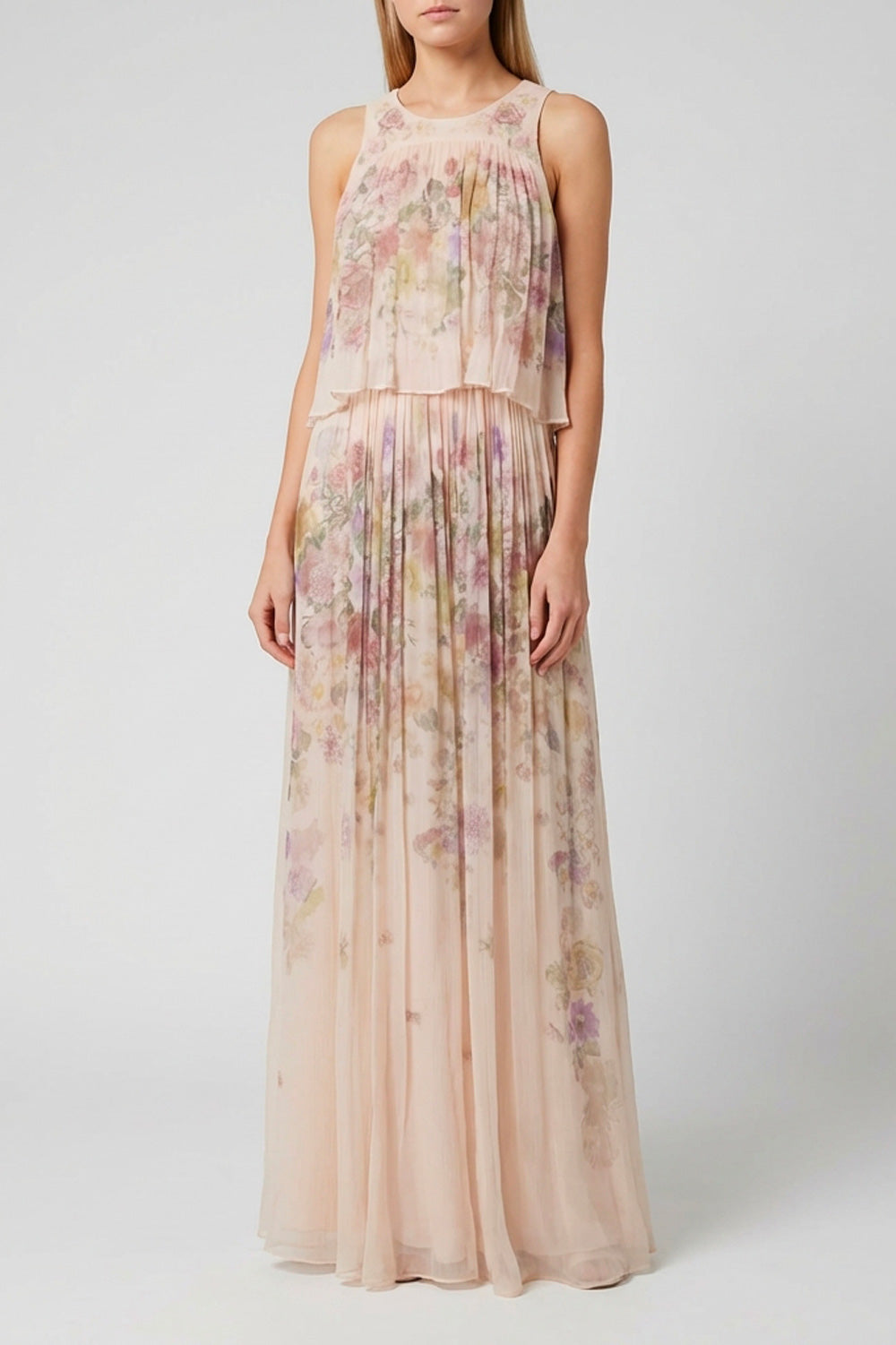 An enchanting long dress by Twinset, evoking an ethereal and sophisticated atmosphere. The style stands out for its simulated "two-piece" design, consisting of a lightly draped blouse top and a wide, flowing skirt that gracefully skims the feet. Made from exquisite viscose, the garment is entirely adorned with a romantic watercolor floral print in shades of pink, purple, and ochre on a blush background. The bodice features a refined round neckline at the front and a daring teardrop opening at the back, fastened with delicate buttons. The micro-pleating adds movement and an impalpable texture, making it the perfect dress for ceremonies and exclusive summer events.