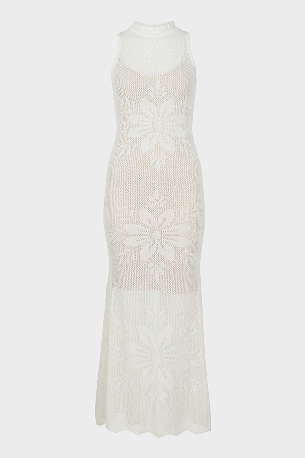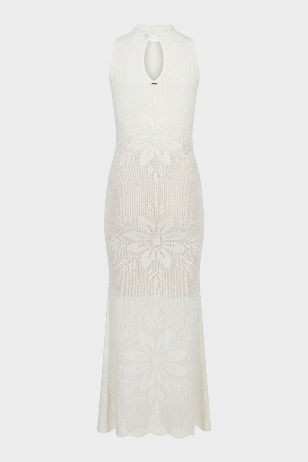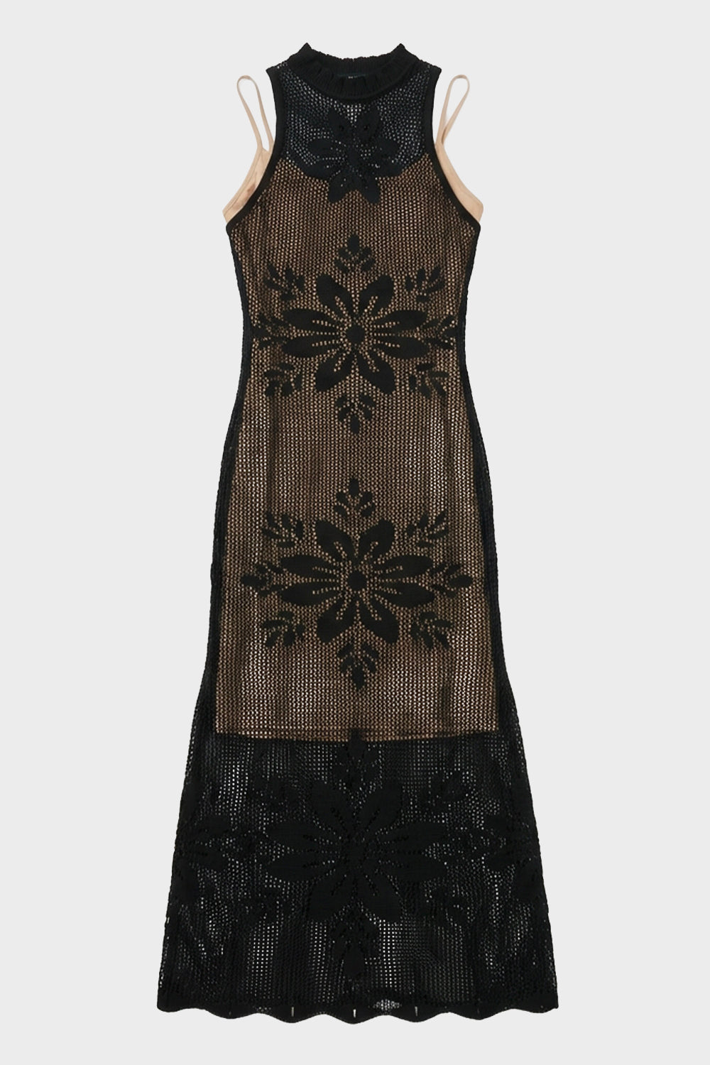 Details: Floral macramé lace inlay on neckline and back, sheer effects, fitted silhouette, midi length, finished edges