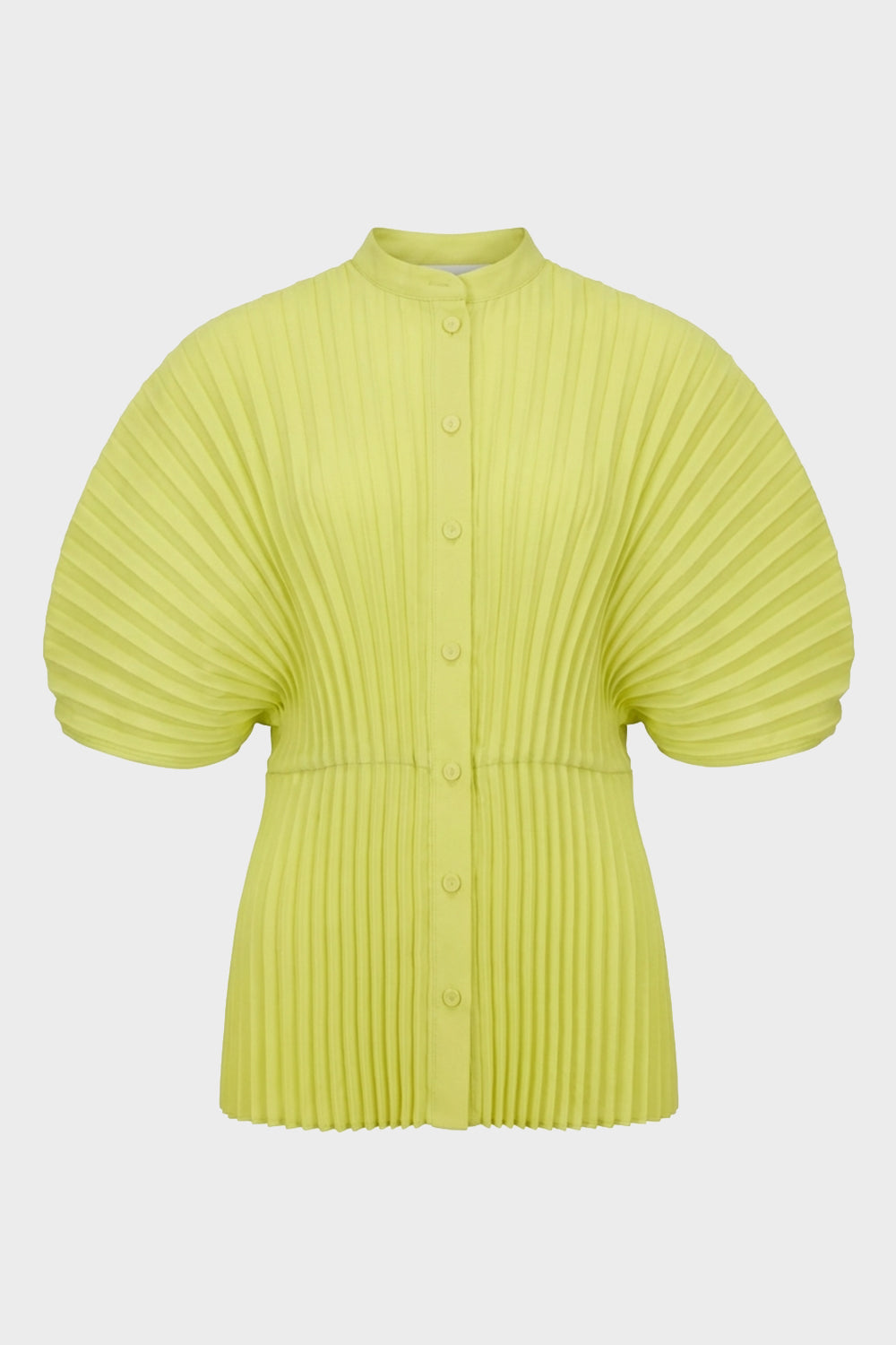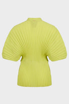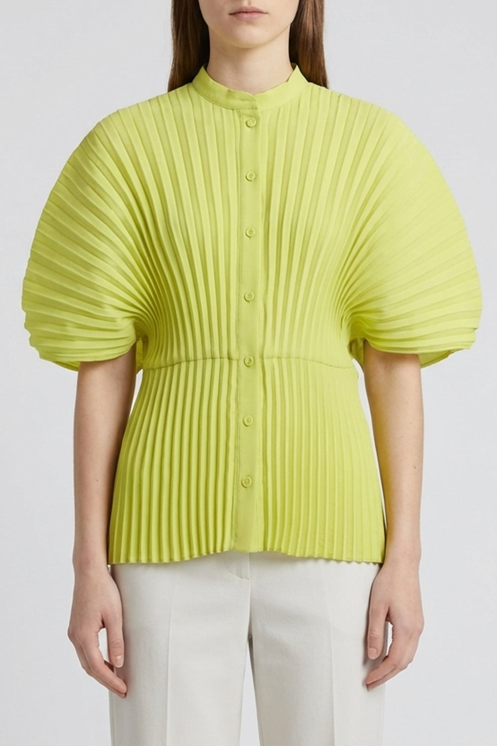This refined Twinset shirt stands out with its sculptural and contemporary design, perfect for those seeking a garment with a strong visual impact. Made in a vibrant lime yellow hue, it features an all-over vertical pleat treatment that adds volume and three-dimensionality to the silhouette. The highlight of the design is the spectacular wide balloon sleeves that create a dynamic play of shapes, balanced by a slightly cinched waist and a mandarin collar. A bold and elegant piece, ideal for elevating daytime outfits or for special summer events.