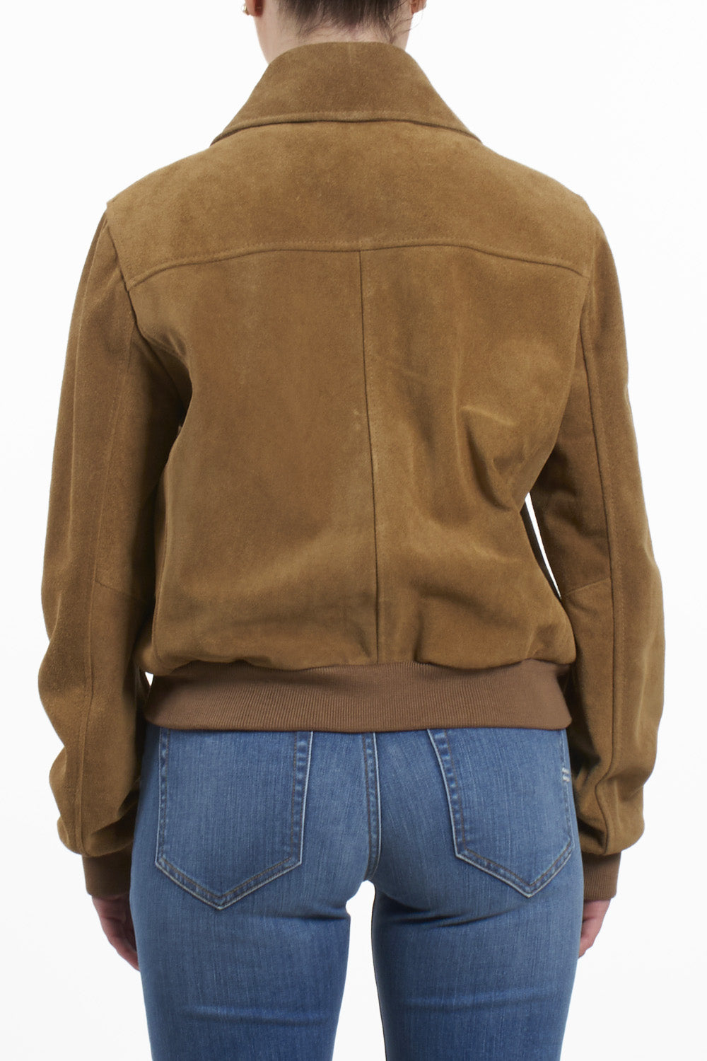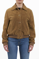 This Vicolo jacket in soft suede combines a retro aesthetic with a functional design. The model features a classic pointed collar and a front button closure, complemented by elastic ribbed knit cuffs and hem that define its bomber silhouette. The warm leather tone and velvety texture make it a versatile garment, perfect for adding character to spring looks.