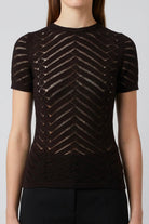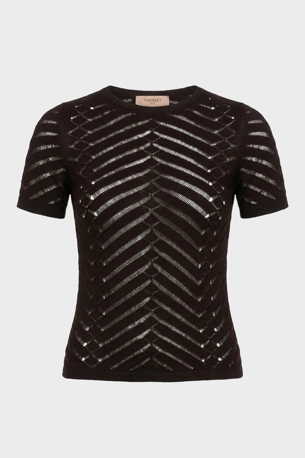 Refined short-sleeved knit top by Twinset, featuring sophisticated knitwork that plays with textures and transparencies. The garment stands out with its iconic chevron (zigzag) pattern created through an alternation of raised ribs and delicate openwork stitches, which create a dynamic and airy visual effect. The intense black hue and slim-fit silhouette make this garment a versatile and chic item, perfect to pair with high-waisted pieces for a contemporary look. The classic crew neck and flat ribbed trims complete the design with a touch of essential elegance.